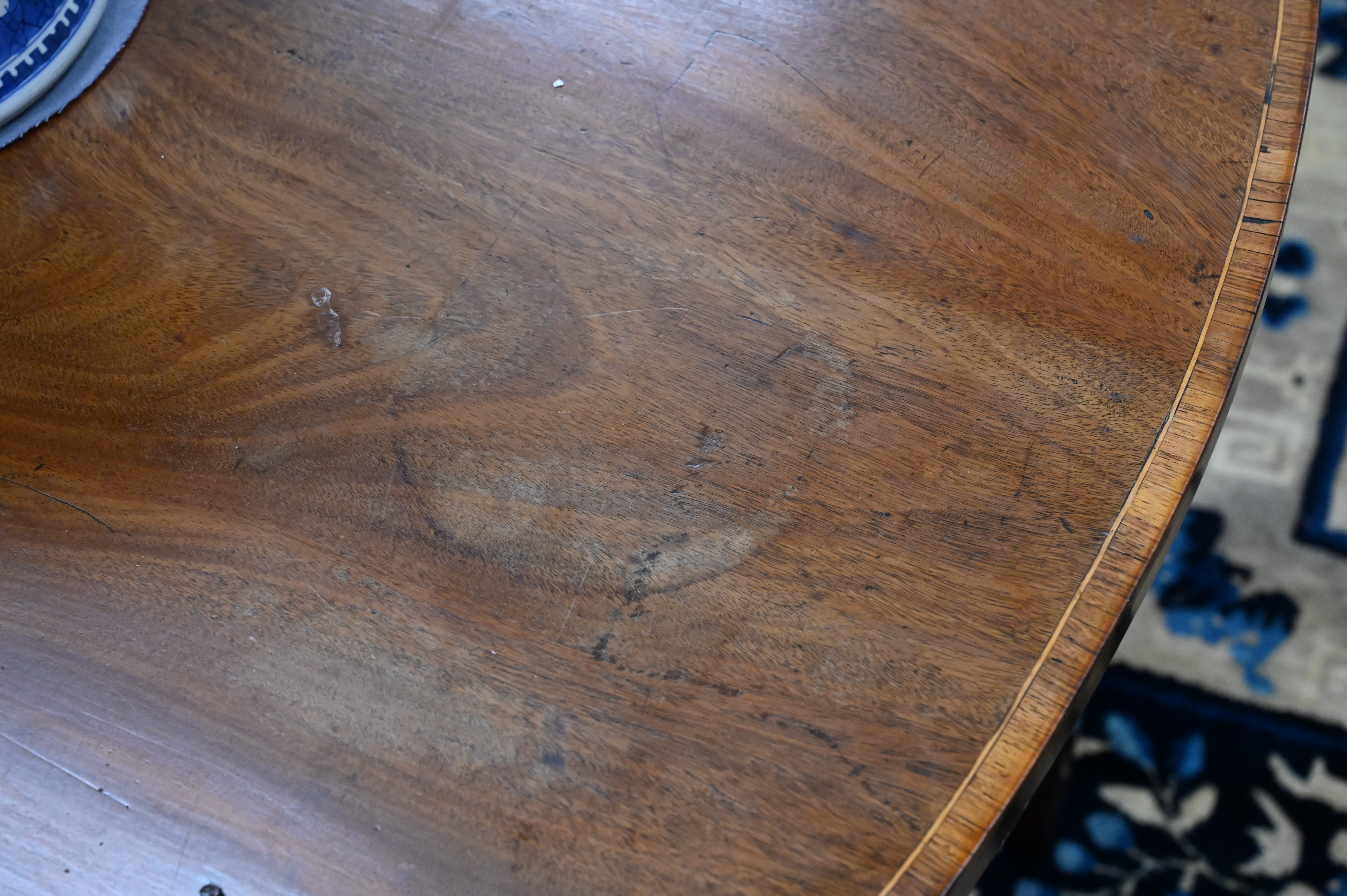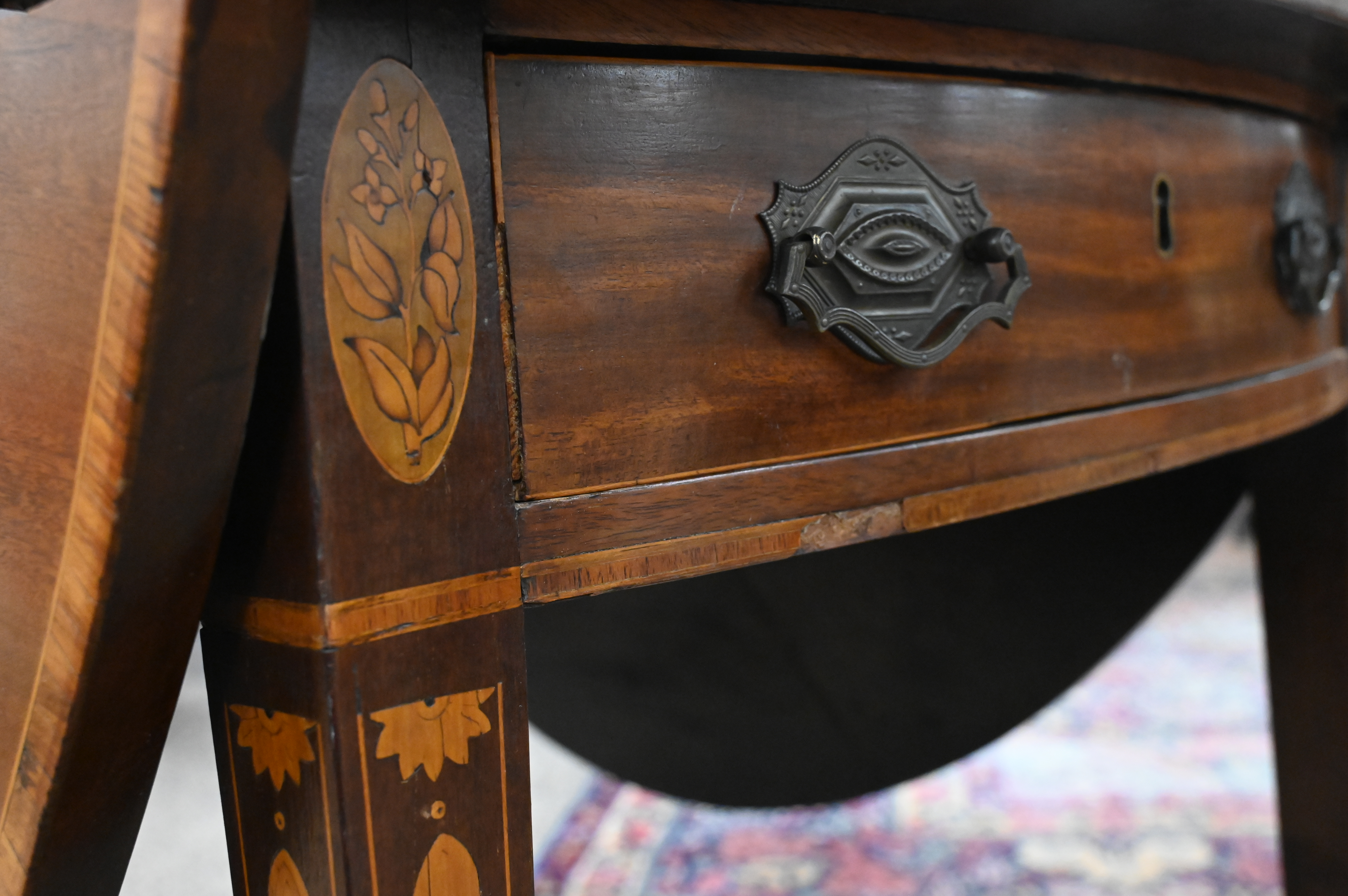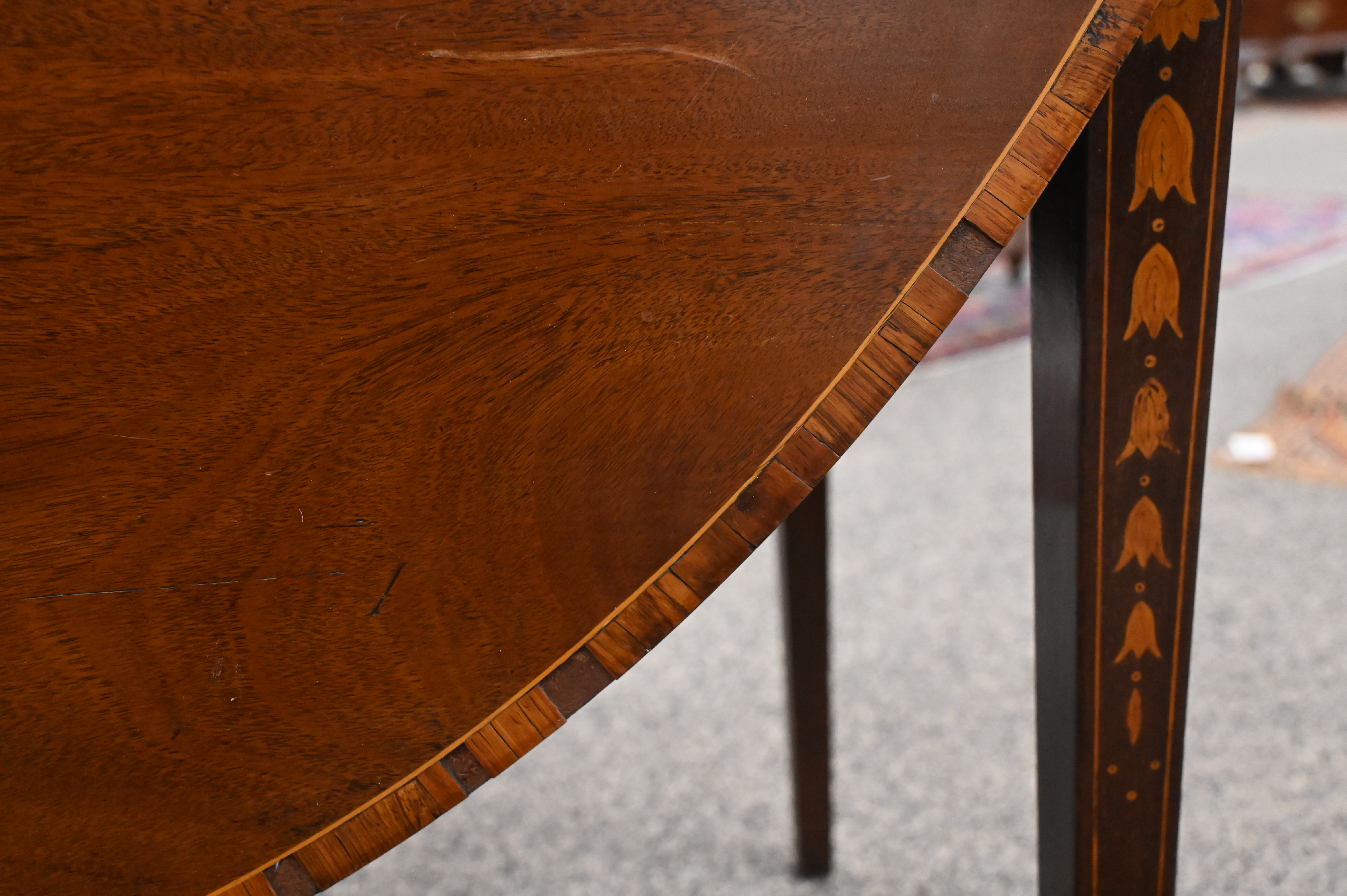Lot 554: George III Mahogany Pembroke Table, having oval drop leaf with bowed drawer, on square, tapered legs, inlaid with oval panels and bell flowers, circa 1800, hard pine group, hard pine group, stationary rails, and drawer linings, height 27 inches, top 48″ × 38″, Mabel Brady Garvan Collection. Provenance: Jacob Margolis (born Russia, probably 1875), New York; consigned to American Art Association, Inc., New York, November 5–6, 1926, lot 233; sold to Francis P. Garvan (1875–1937), New York; gift to Yale University Art Gallery, New Haven, Conn., 1930.