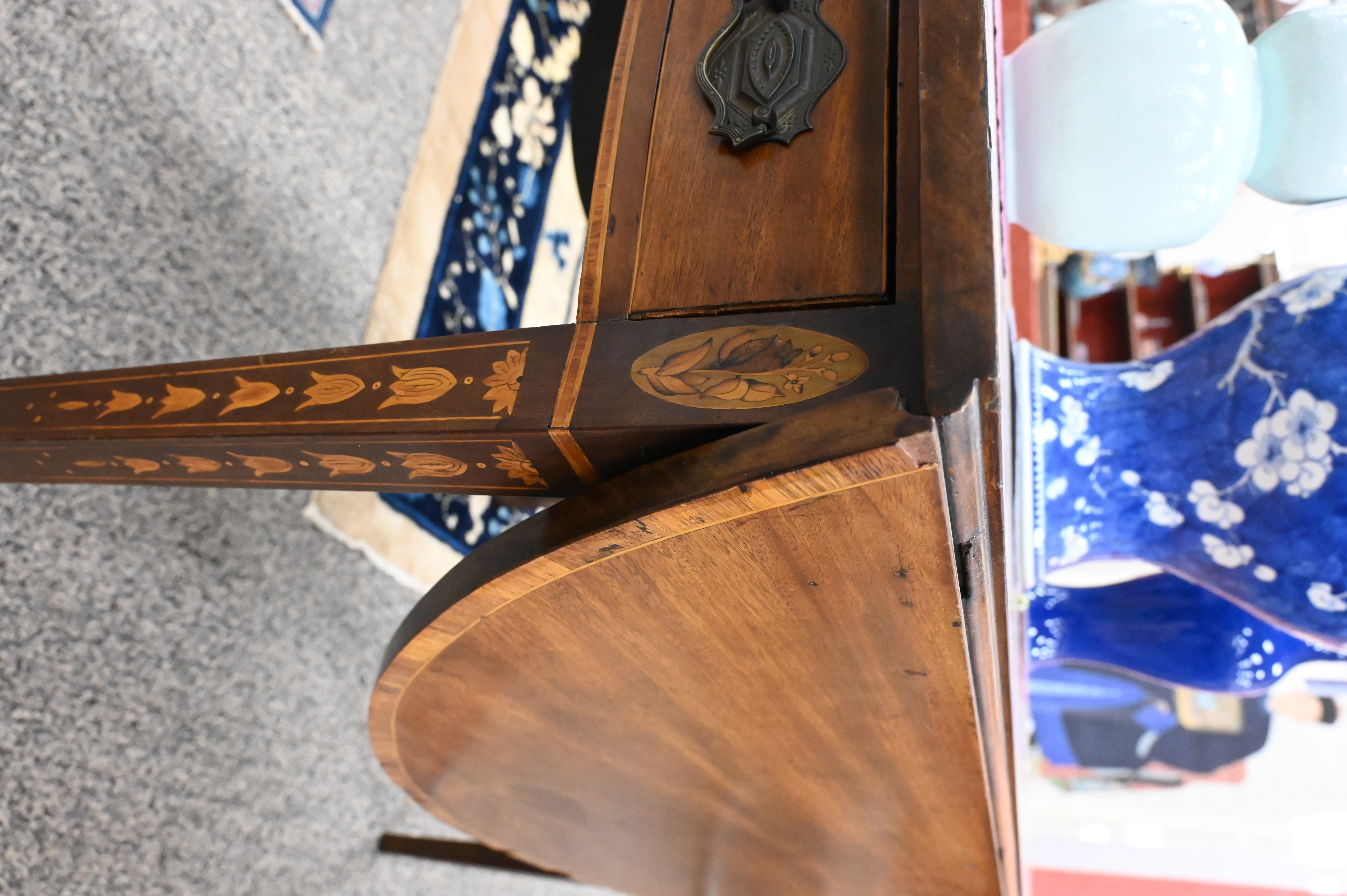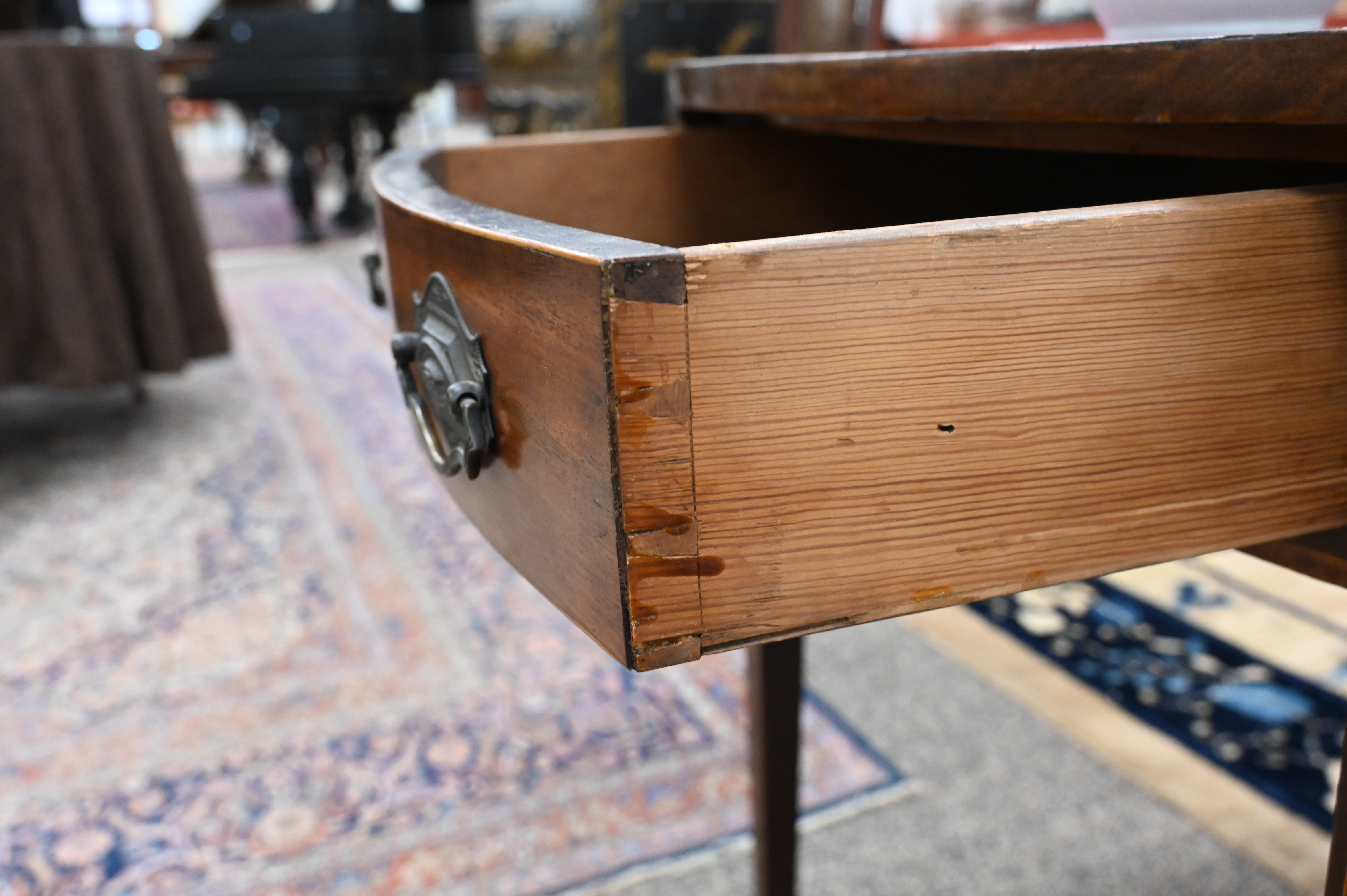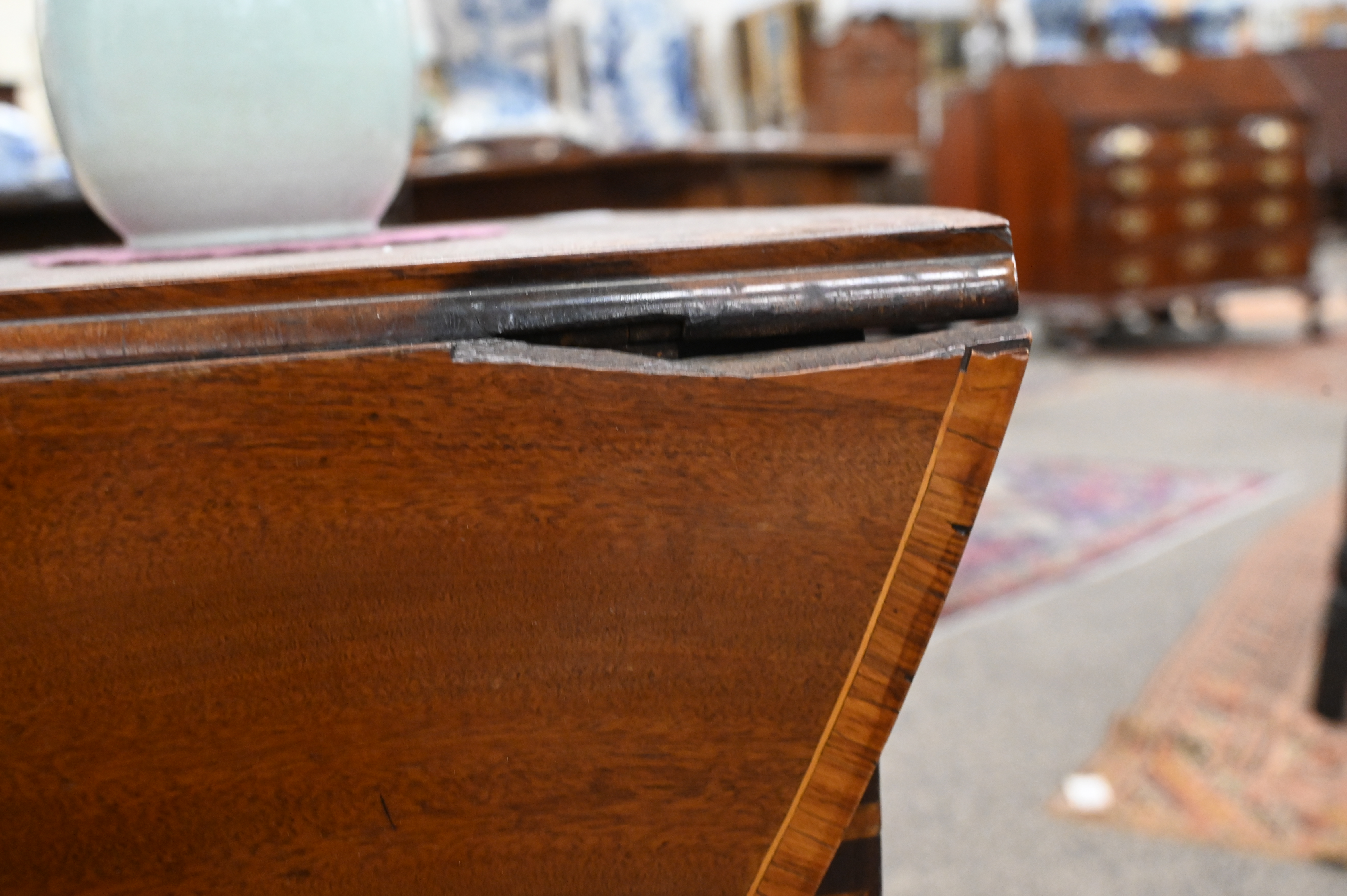 Lot 554: George III Mahogany Pembroke Table, having oval drop leaf with bowed drawer, on square, tapered legs, inlaid with oval panels and bell flowers, circa 1800, hard pine group, hard pine group, stationary rails, and drawer linings, height 27 inches, top 48″ × 38″, Mabel Brady Garvan Collection. Provenance: Jacob Margolis (born Russia, probably 1875), New York; consigned to American Art Association, Inc., New York, November 5–6, 1926, lot 233; sold to Francis P. Garvan (1875–1937), New York; gift to Yale University Art Gallery, New Haven, Conn., 1930.