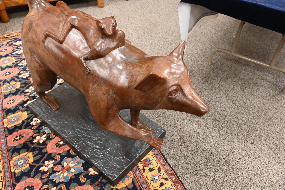 Lot 554: Large Bronze Sculpture, Lemur carrying its young on her back, Metropolitan Galleries copy, height 60 inches, length 44 inches, width…