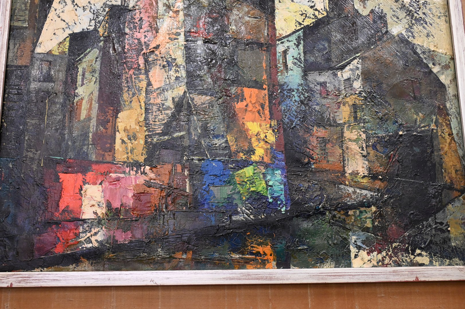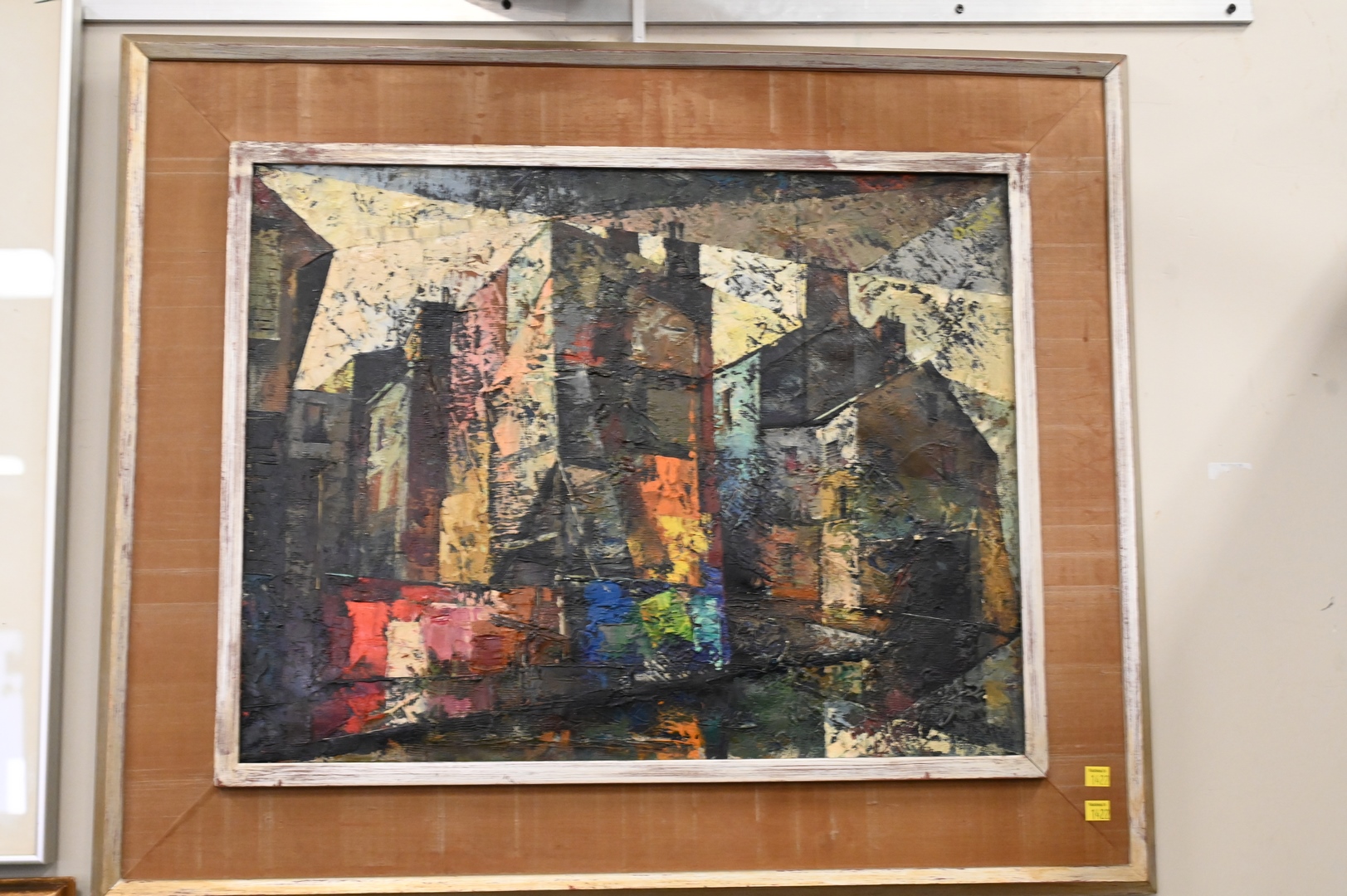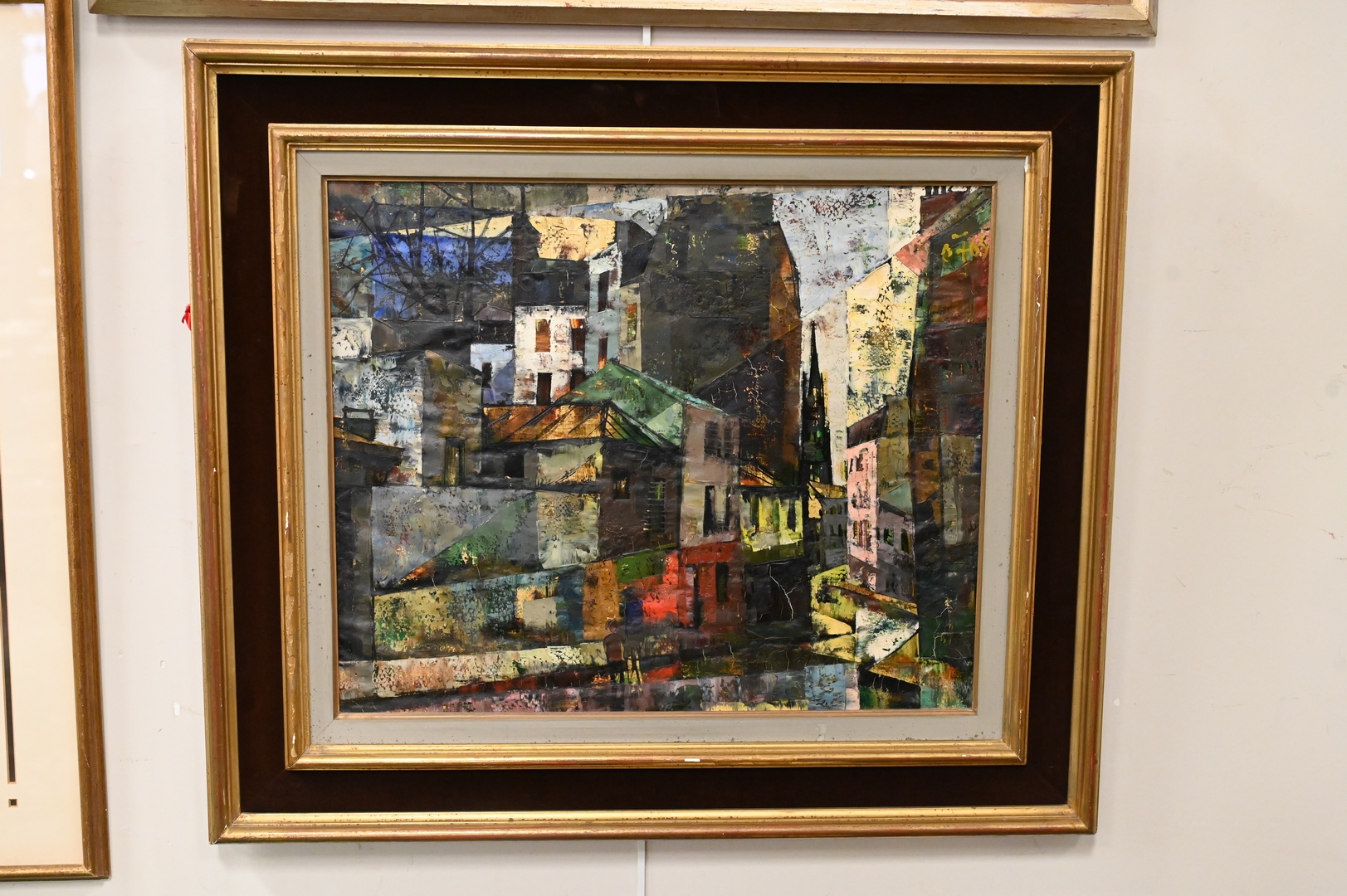 Pair Oliver Foss (1920-2014) Oil on Canvas, both abstract landscapes with houses, signed “O.Foss” top right, 18 1/4″ x 22 3/4″.