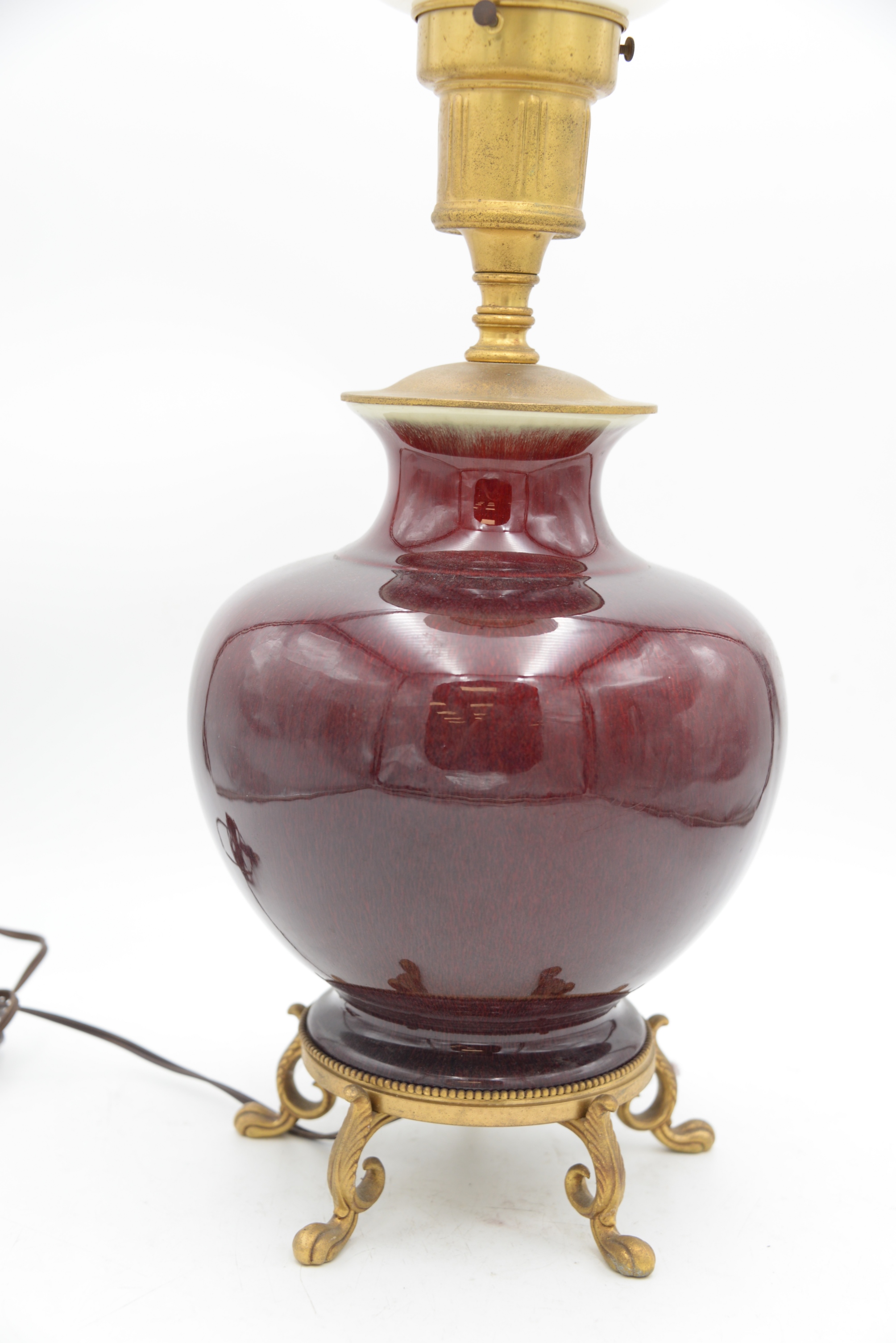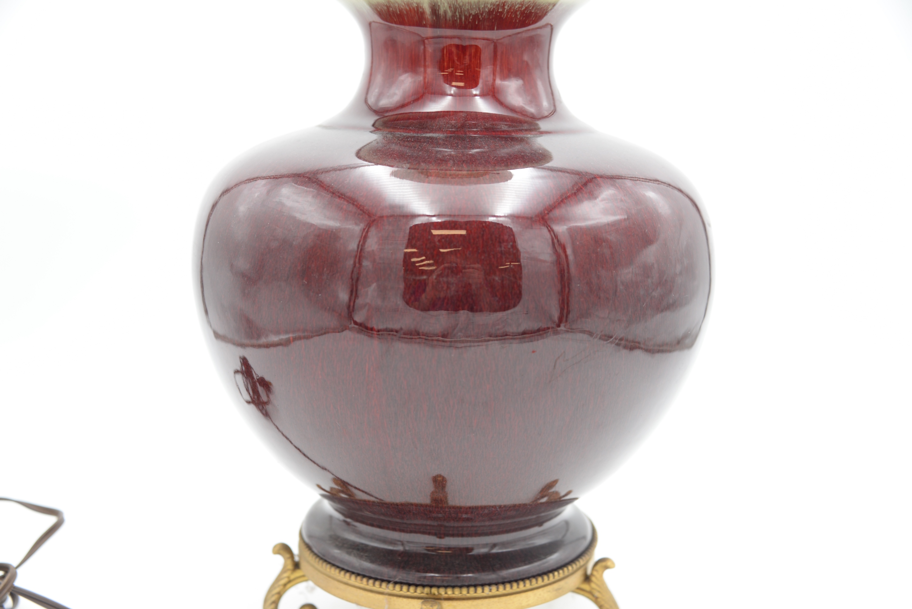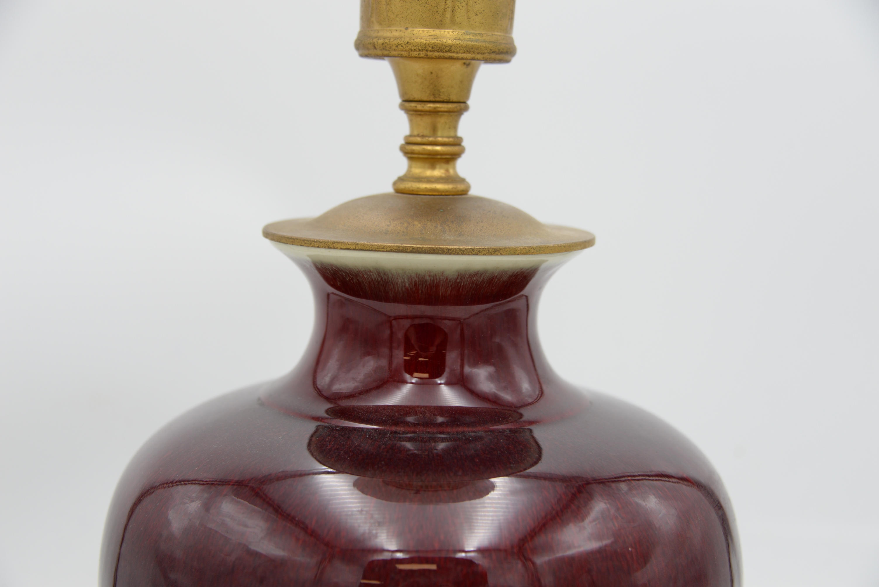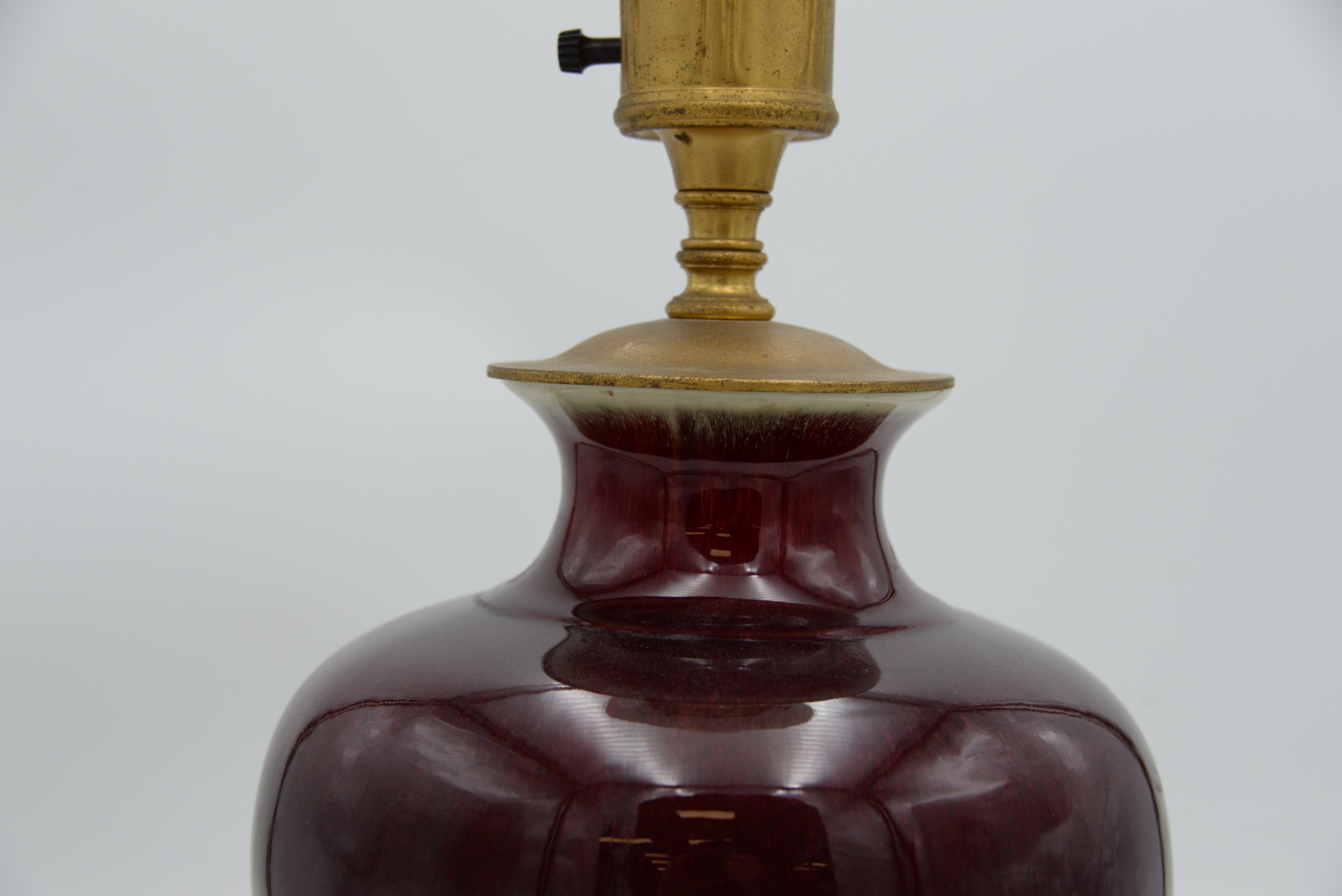 Chinese Sang de Boeuf Porcelain Vase, having globular form with oxblood body tapering into white flared rim, made into a table lamp, height 14 1/2 inches.