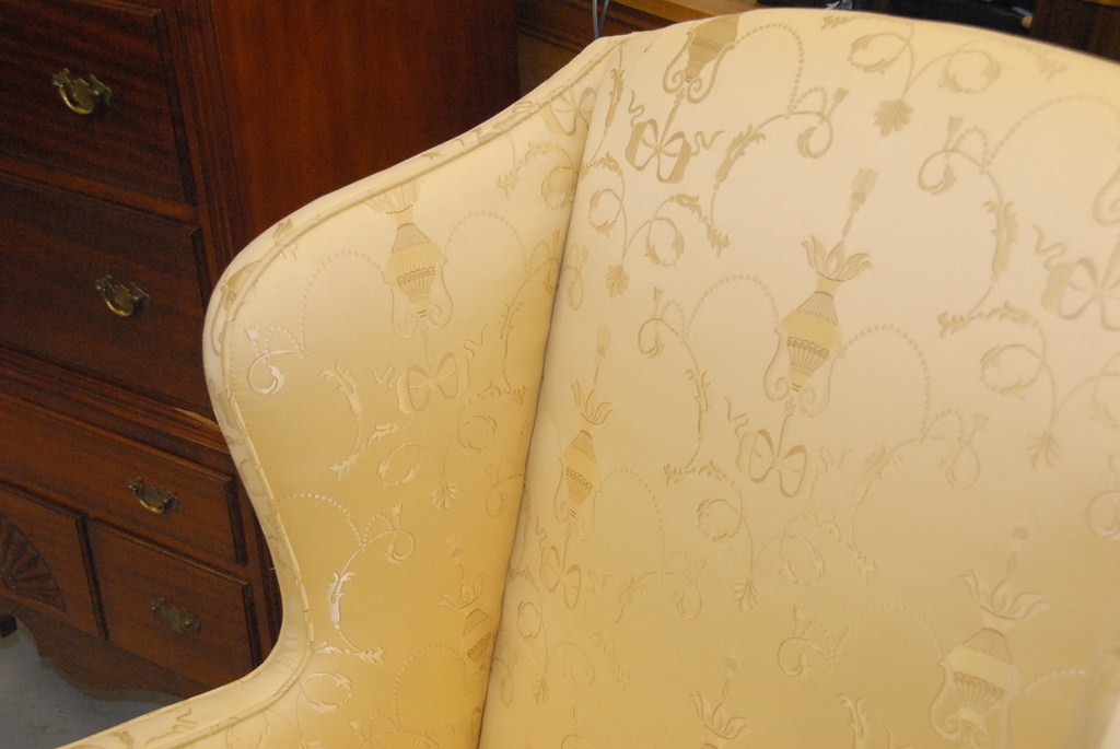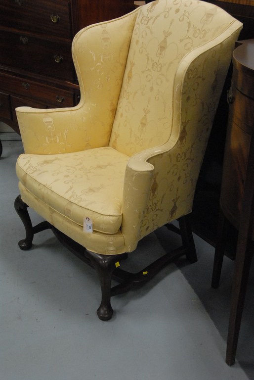 Lot 555: Custom mahogany Queen Anne style wing chair in gold silk upholstery with loose seat cushion on cabriole legs, pad feet, and flat str…