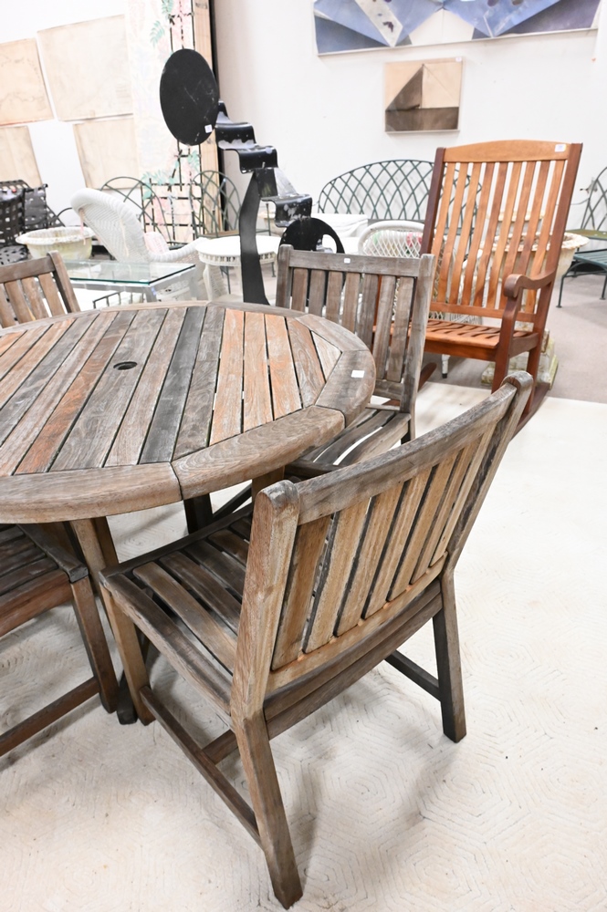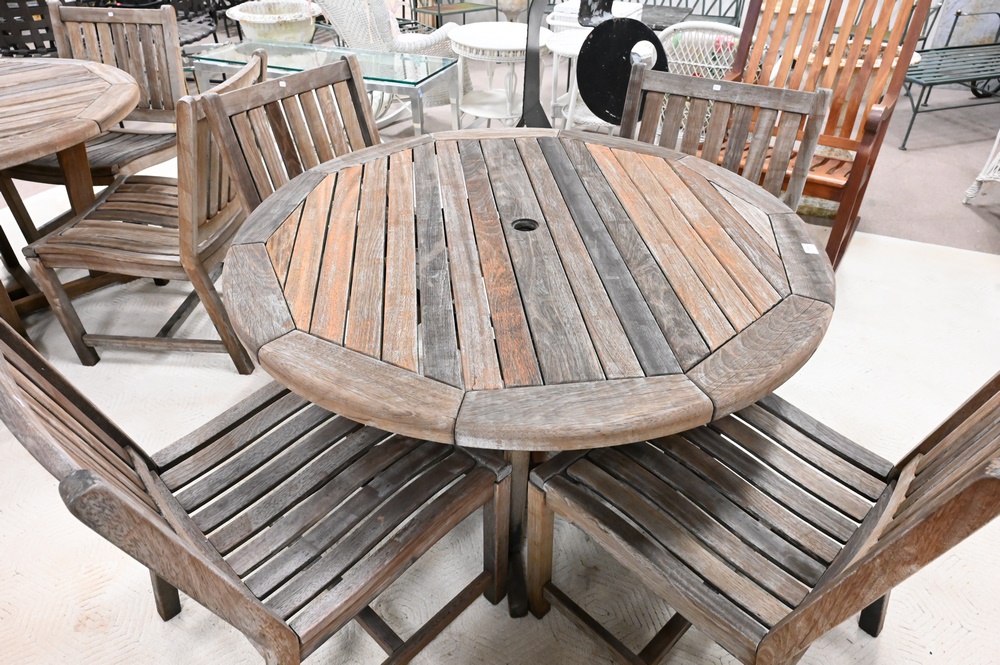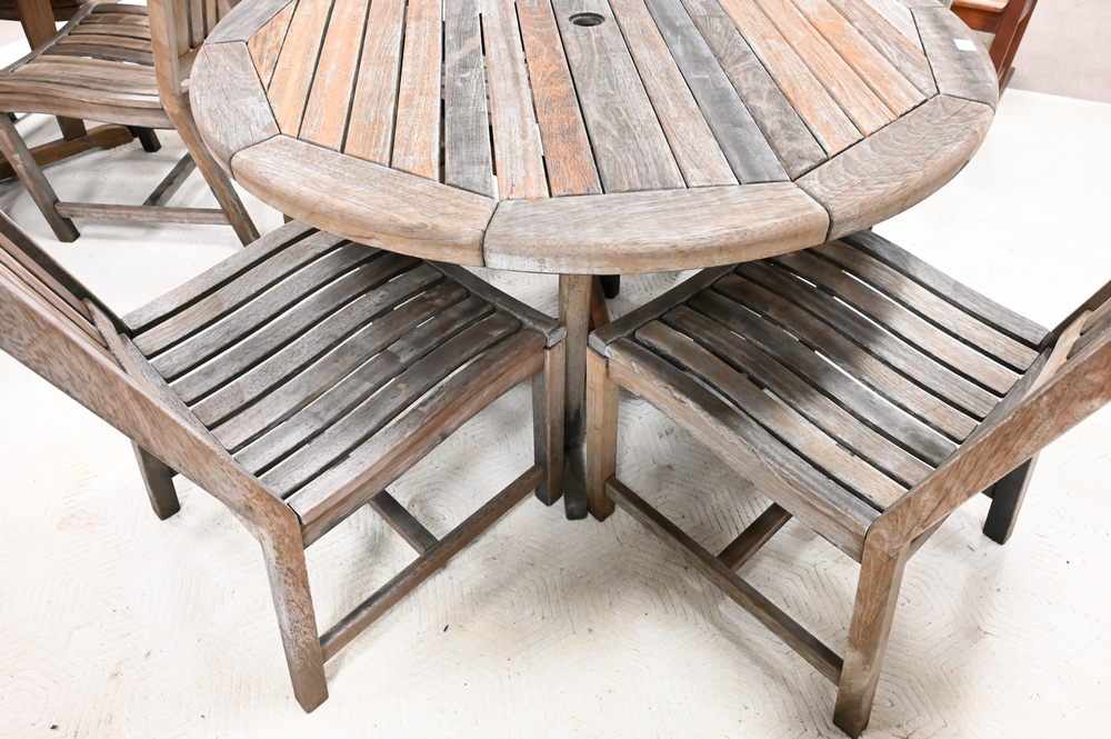 Lot 555: New River Brazilian Cherry Five Piece Outdoor Set, to include a table, (top with small imperfection), height 29 1/2 inches, diameter 48 inches; and four chairs.