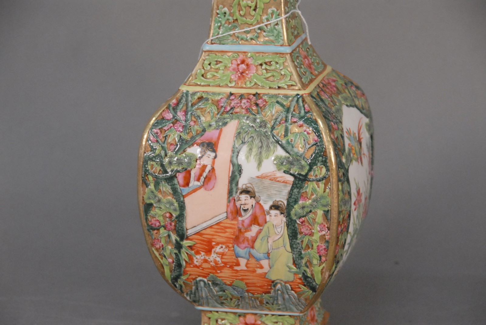 Unusual rose mandarin rectangular bottle vase with raised/carved floral and gold decoration bordering figural panels, 19th century.