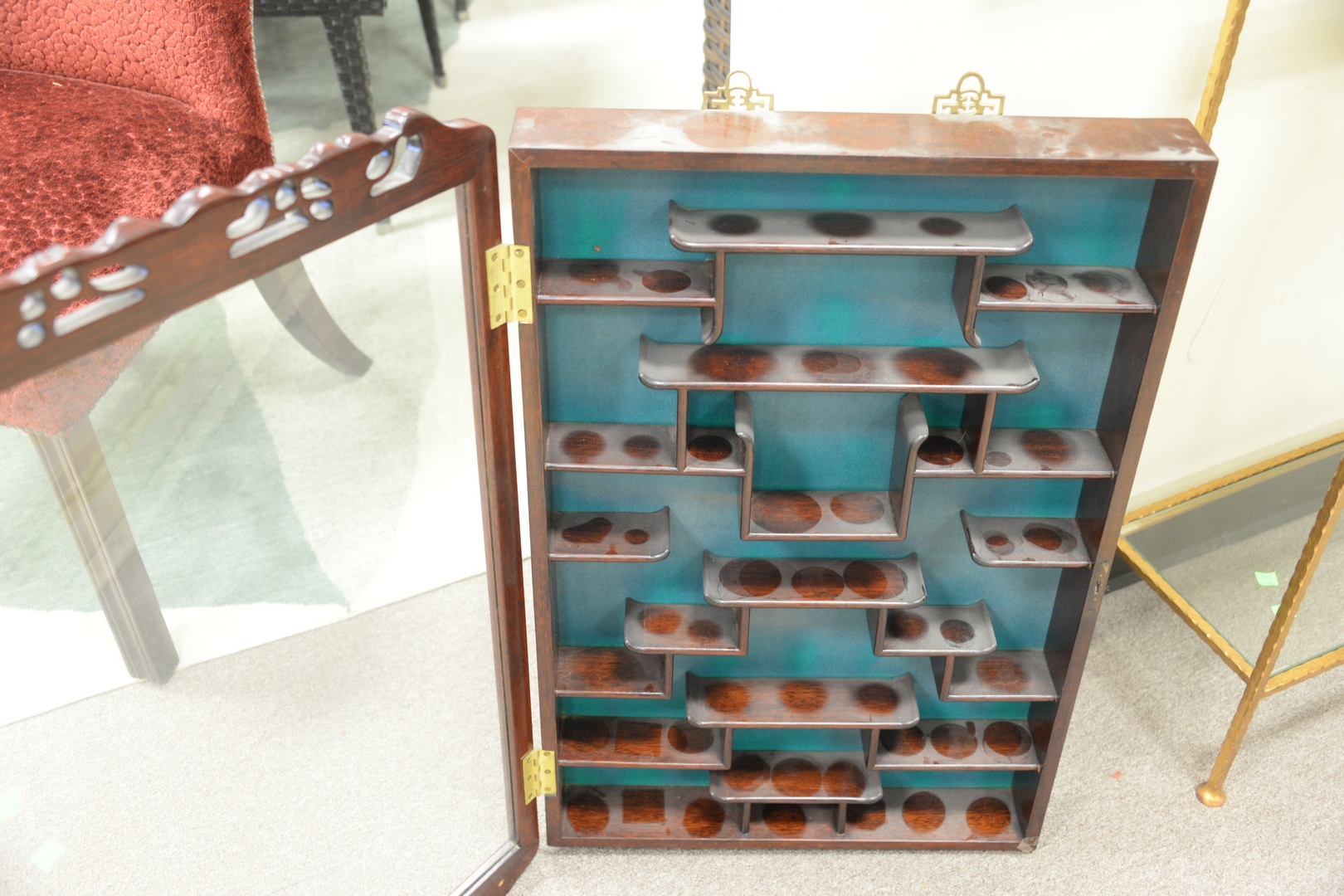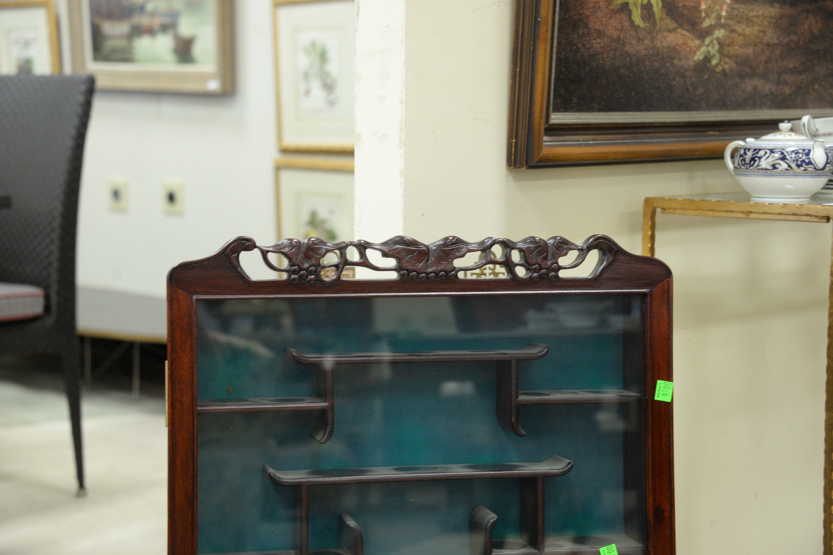 Lot 556: Chinese Hardwood Wall Curio Cabinet, height 32 inches, width 20 inches, depth 4 inches. Provenance: Estate of James Wadhams
