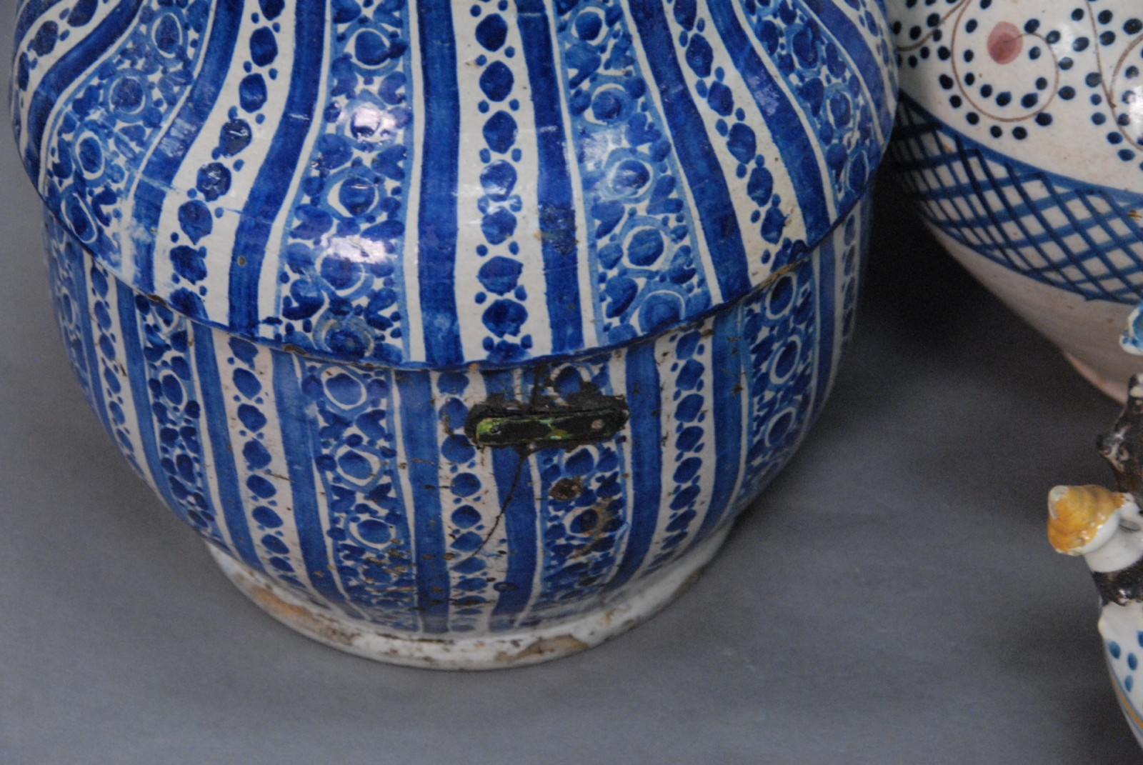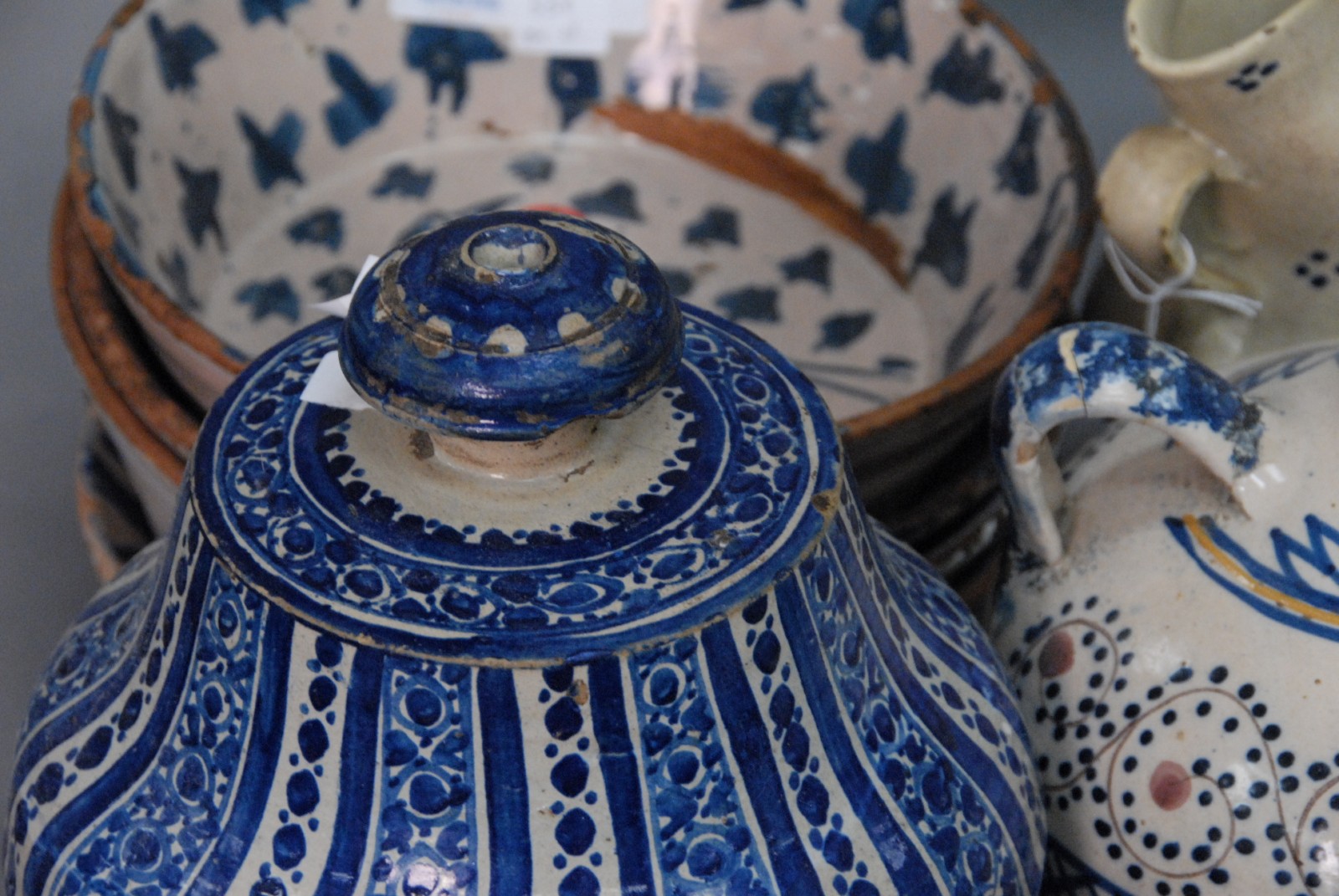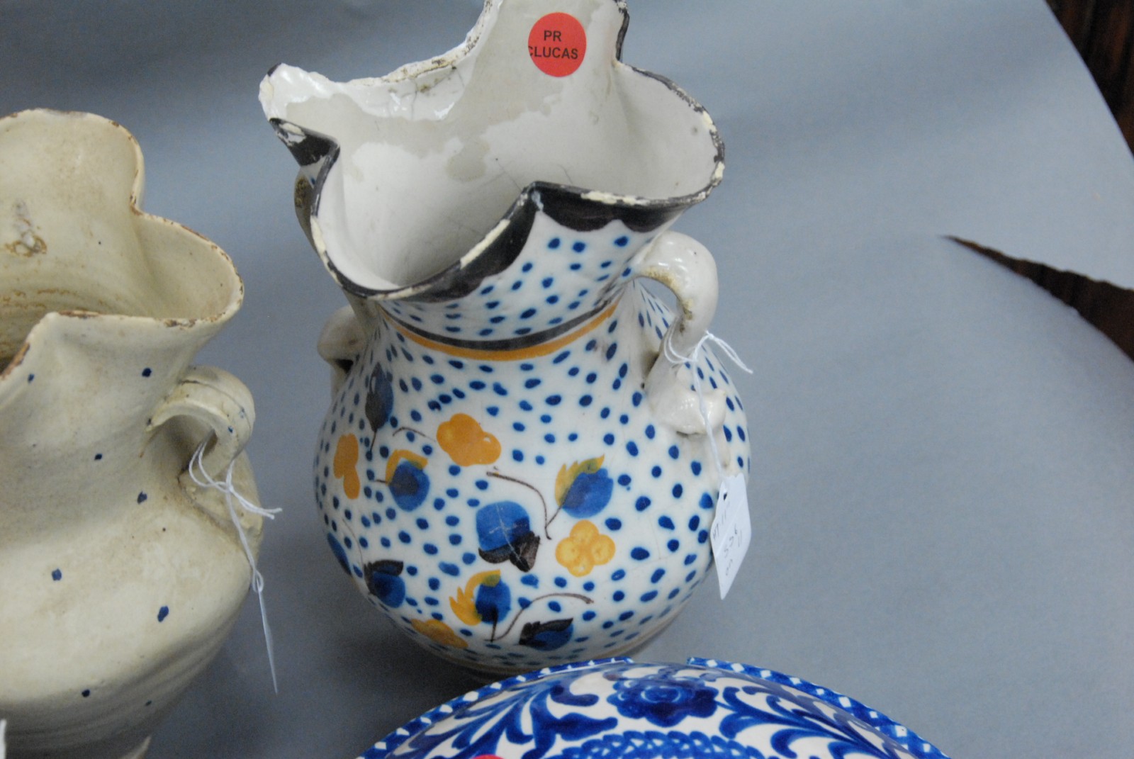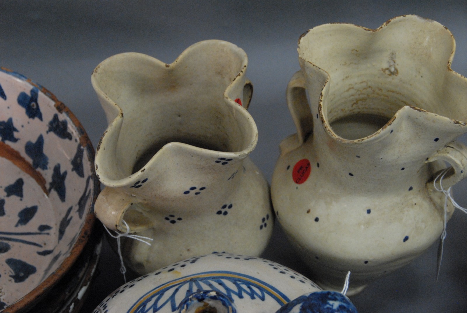 Eleven piece lot of Earthenware to include four shallow bowls, three vases, three coved pieces and one jug probably Spanish 18th – 19th century some damage.