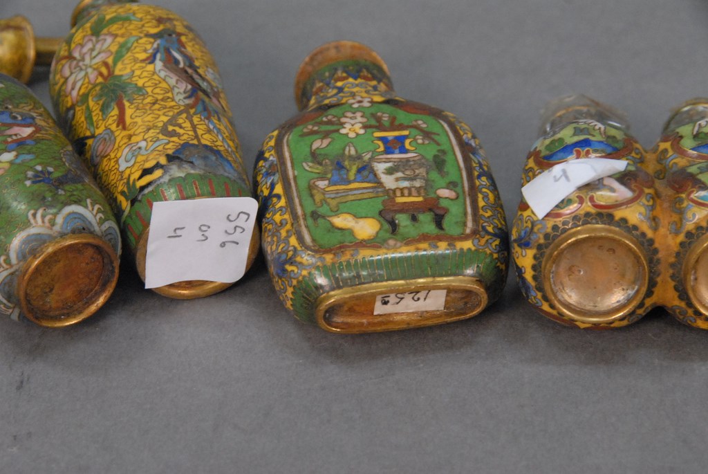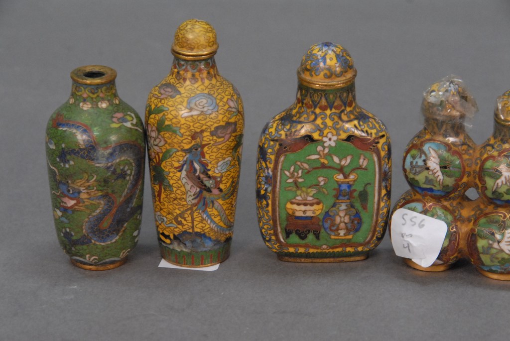 Lot 556: Group of four antique cloisonn snuff bottles to include one double snuff in double gourd form, two in baluster vase form green and …