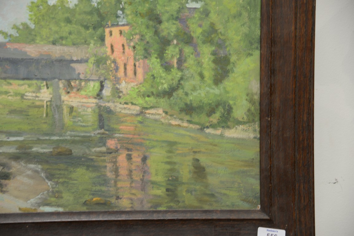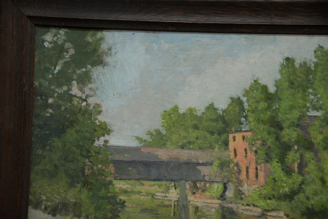Helen Savier Dumond 1872-1968 oil on board Covered Bridge unsigned 16 x 9 1/2