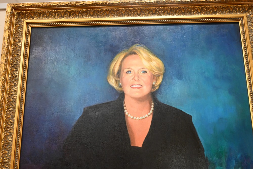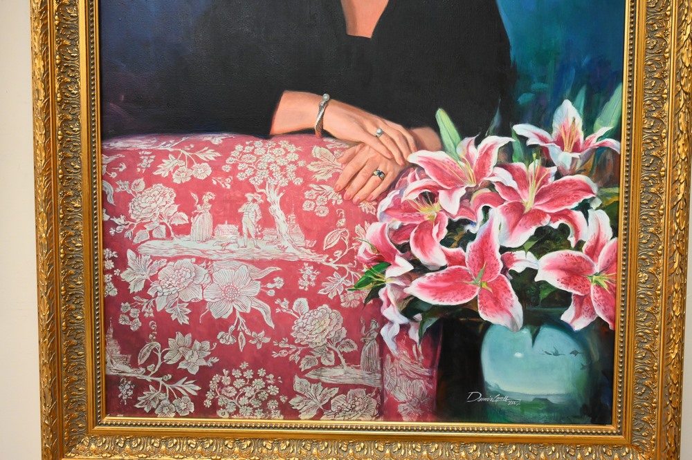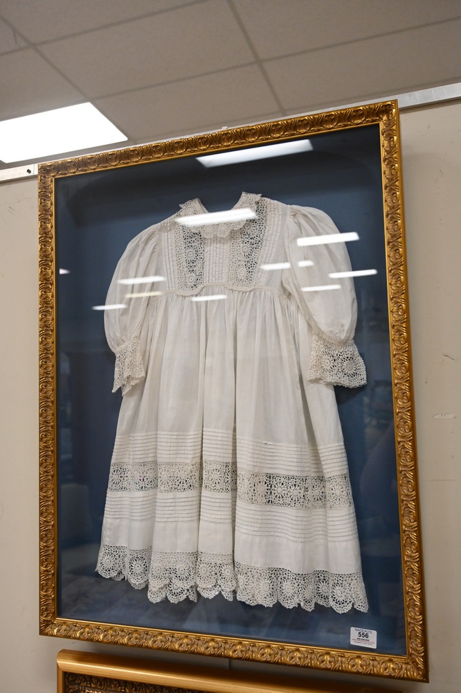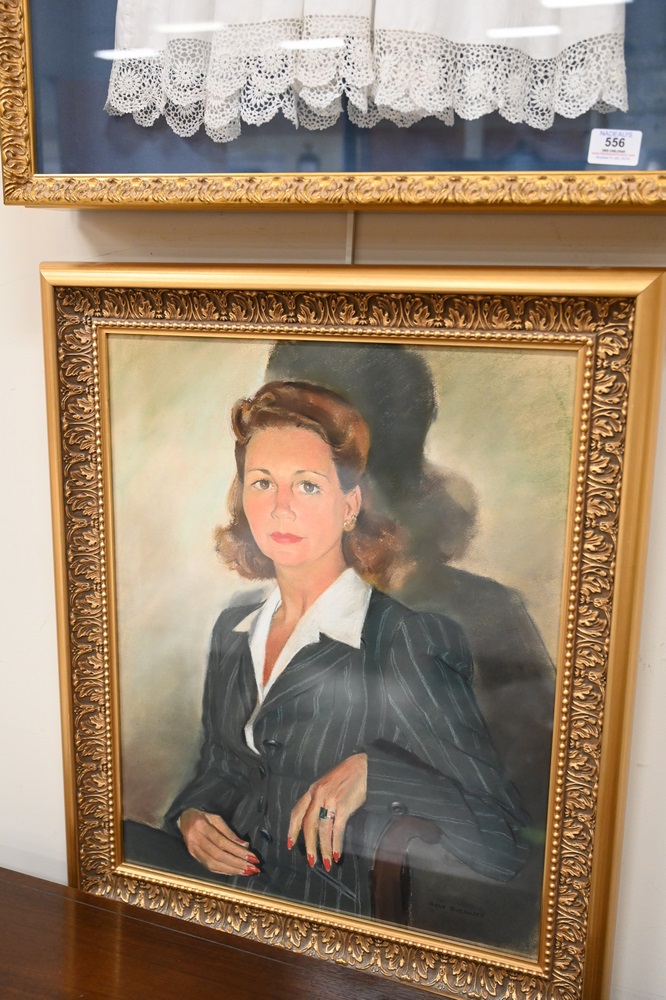 Lot 556: Three Framed Pieces, to include a Gene Guernsey pastel portrait of a woman; a large portrait of a woman, oil on canvas, signed “Dennis”, 42 x 31 inches; along with a girls dress in shadow box frame.