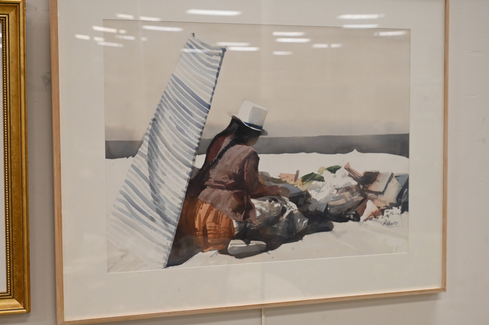 Three Large Framed Pieces, to include a Altino Villasante, seated figure, watercolor, signed lower right A. Villasante; Mac C. Abah, Horses Running in Iceland, 1993; along with a rubbing slate relief, #5/6, signed illegibly, largest 51 1/2″ x 30″.