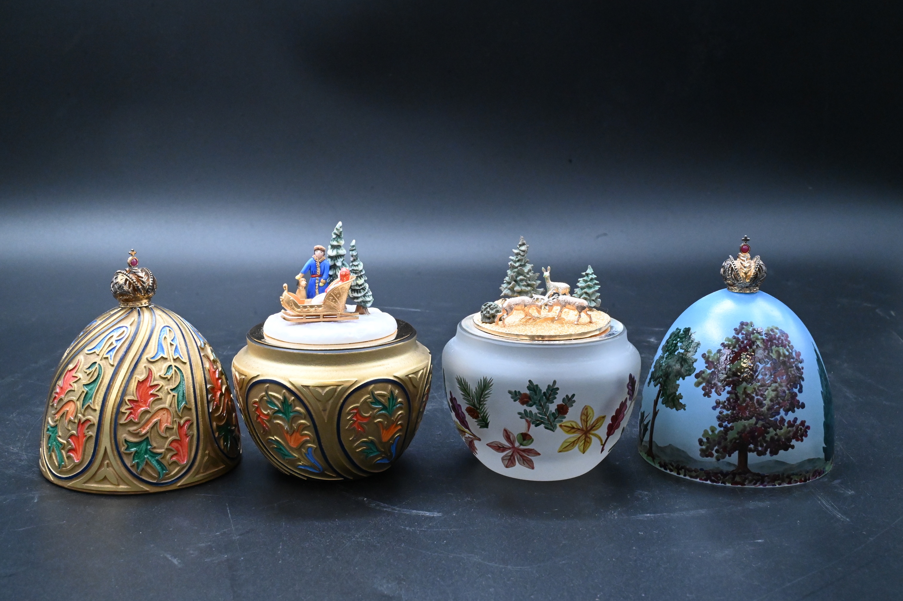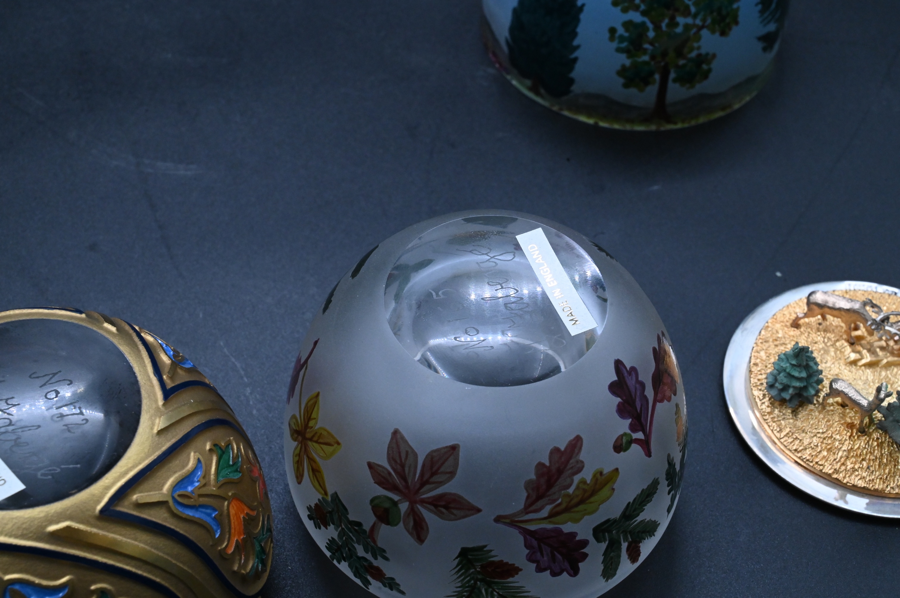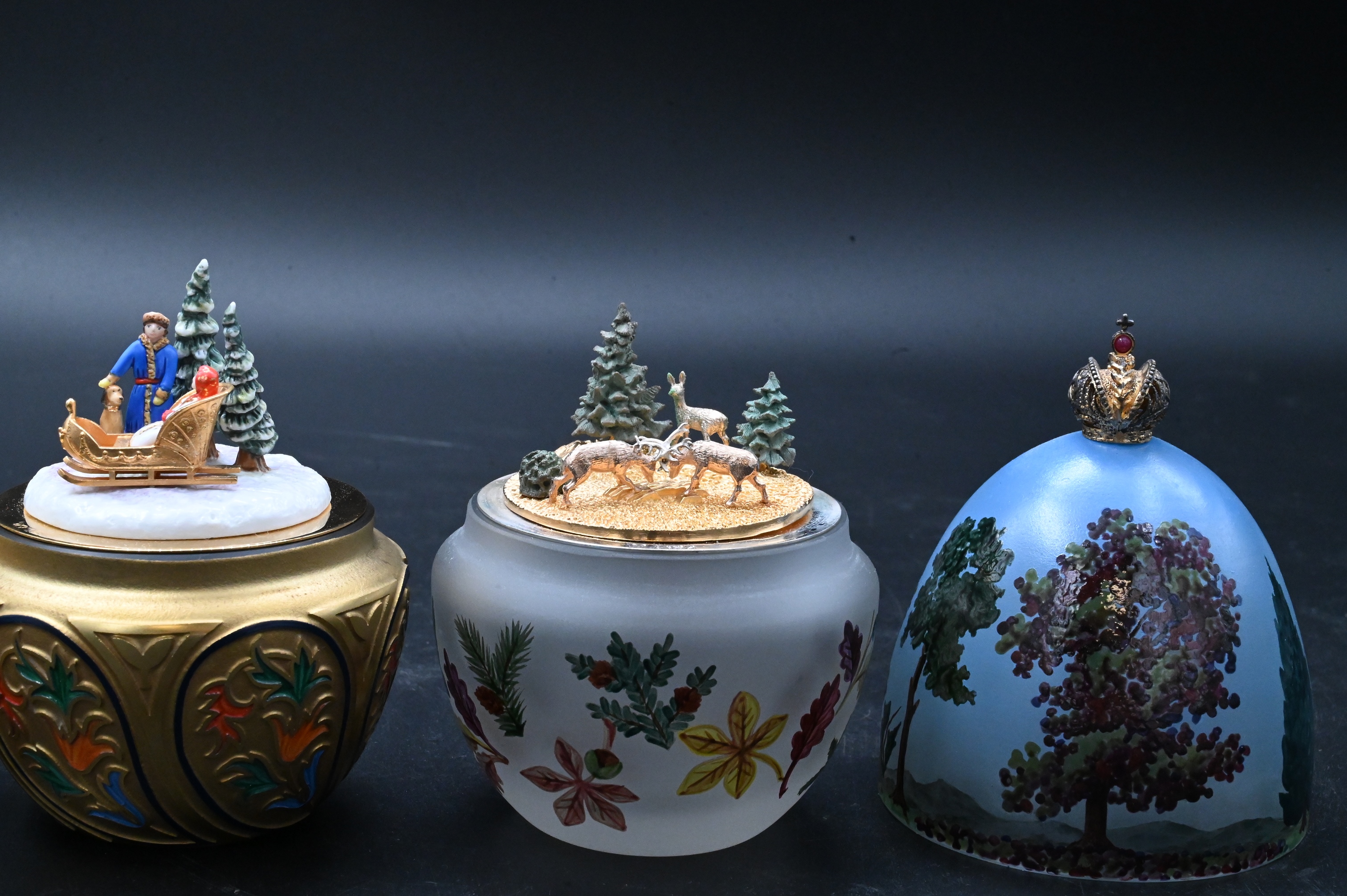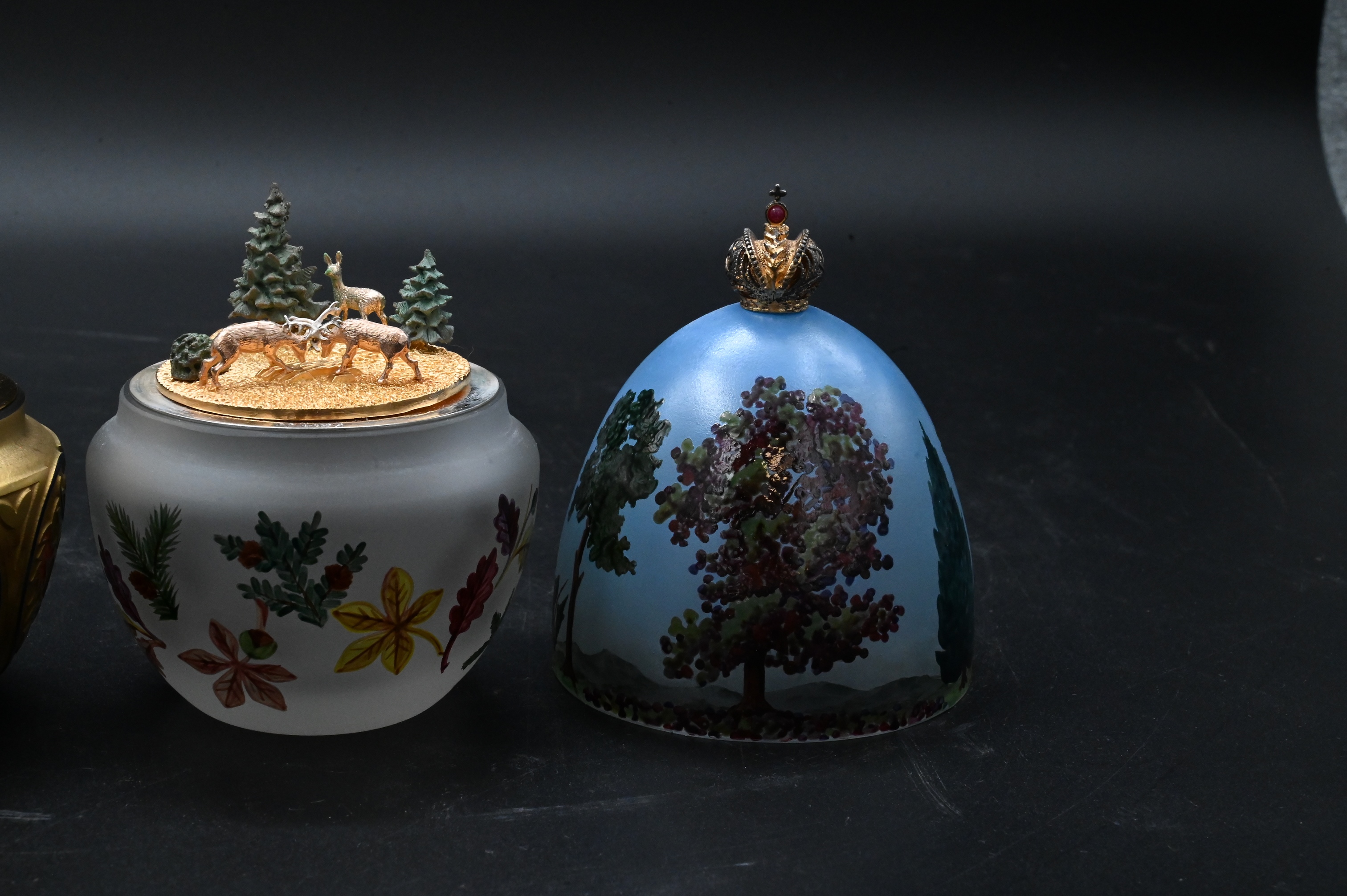 along with “Autumn” egg, 1992, hand painted trees opening to vermeil deer in a forest, edition 165/750, sterling silver marked