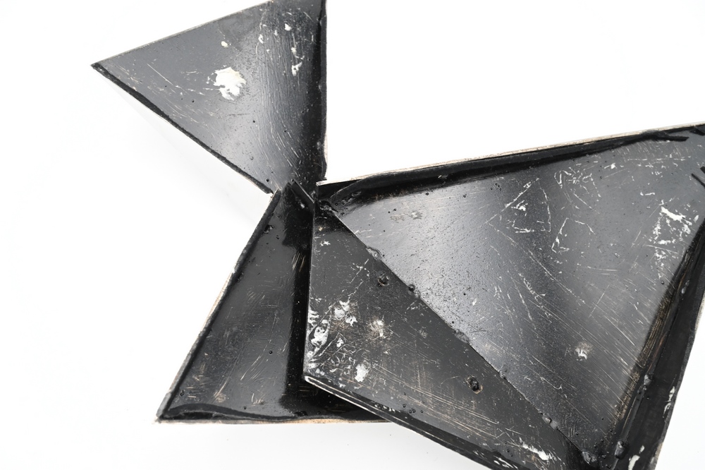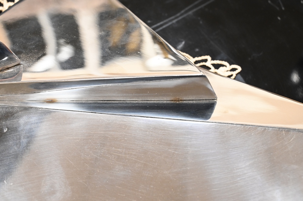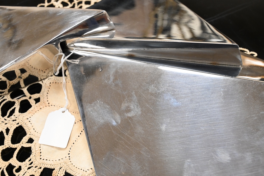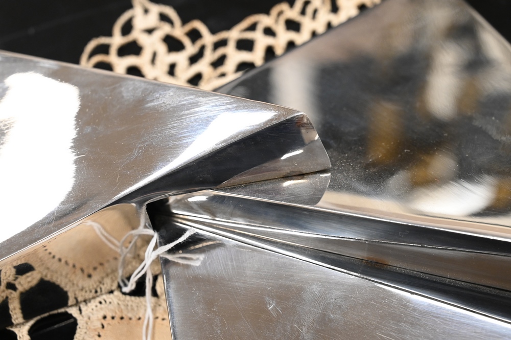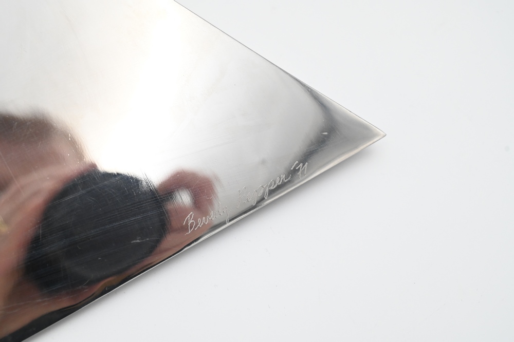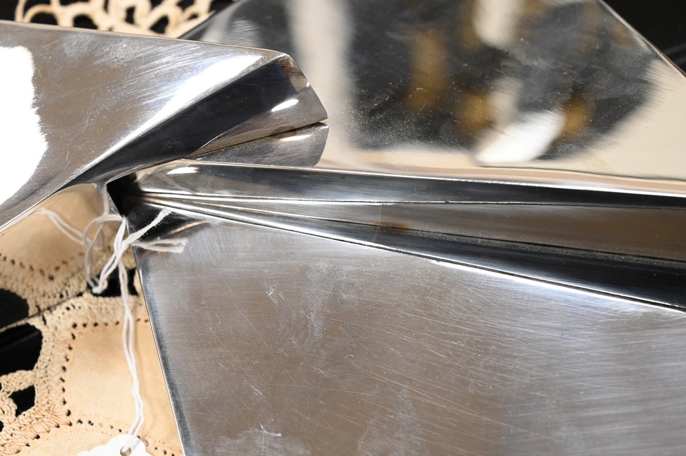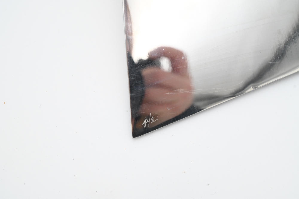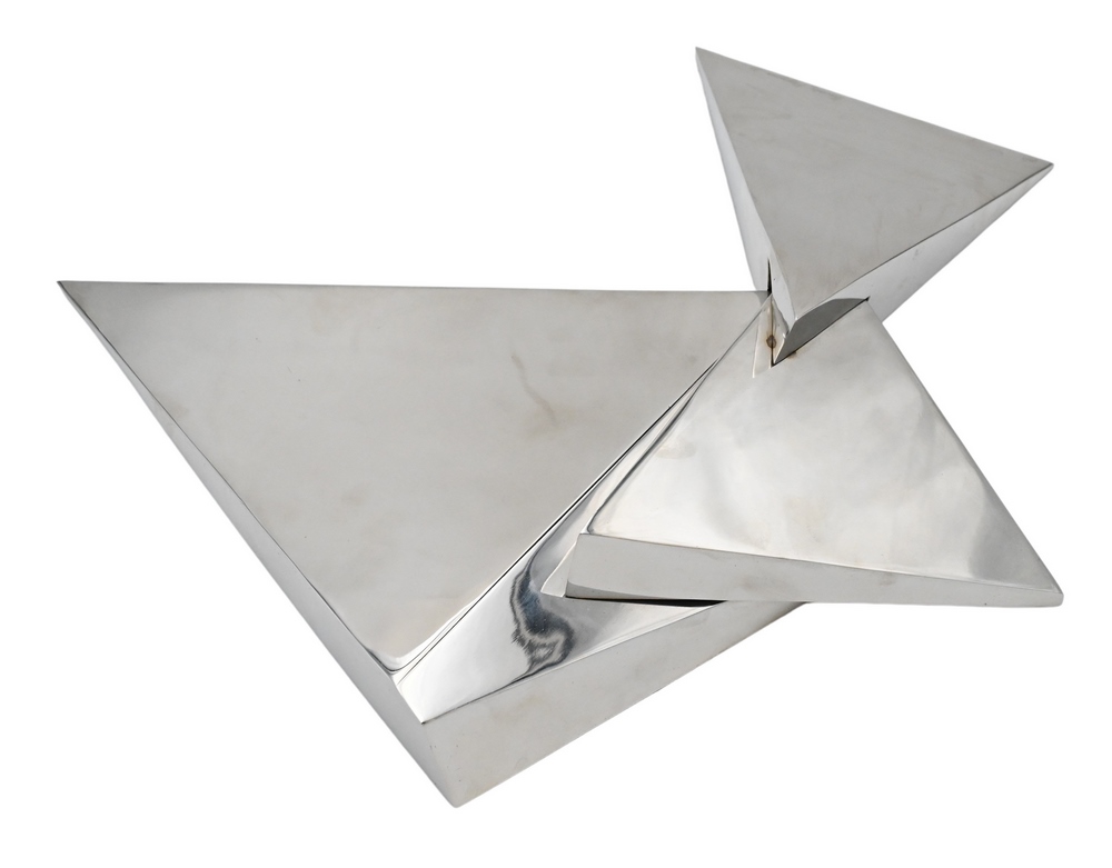 Beverly Pepper (American, 1922 – 2020), untitled, polished stainless steel triangular sculpture, signed and dated Beverly Pepper 71′, numbered p/a, height 2 1/2 inches, length 19 inches, width 17 inches .