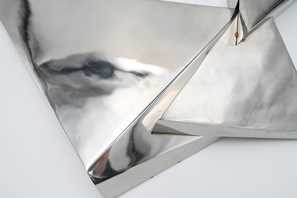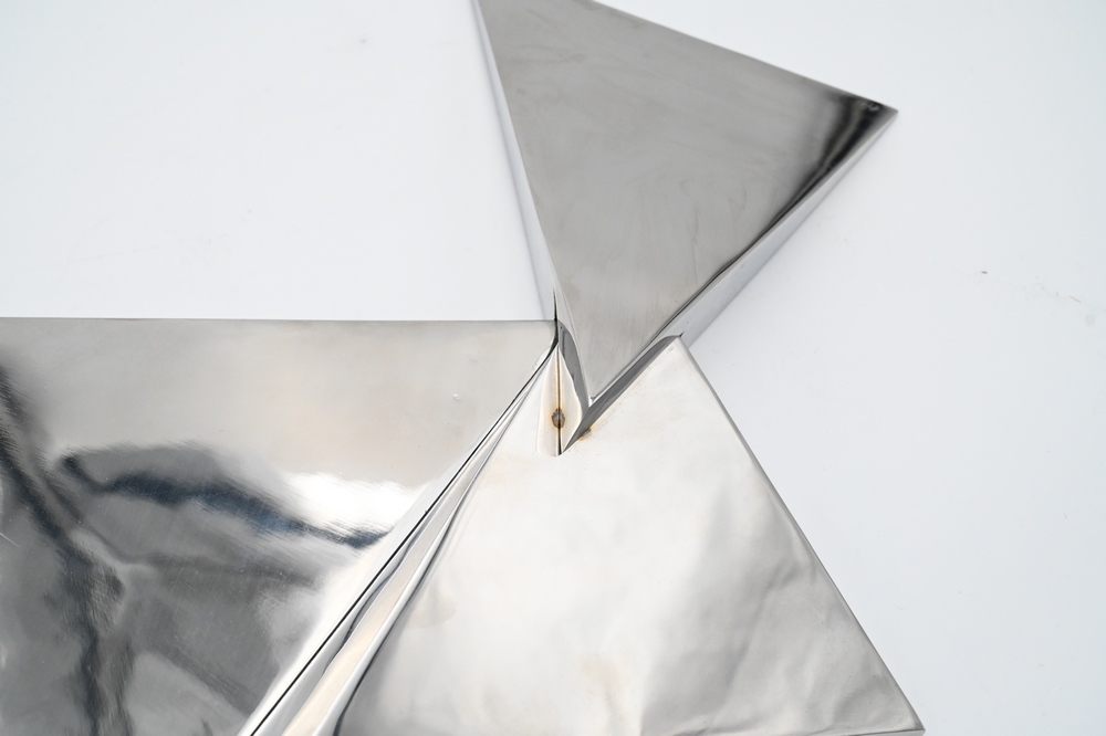 Lot 557: Beverly Pepper (American, 1922 – 2020), untitled, polished stainless steel triangular sculpture, signed and dated Beverly Pepper 71’…