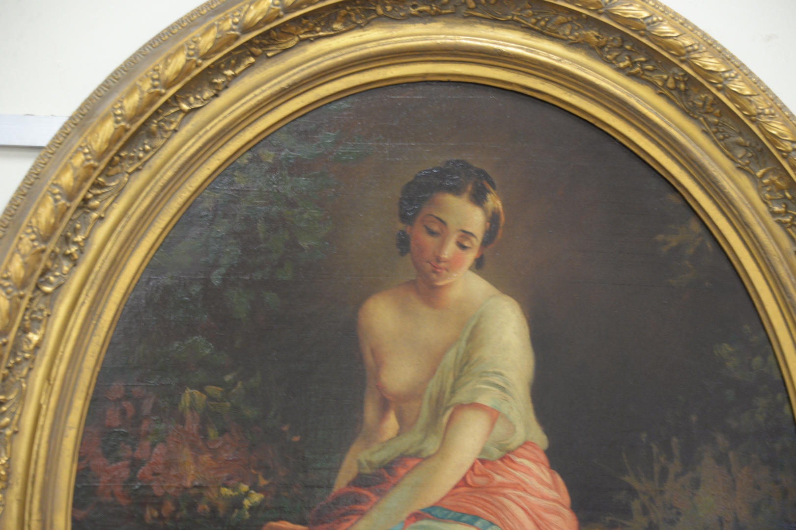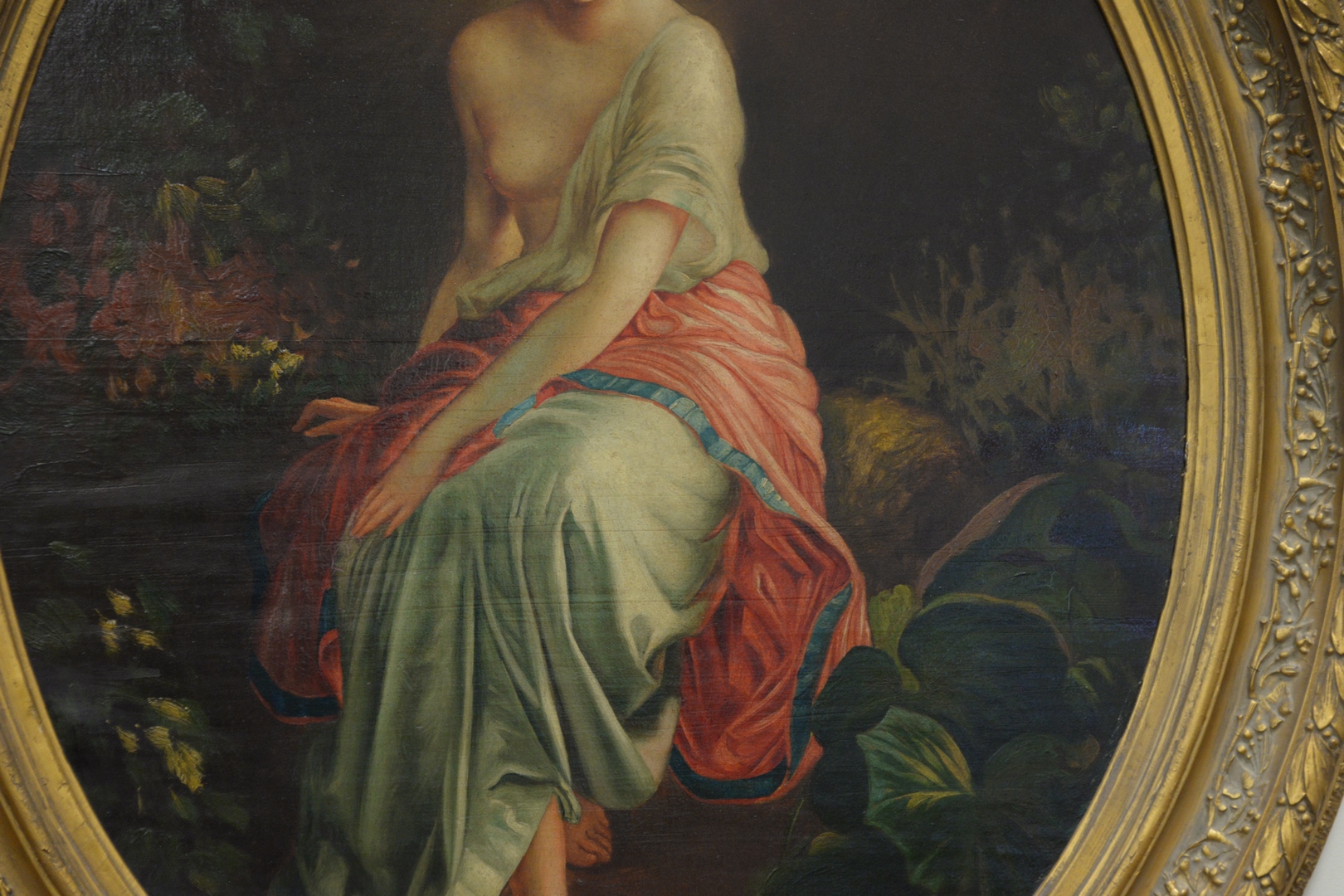 Continental School (late 19th century), oval portrait of a partially dressed maiden, oil on canvas laid on panel, unsigned, 32″ x 25 1/2″. Provenance: Estate of James Wadhams