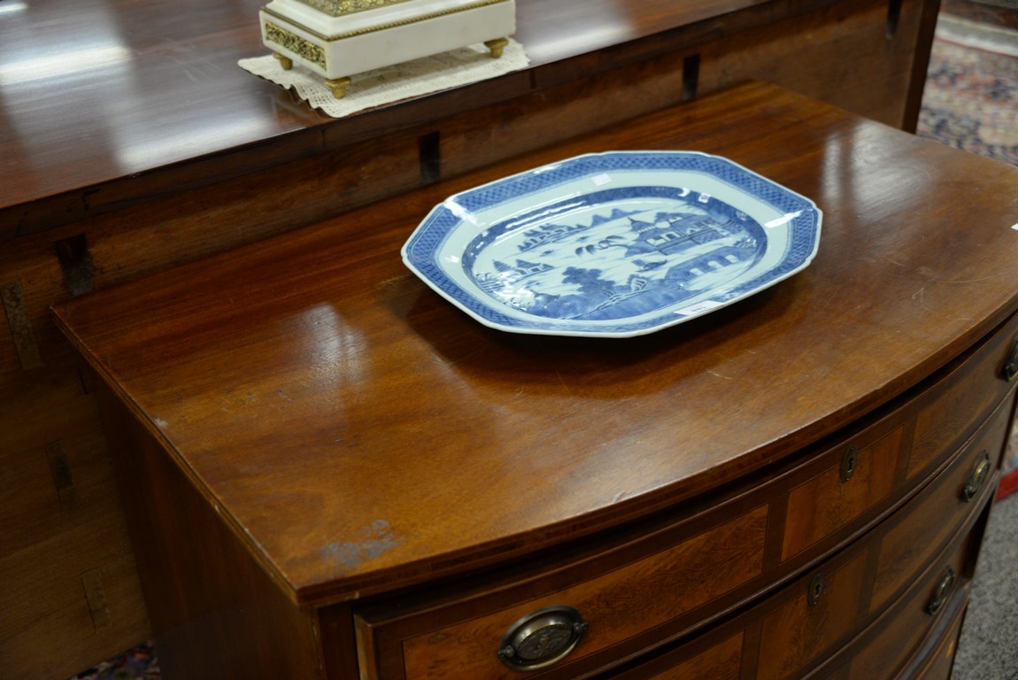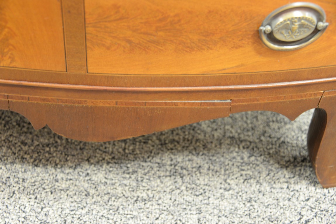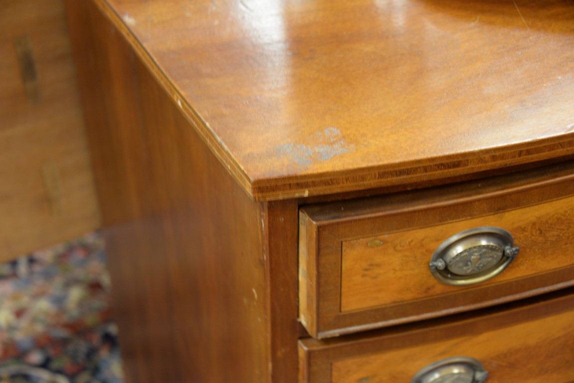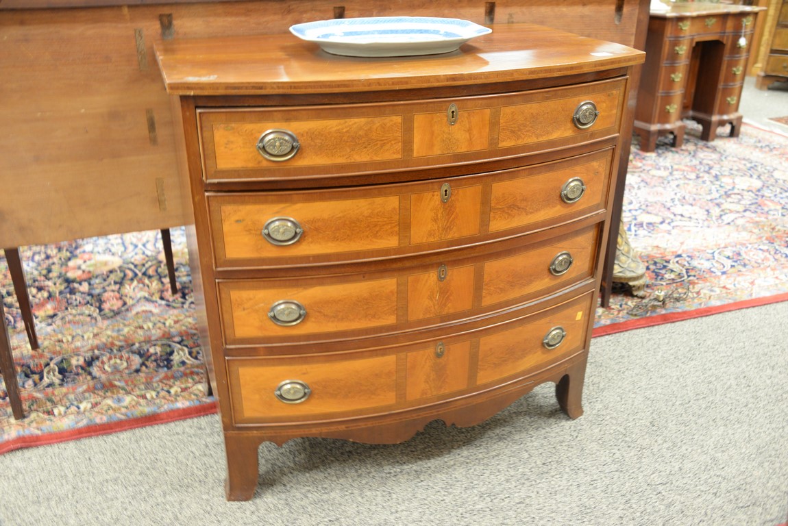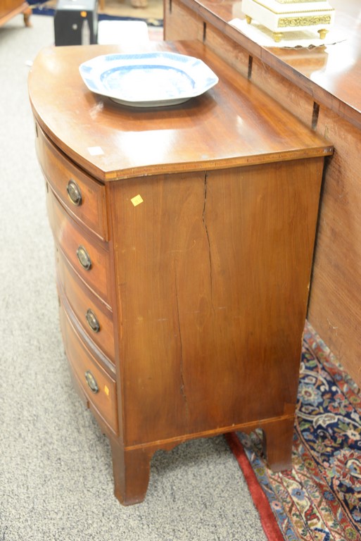 Custom mahogany bowed front chest with panel inlaid drawers. ht. 36 3/4in. wd. 37 1/4in. dp. 22 1/4in.