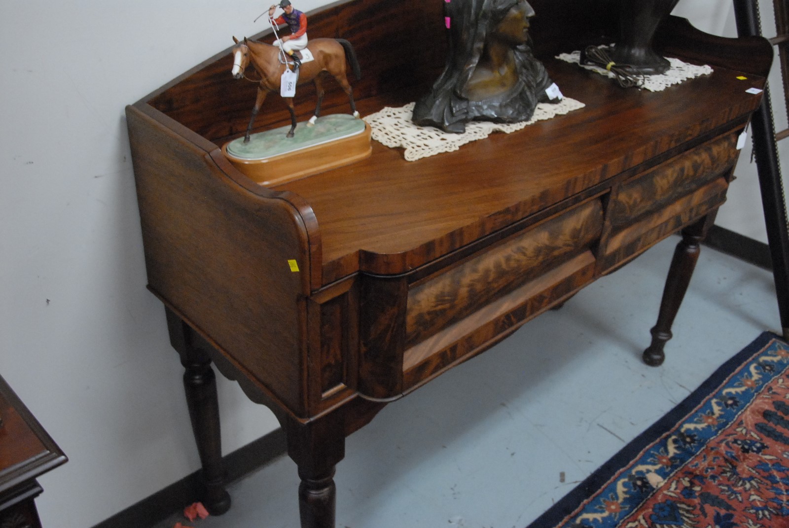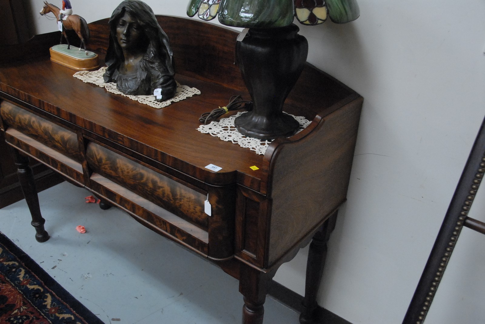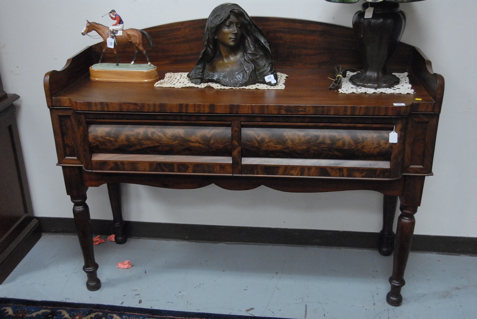 Lot 557: Empire mahogany sideboard with wood gallery having two drawers set on turned legs. ht. 45 in. wd. 57 1/2 in. dp. 19 1/2 in.