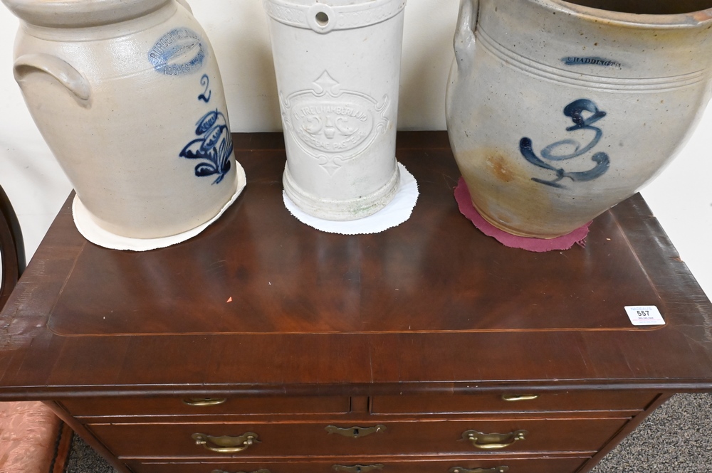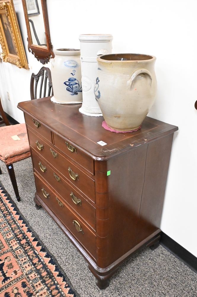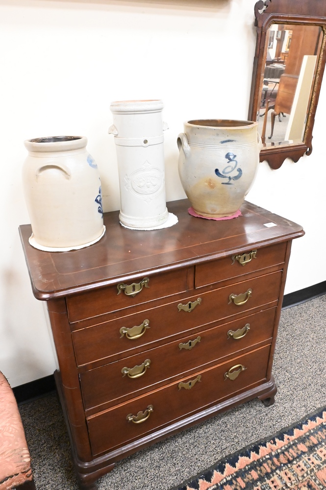 Lot 557: George III Chest, two over three drawers, 18th century, restored, height 32 inches, top 18 1/2″ x 33 1/2″.