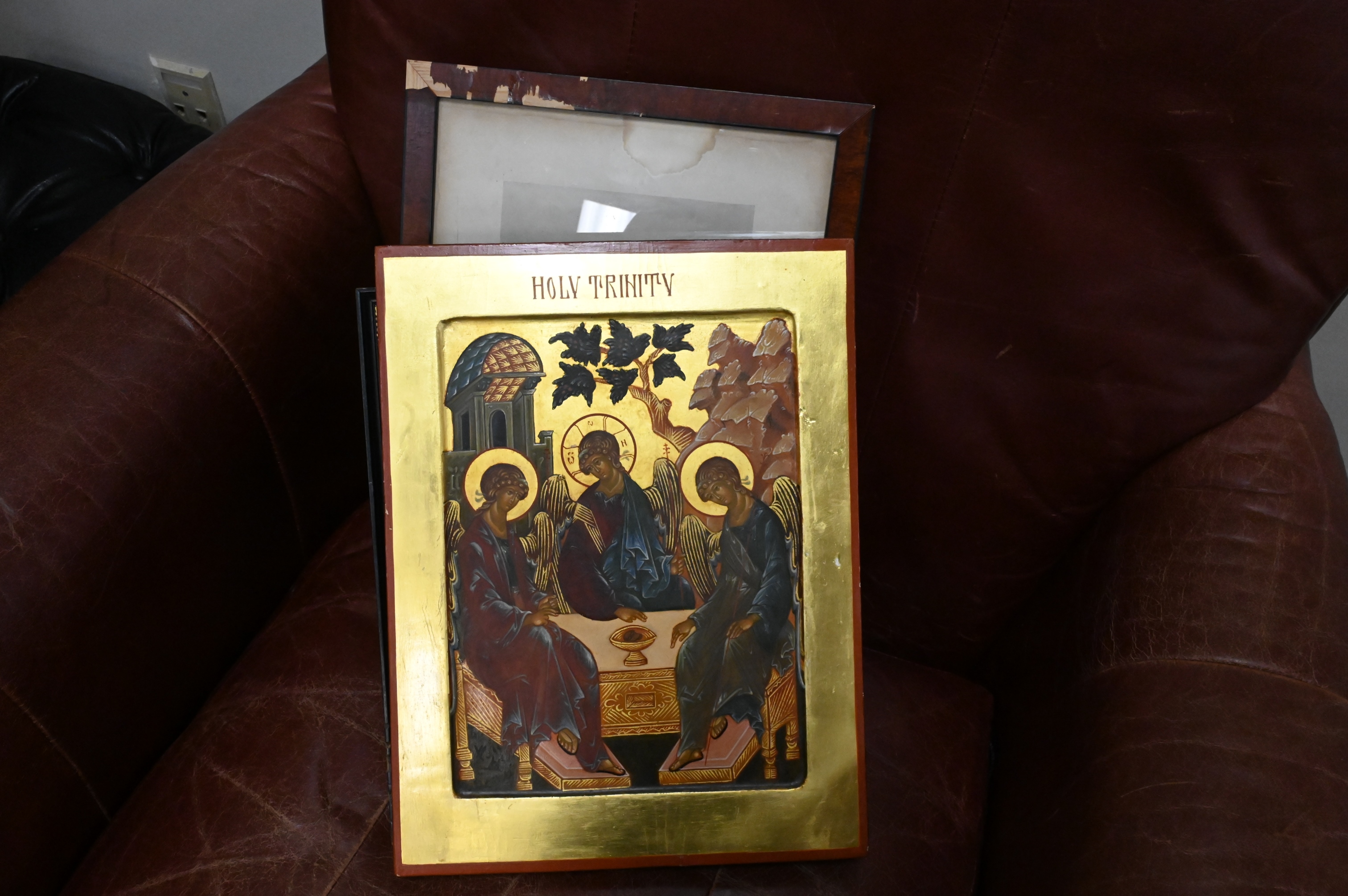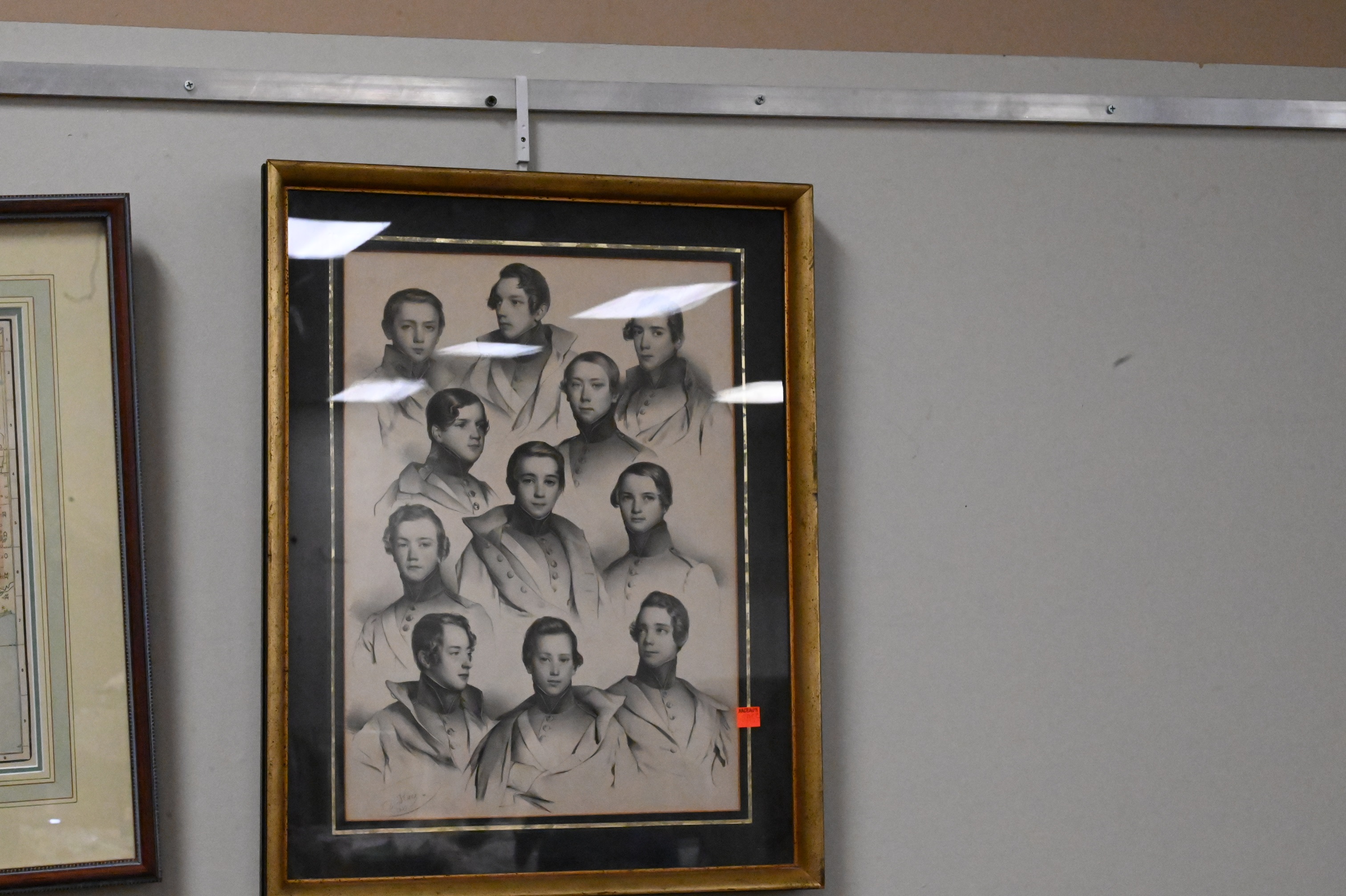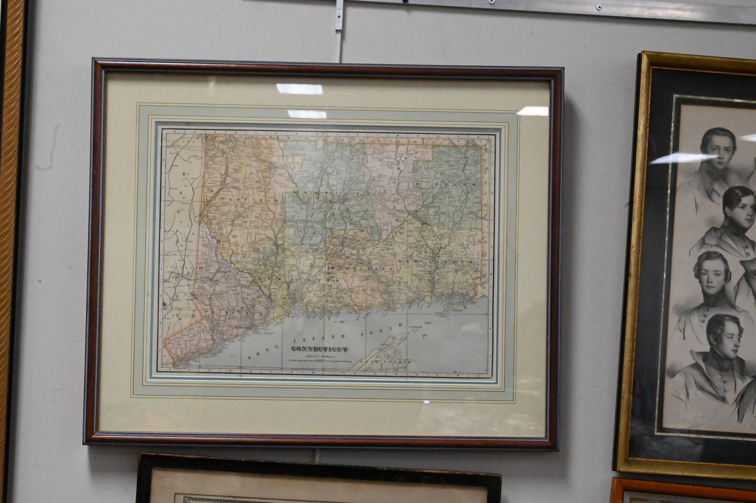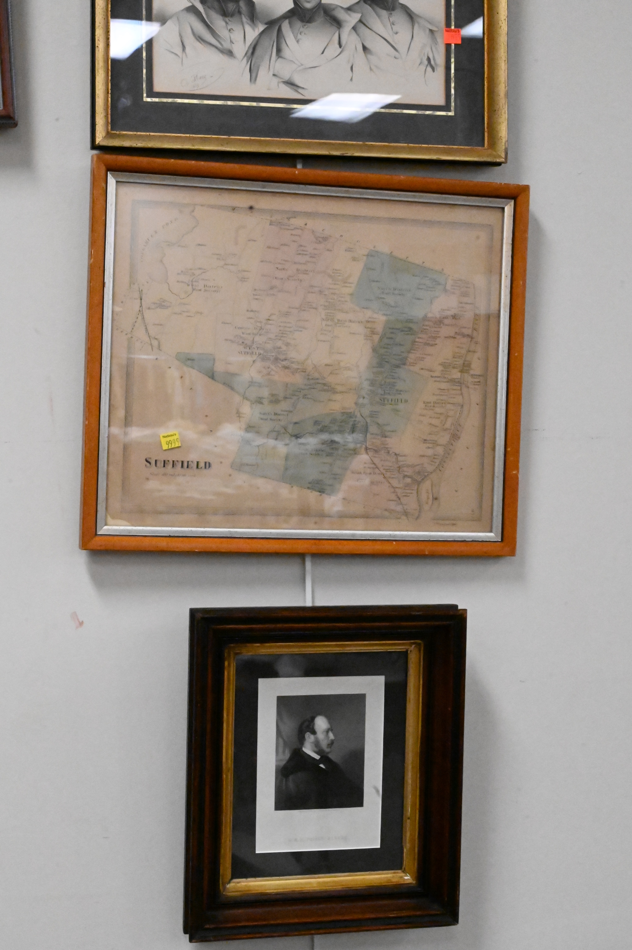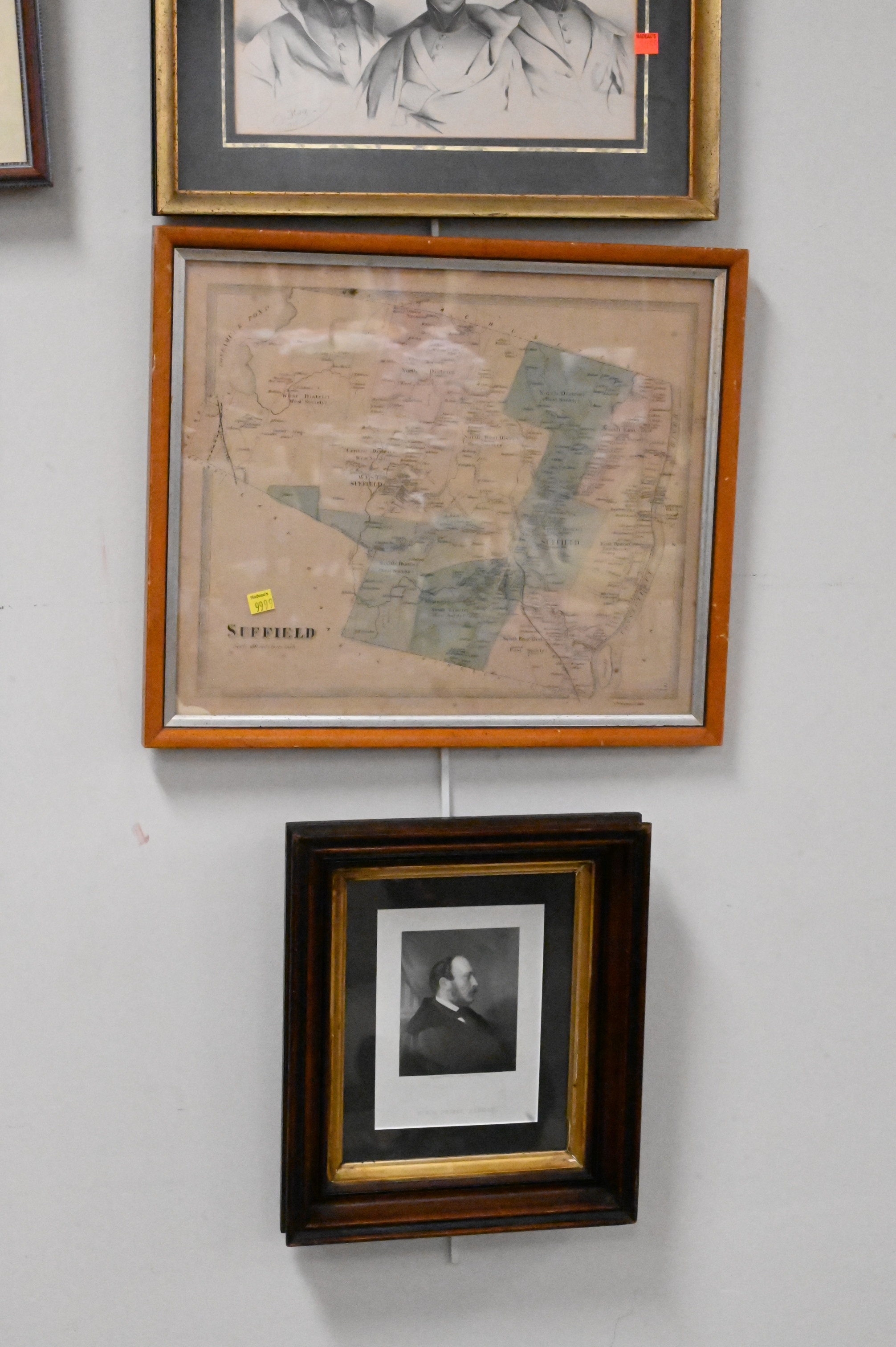 Large Grouping of 13 Prints, to include 4 framed vintage town maps, 5 portrait prints, 1 pen and ink, 1 religious “Holy Trinity” gilded woodblock, along with 2 decorative Greek mythological scenes; largest piece 14″ x 19″.