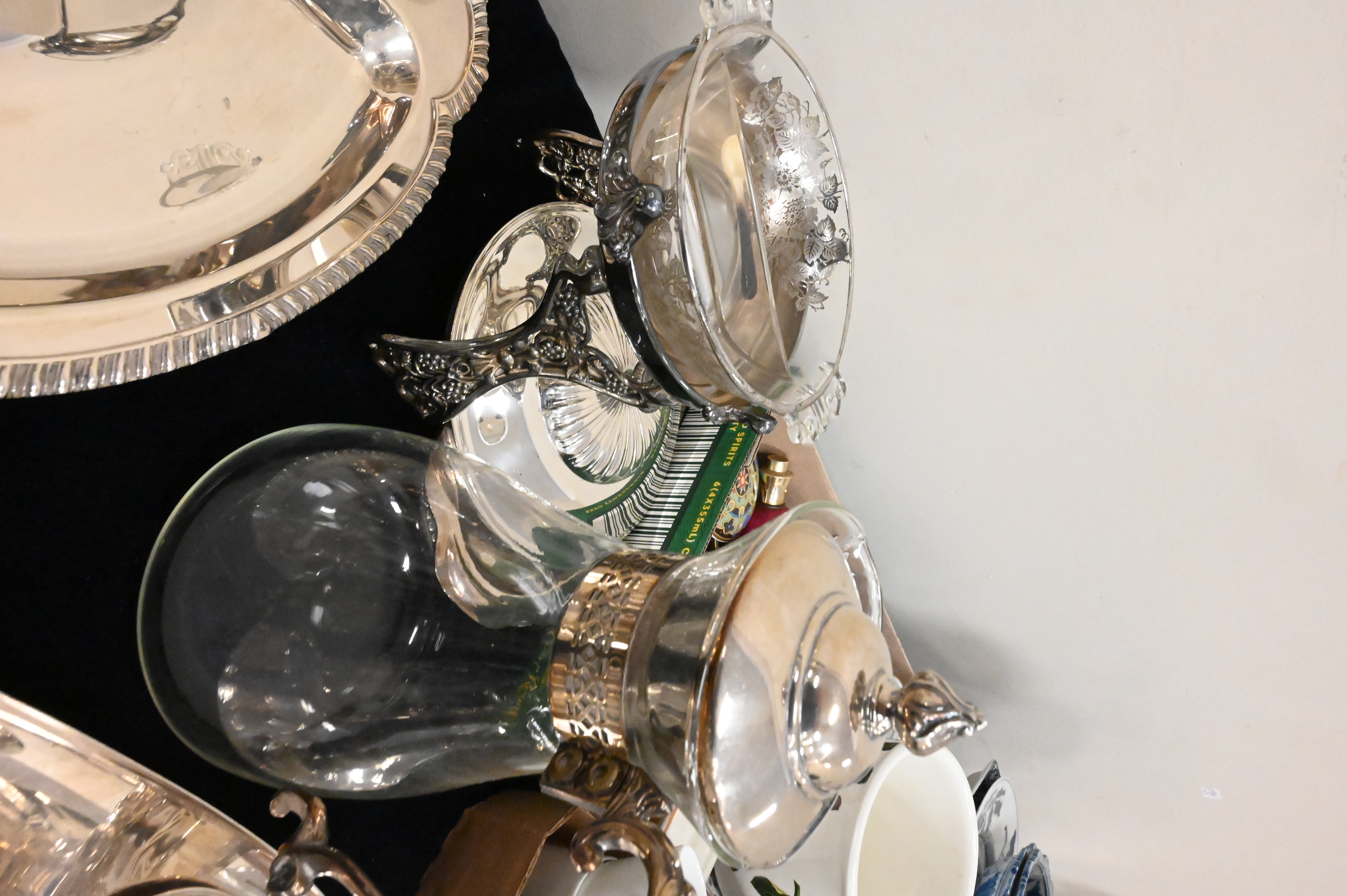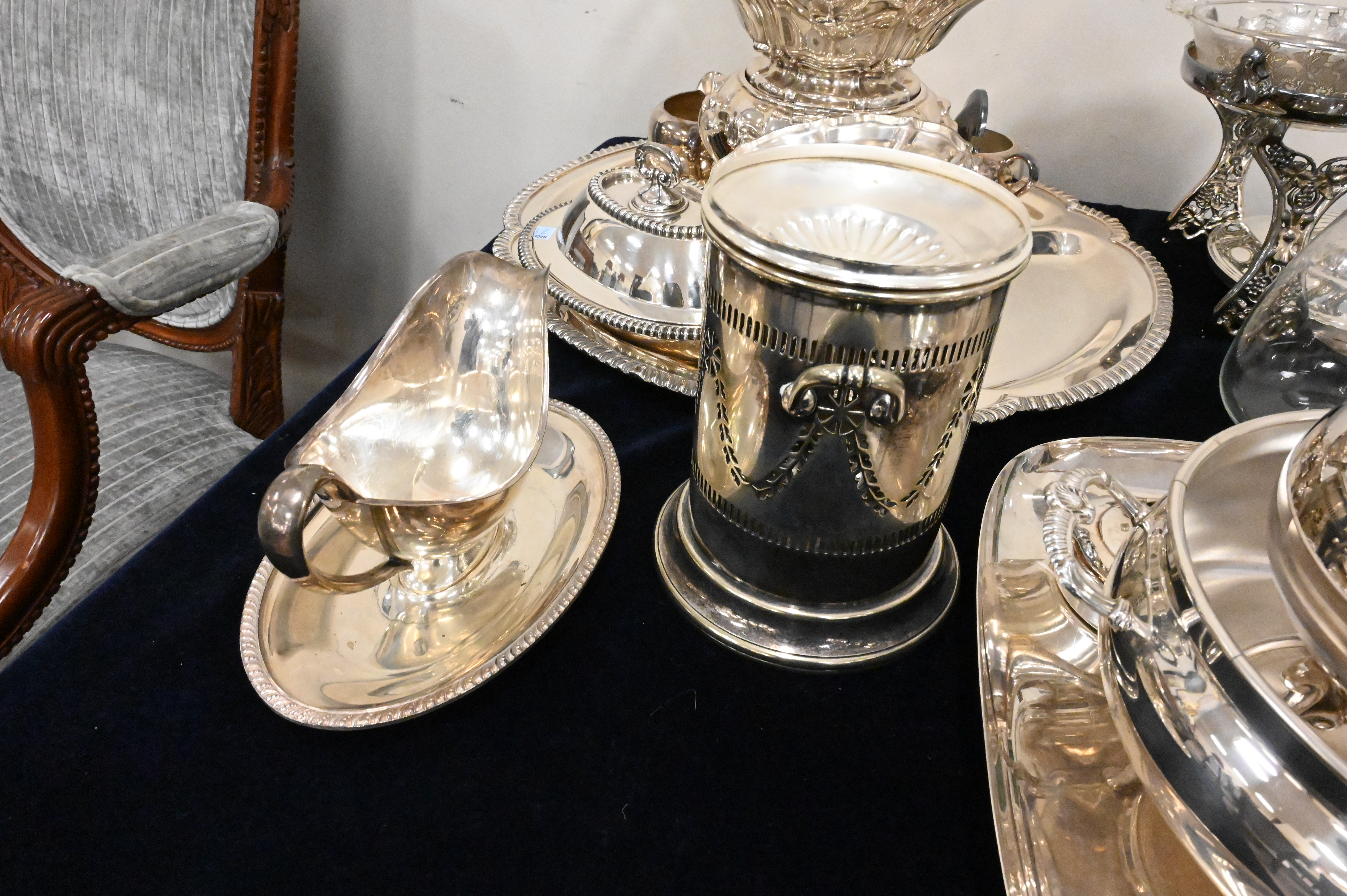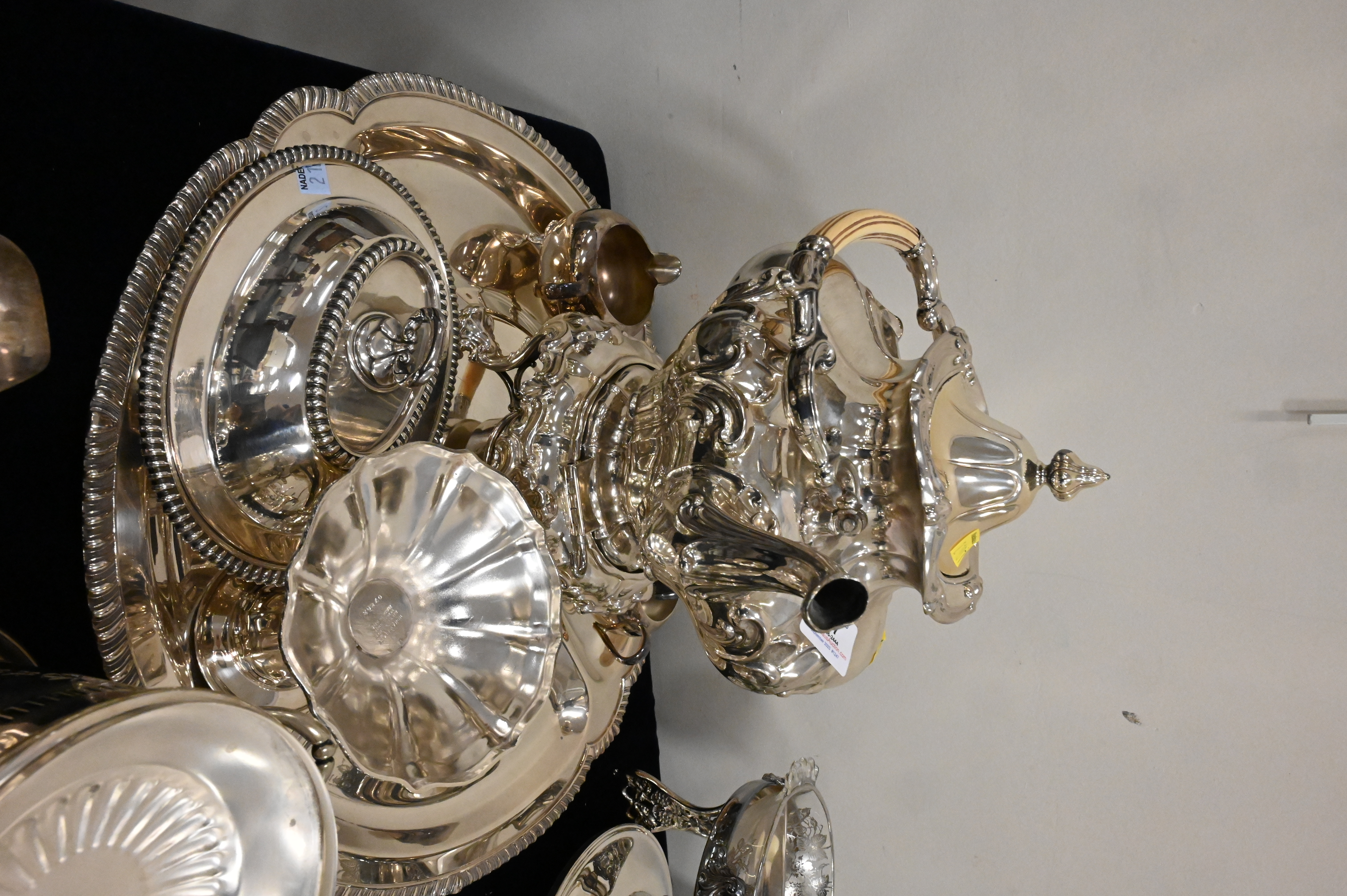 Large Grouping of Silver Plate, to include gravy dishes, platters, trays, butter dishes, hot water on a stand, etc.. tallest approximate height 16 inches.