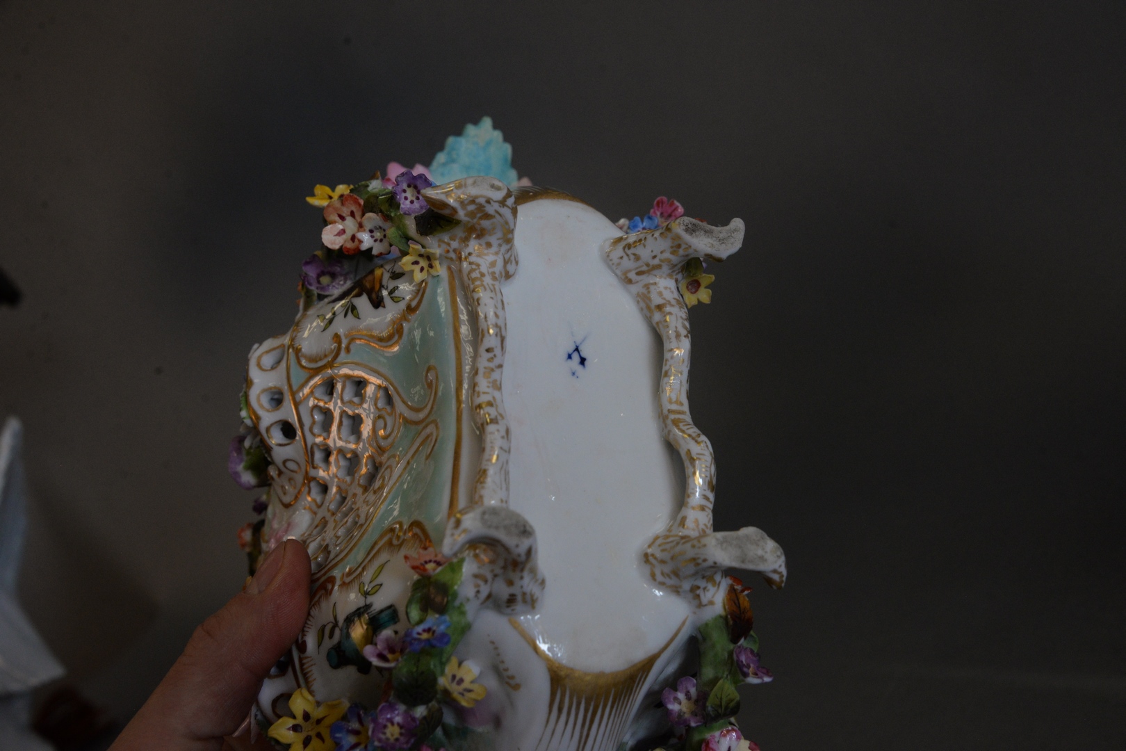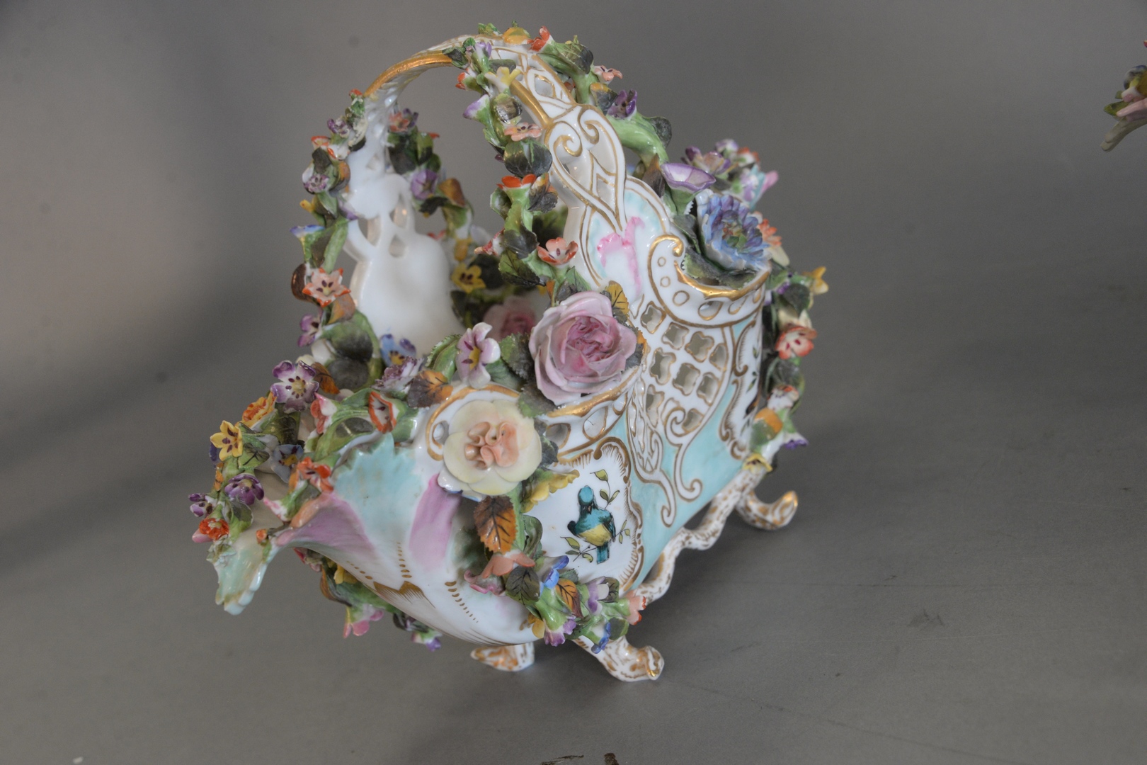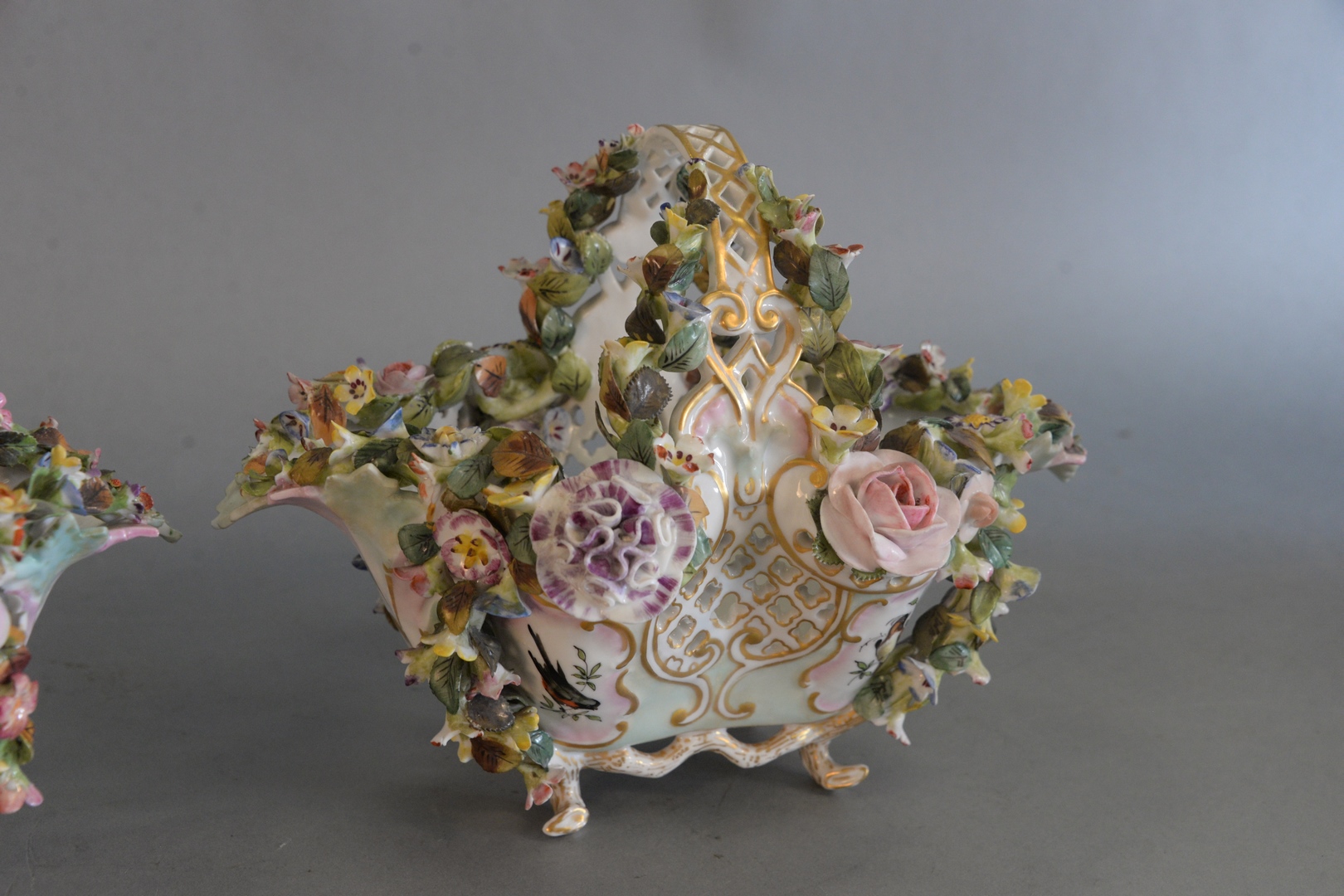 Lot 557: Pair Meissen Baskets mounted with three-dimensional flowers one handle repaired height 8 1/2 inches, length 11 1/2 inches