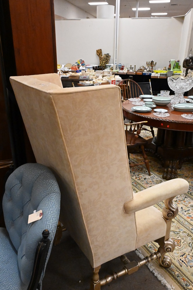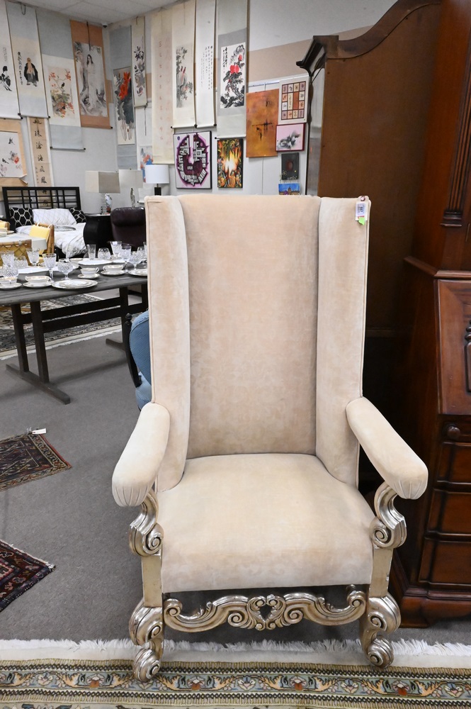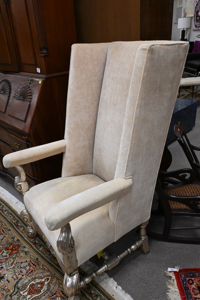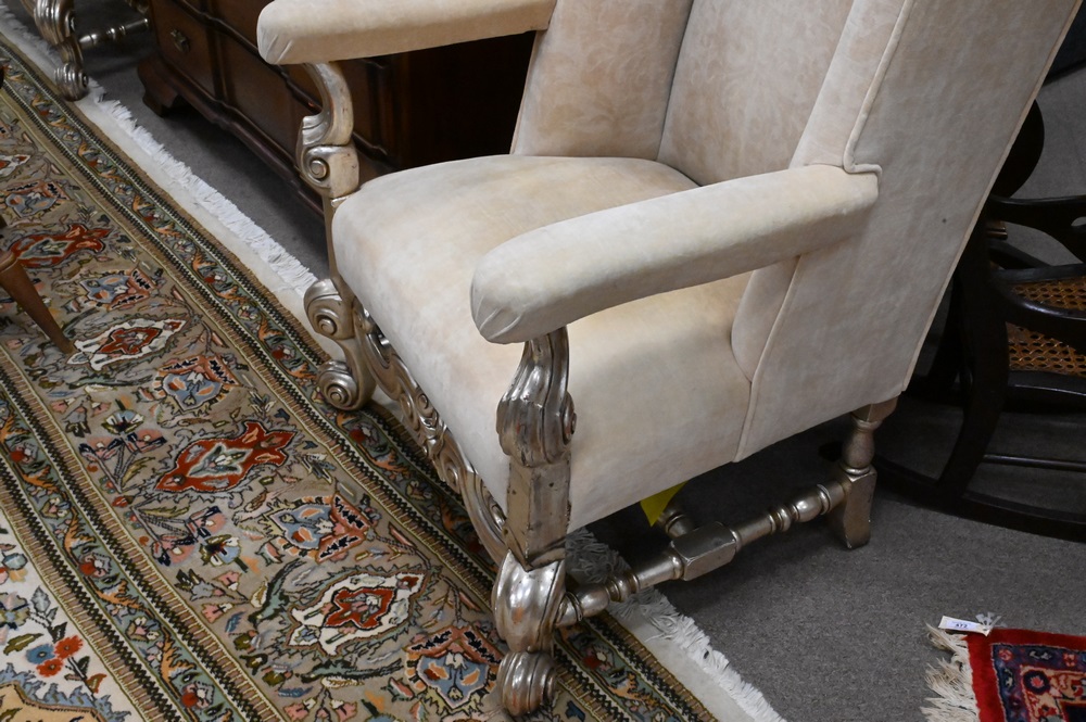 Pair of Contemporary Continental Style Silvered and Upholstered Armchairs, heigth 50 inches.