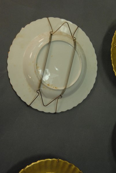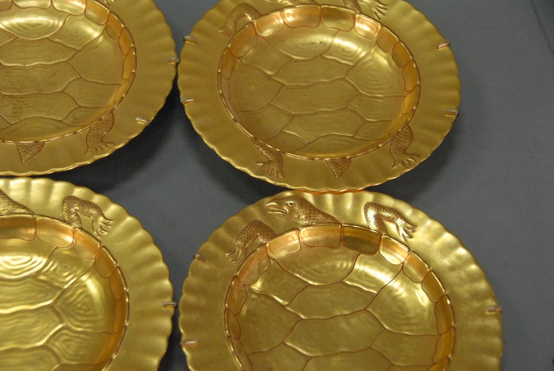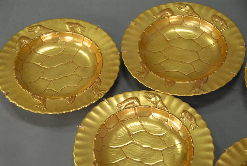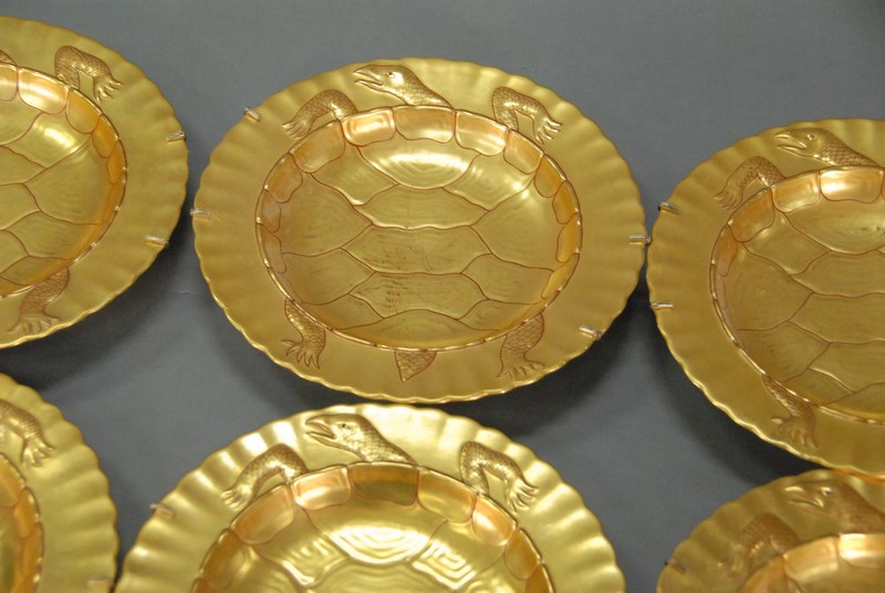 Set of seven turtle dishes, gilt with embossed turtles. dia. 8in.