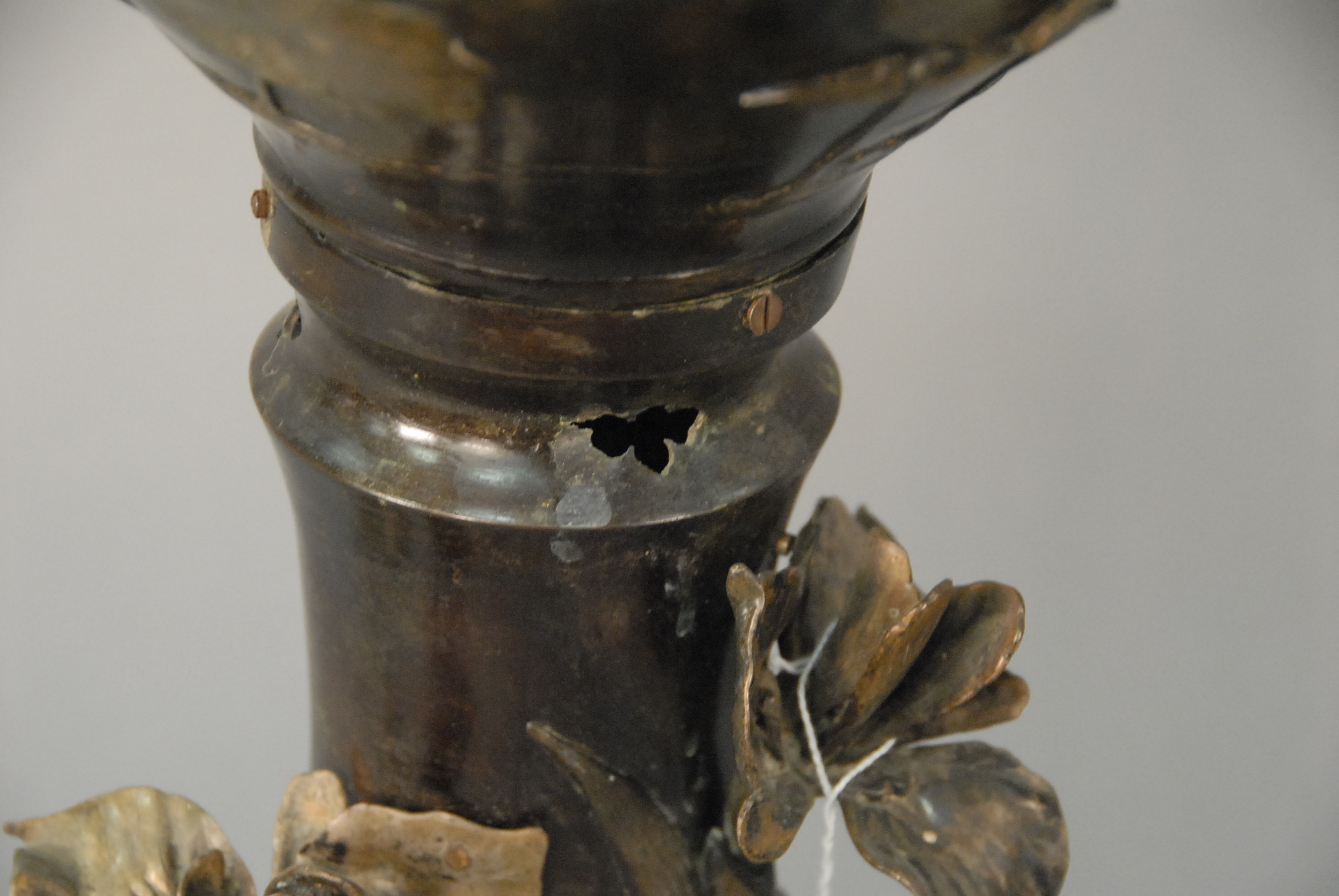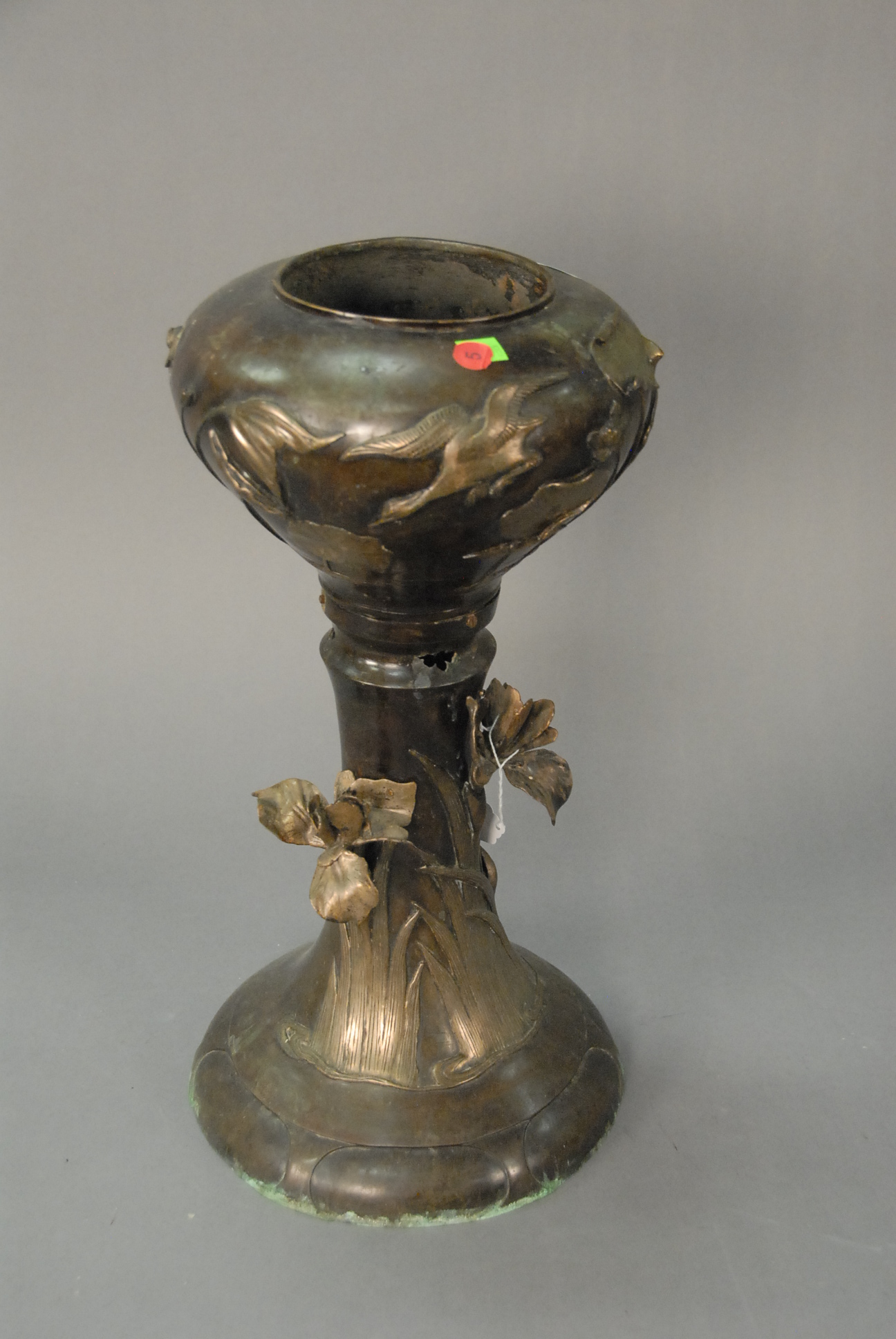 Lot 558: Bronze plant stand with applied Irises to foot and bas-relief cranes and lotus to upper bowl, Japan 19th/20th century may be missing insert. ht. 20in.