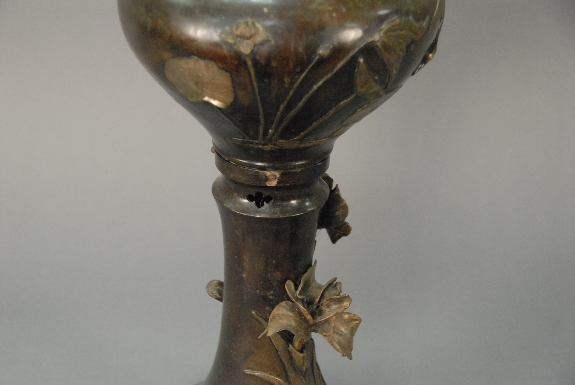 Bronze plant stand with applied Irises to foot and bas-relief cranes and lotus to upper bowl, Japan 19th/20th century may be missing insert. ht. 20in.