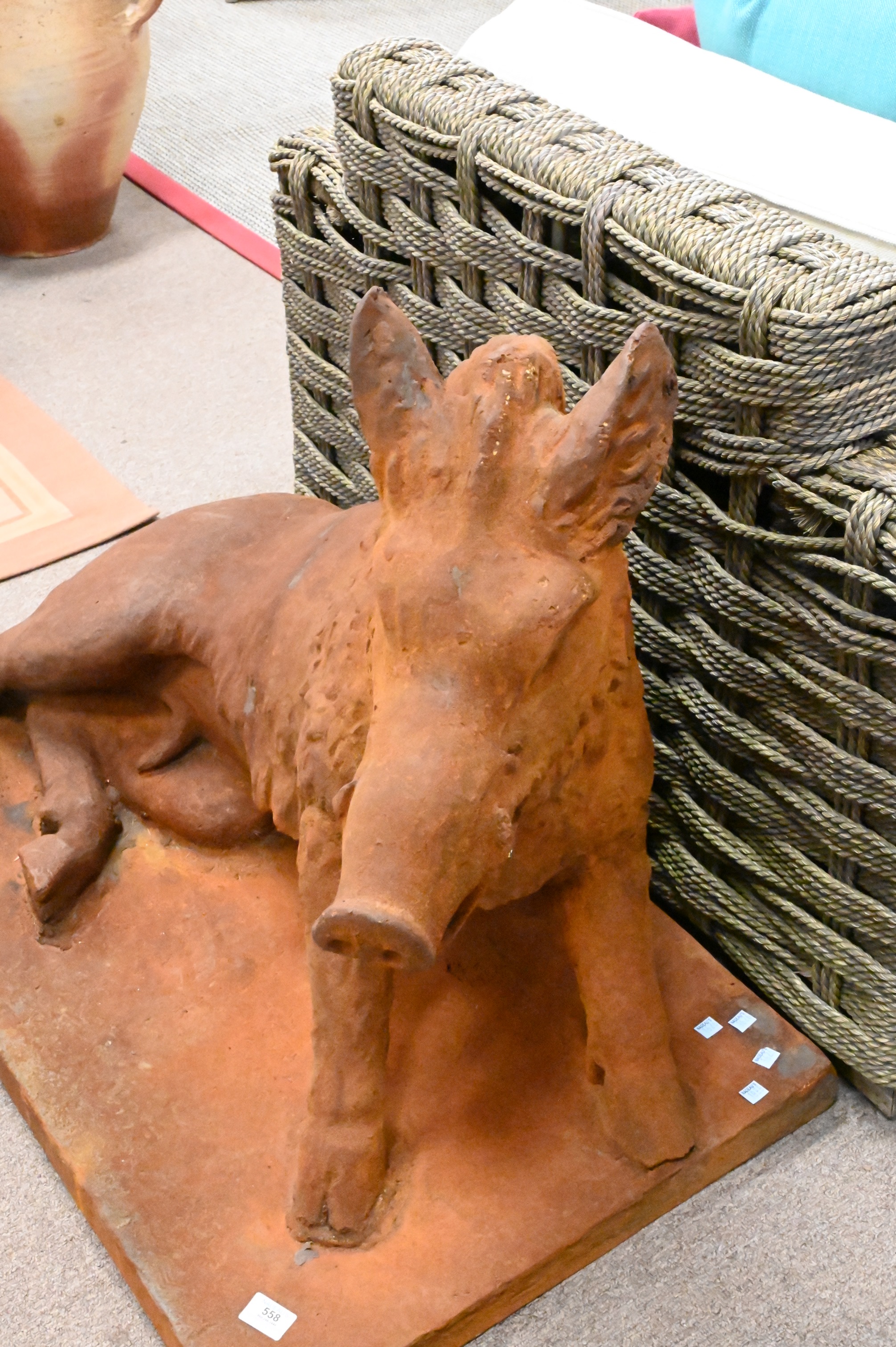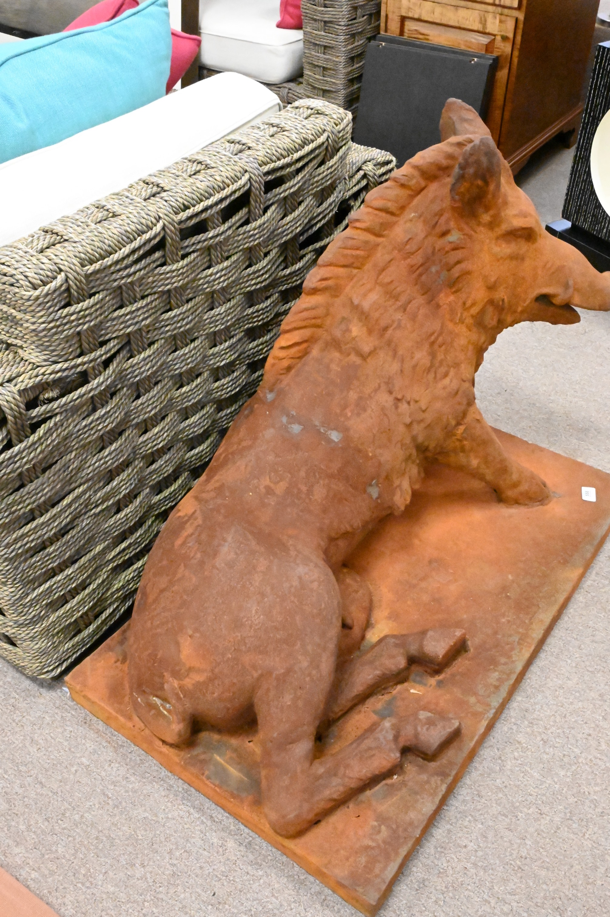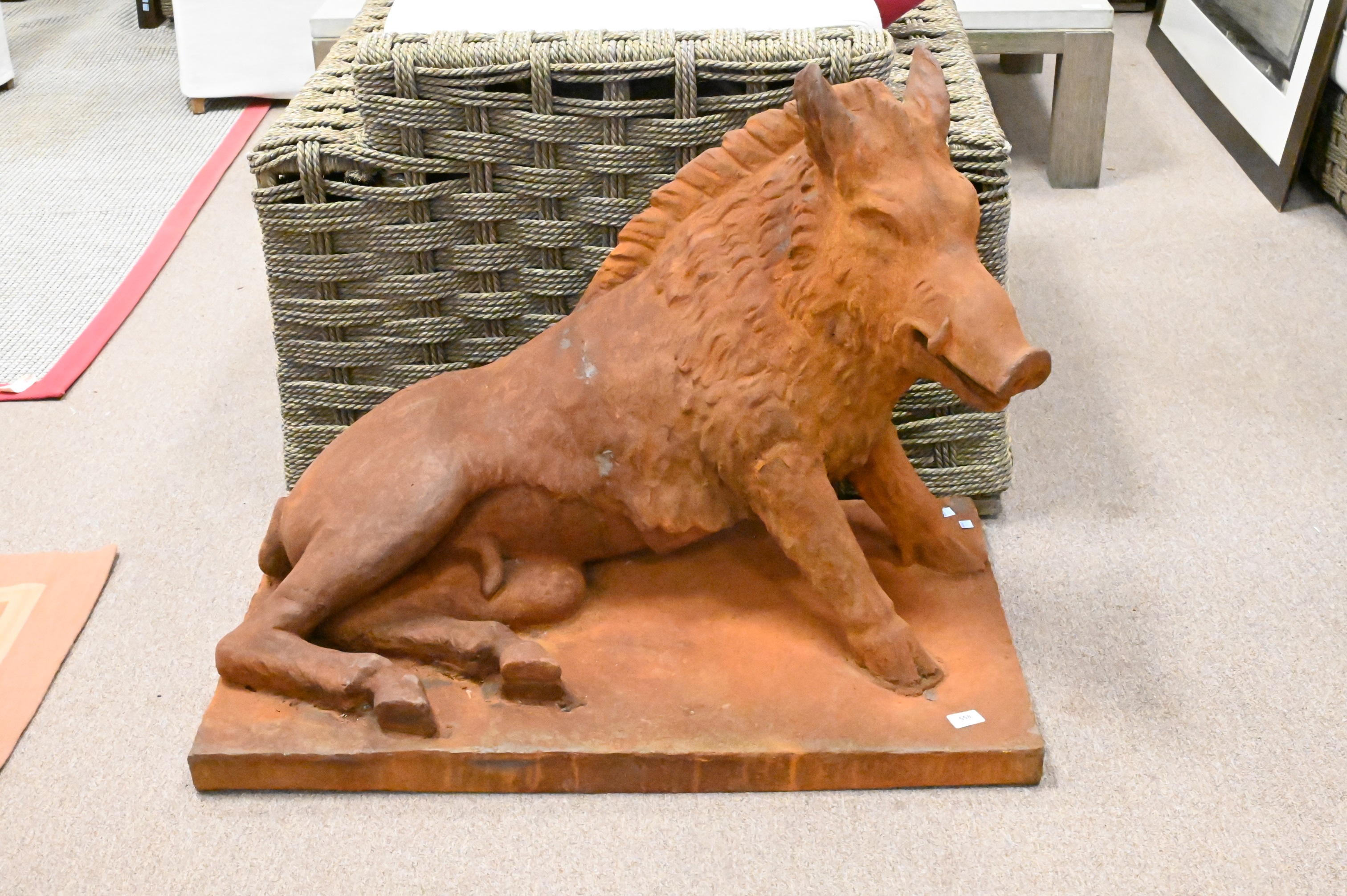Iron Outdoor Recumbent Boar, set on iron base, weathered, height 31 inches, base width 38 1/2 inches, depth 23 inches.