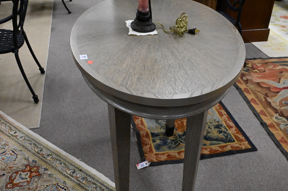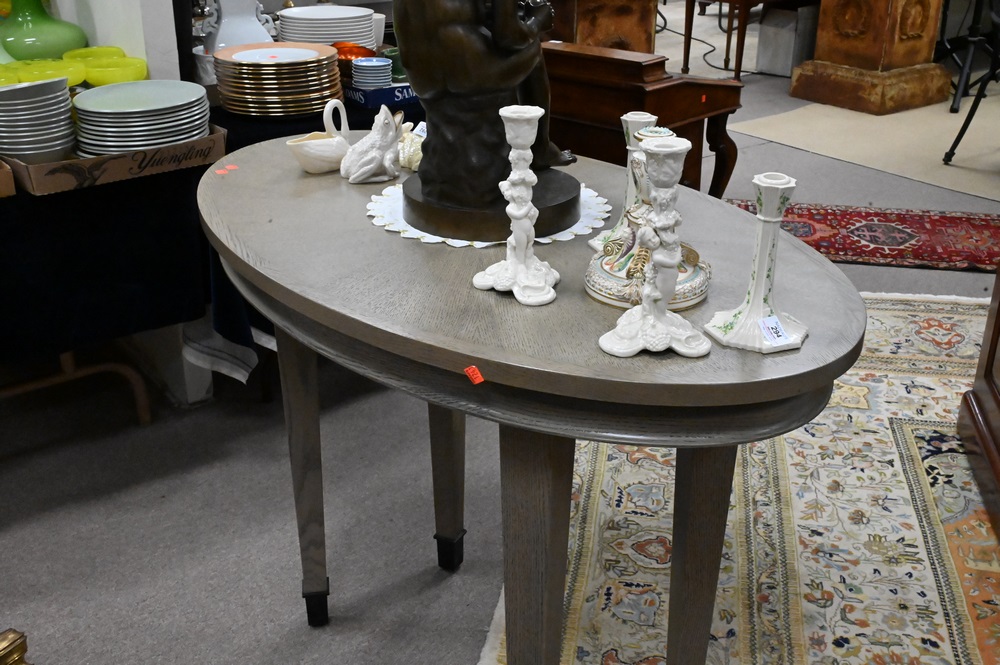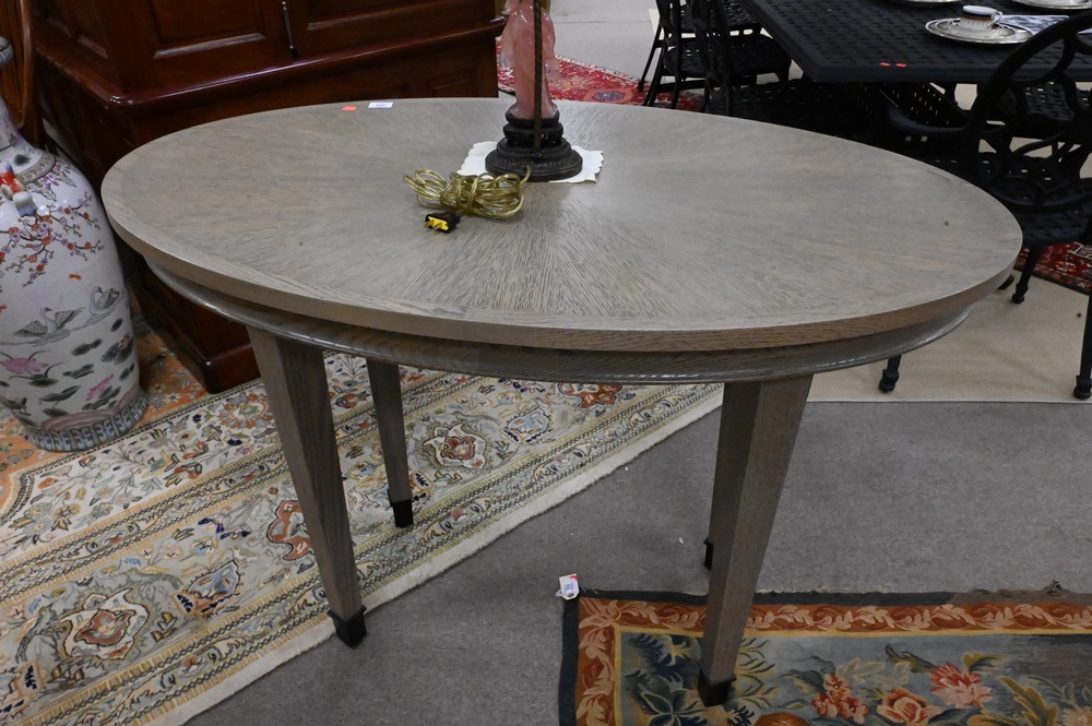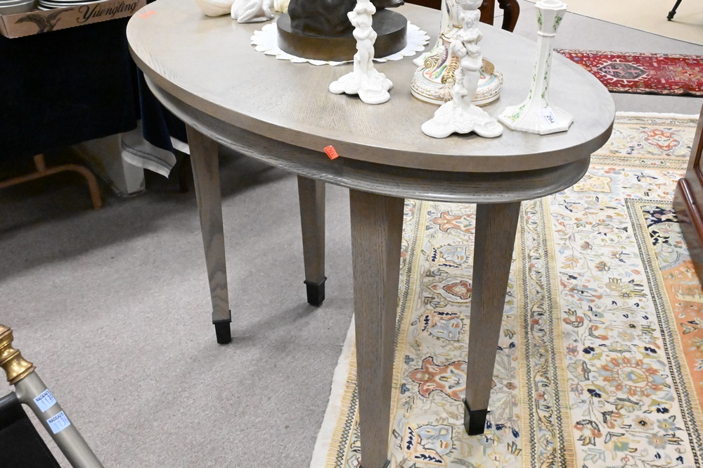 Lot 558: Pair of Contemporary Oval Tables, oak having pickled grey finish, height 34 1/2 inches, top 28″ x 48″.