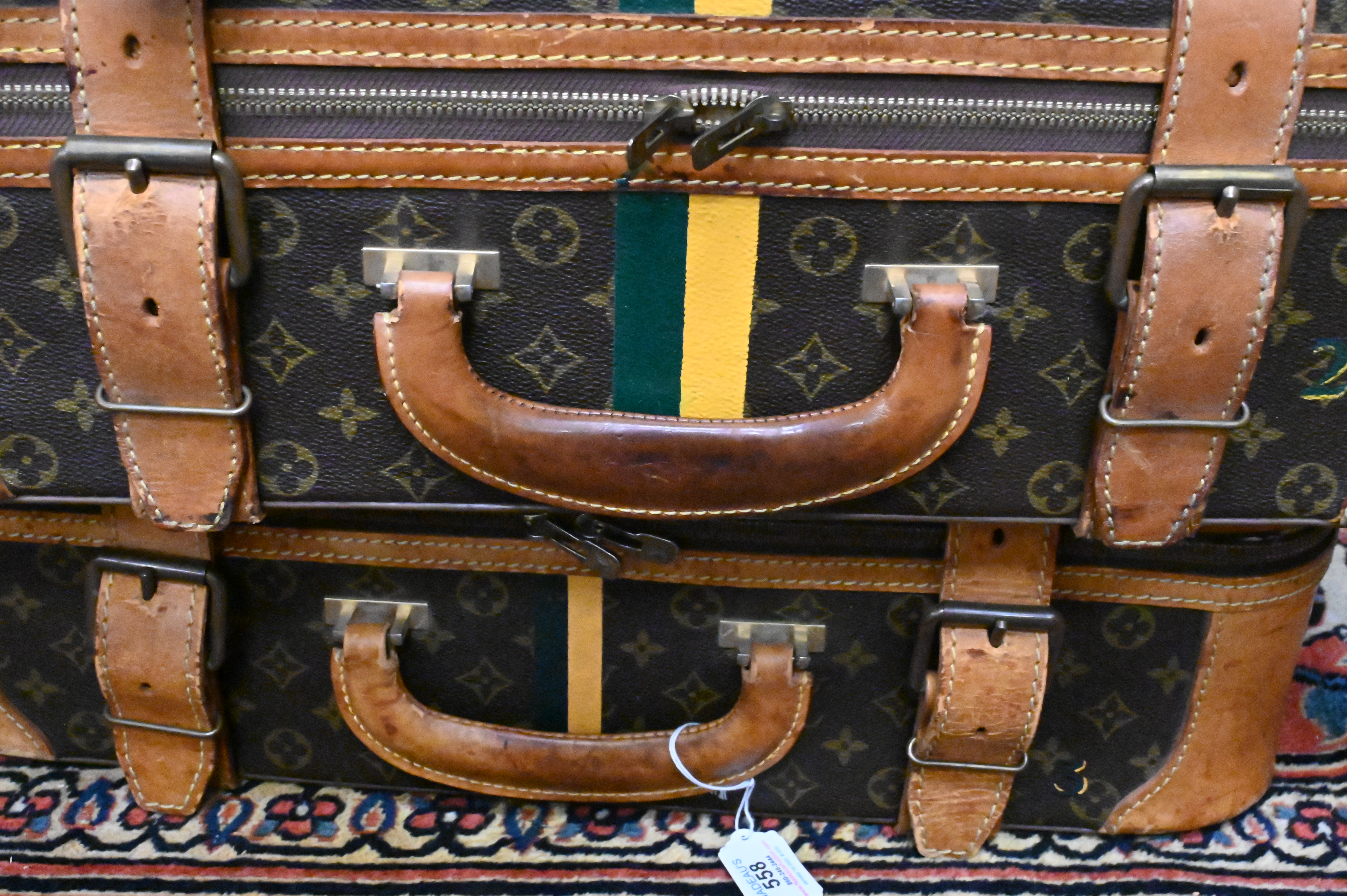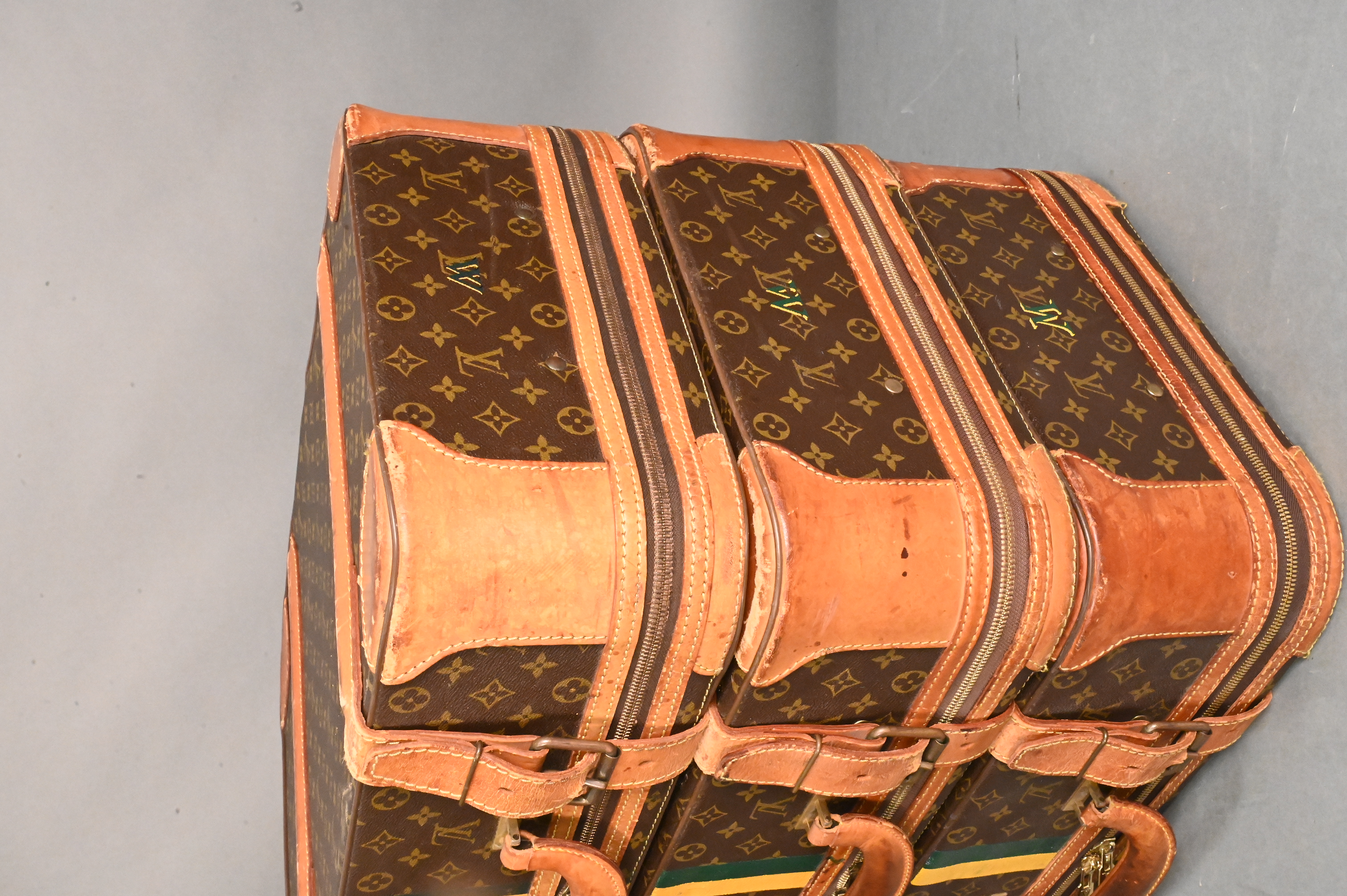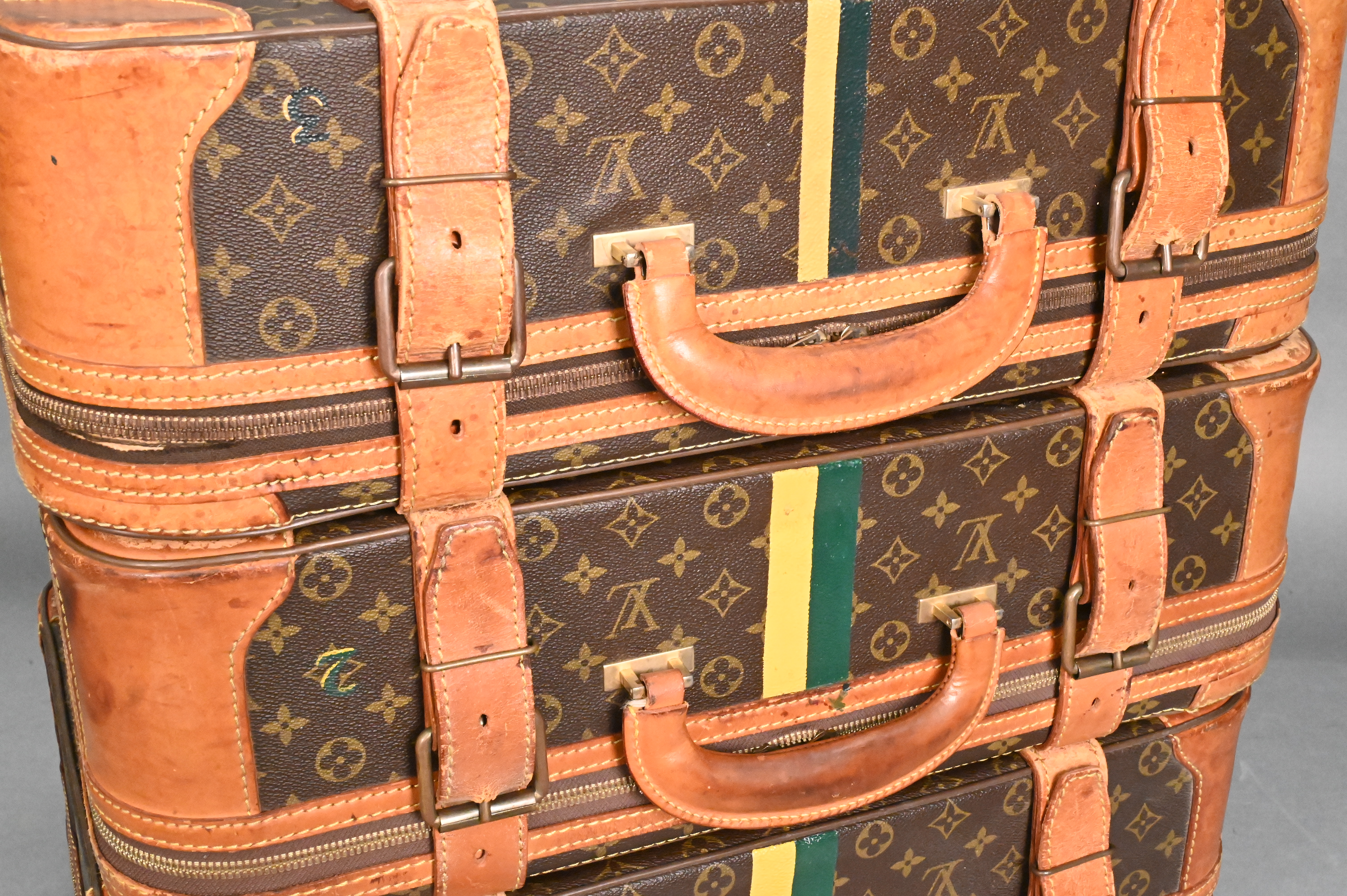 Three Louis Vuitton Suitcases having leather straps and corners largest: height 7 1/2 inches, top 23″ x 16″