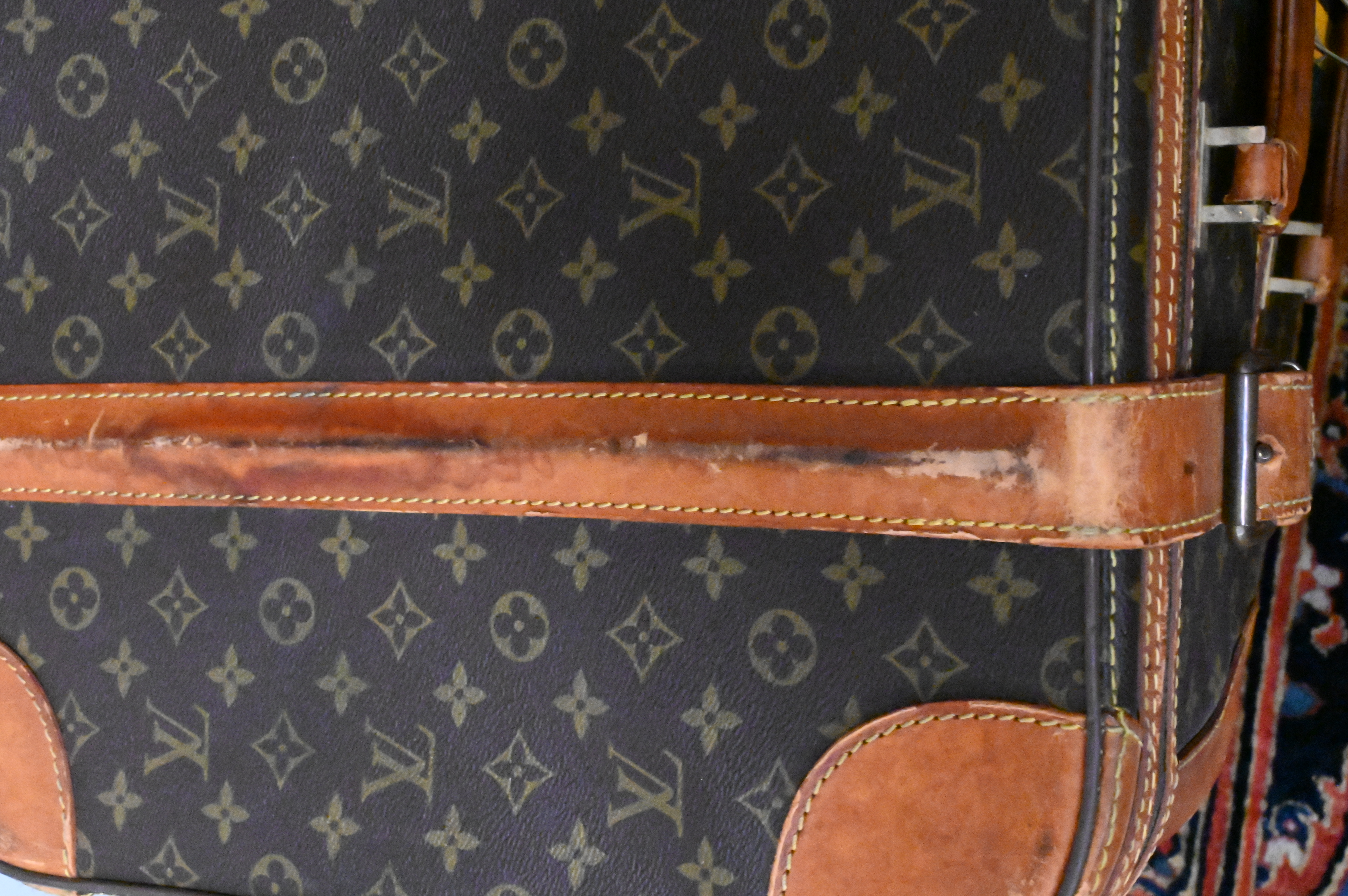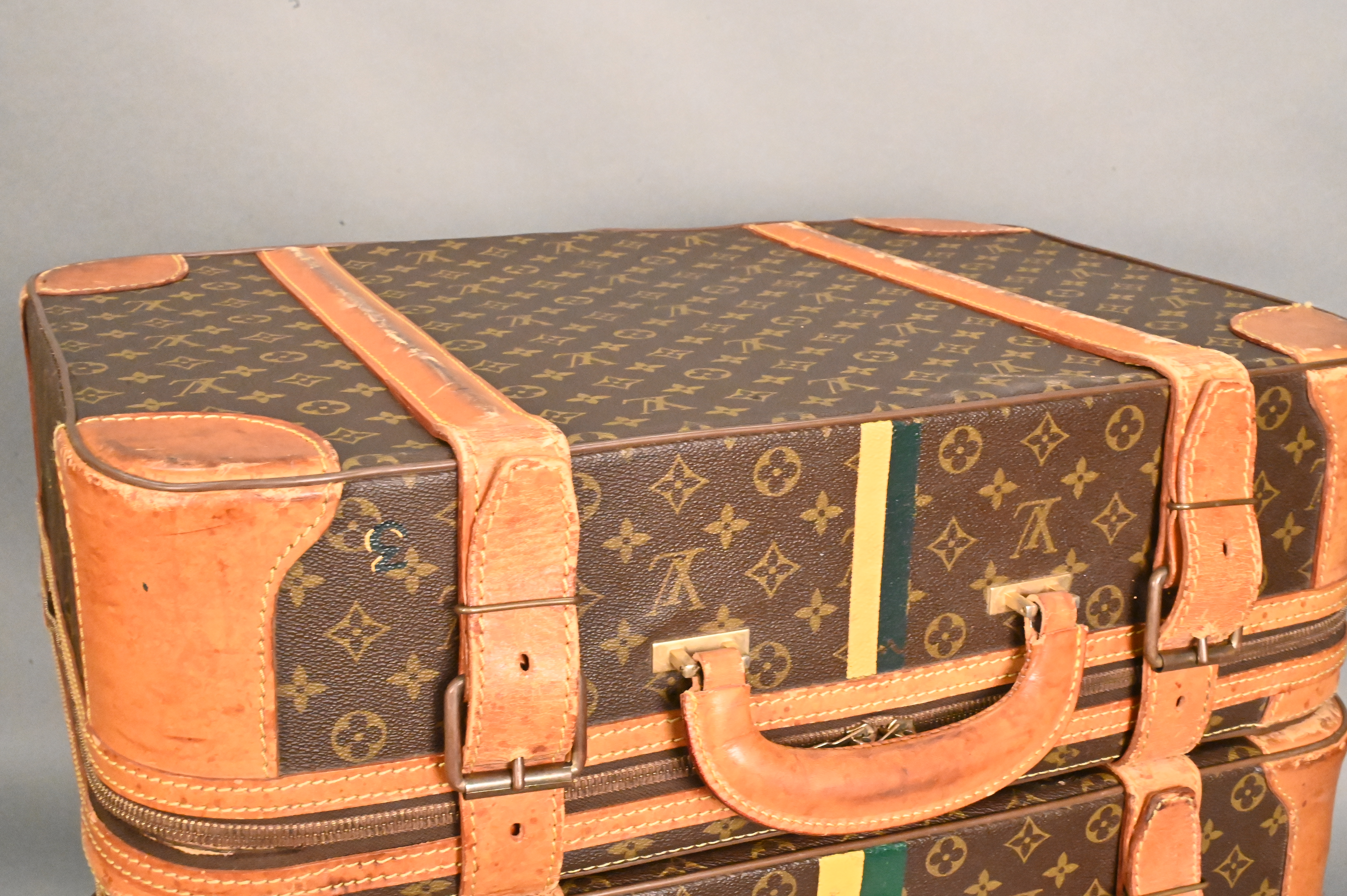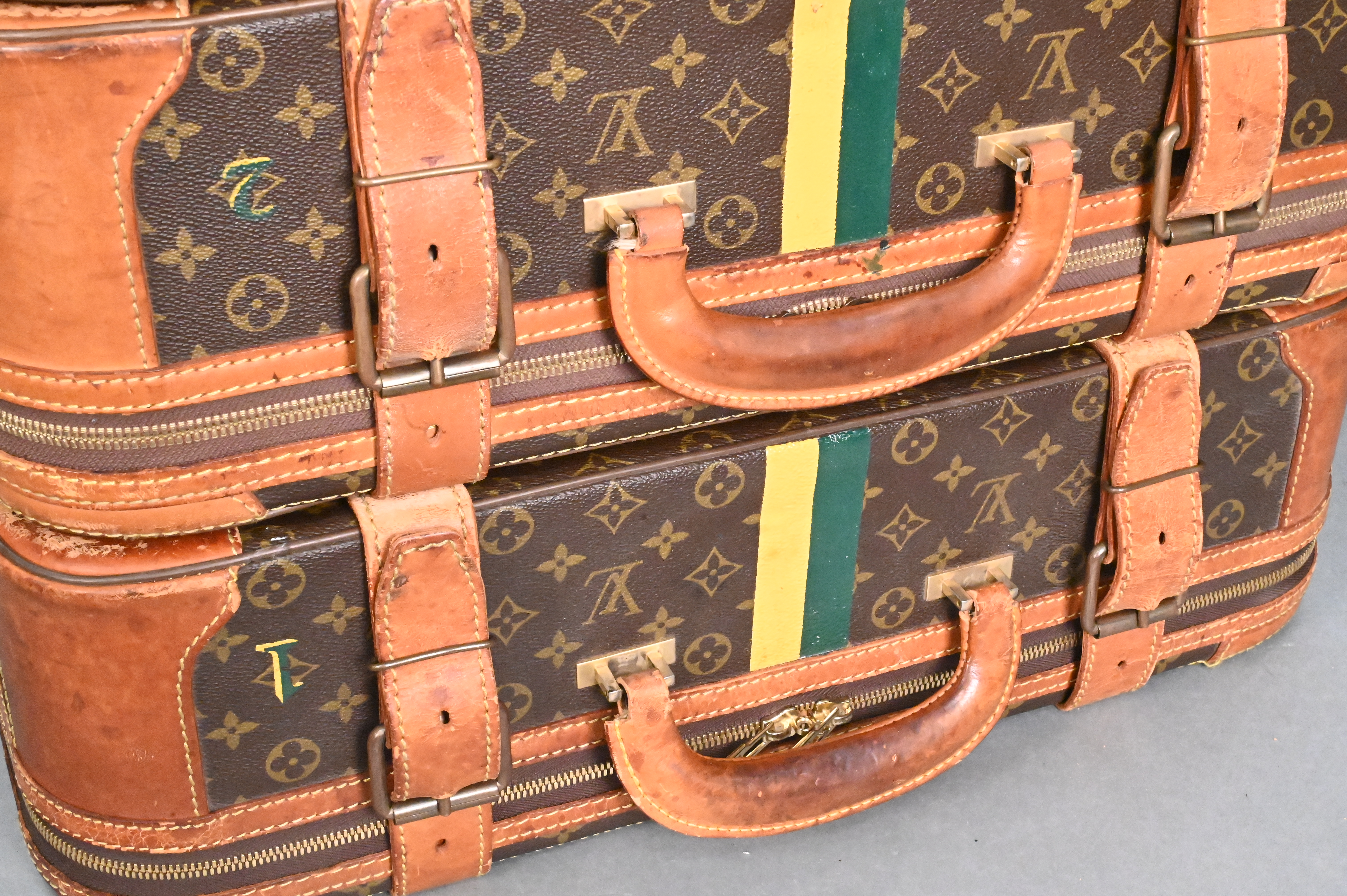 Three Louis Vuitton Suitcases having leather straps and corners largest: height 7 1/2 inches, top 23″ x 16″