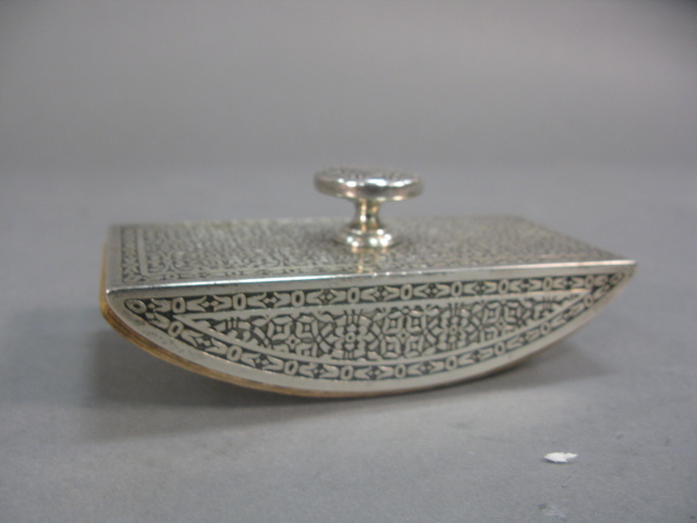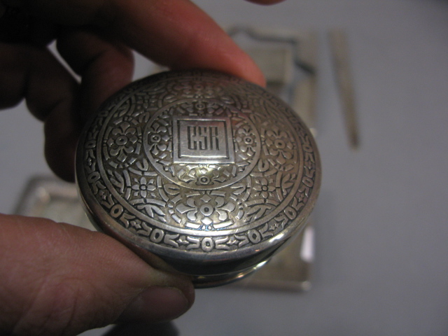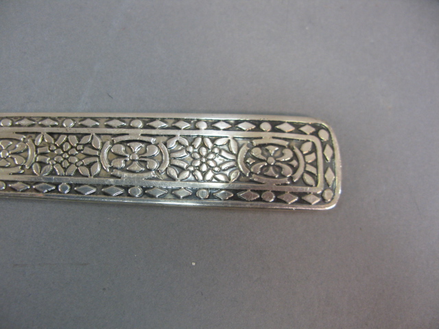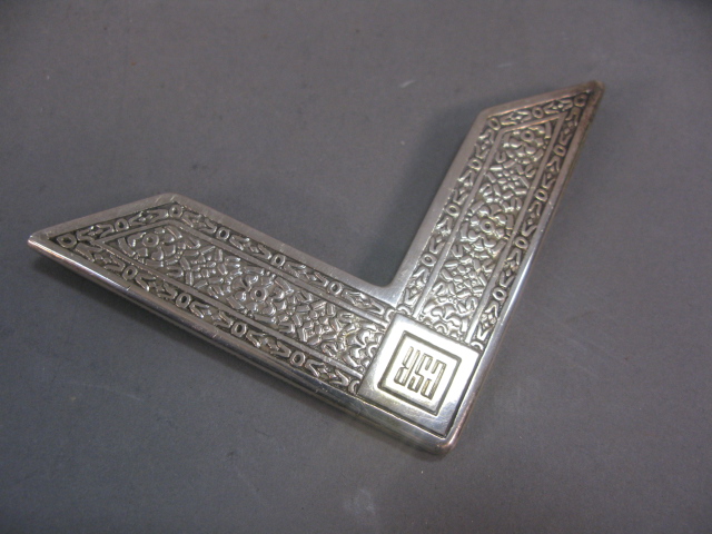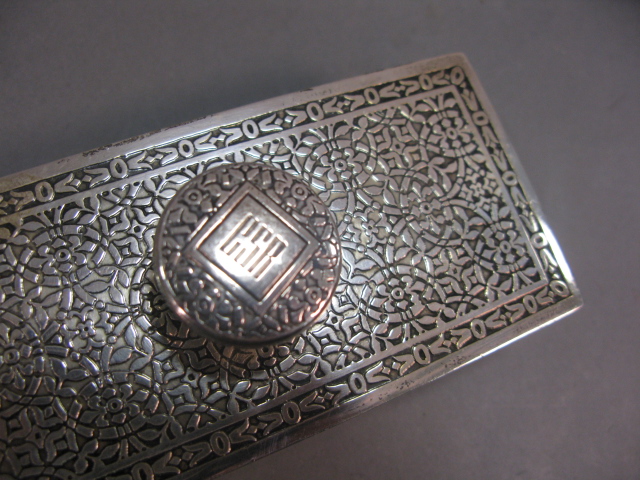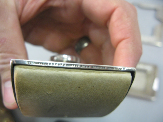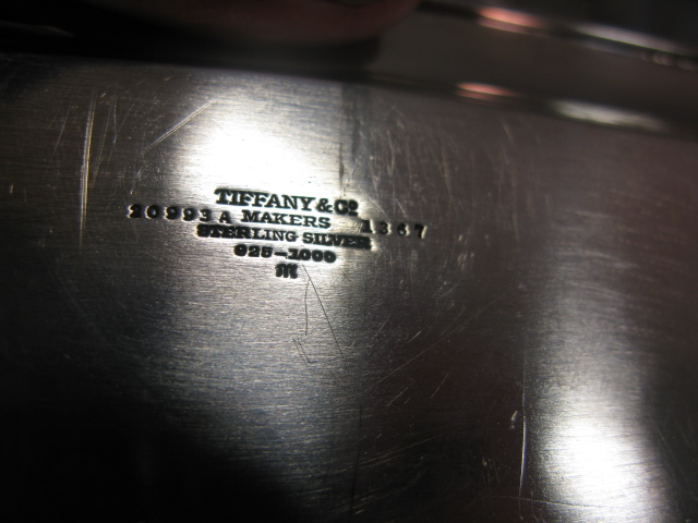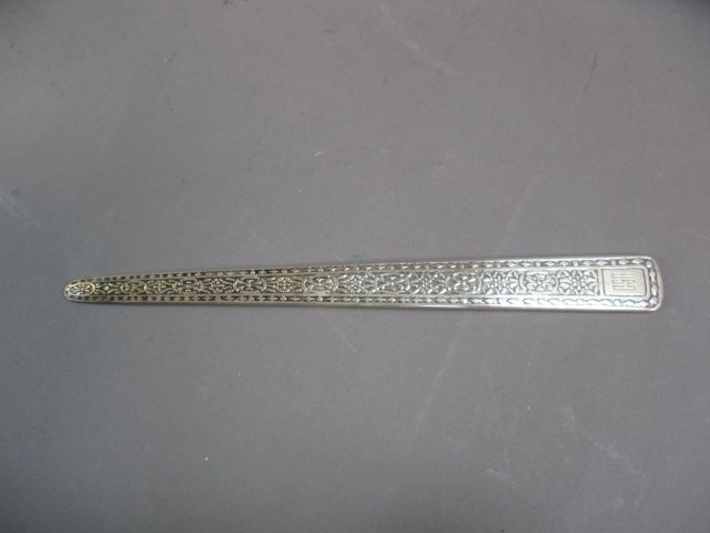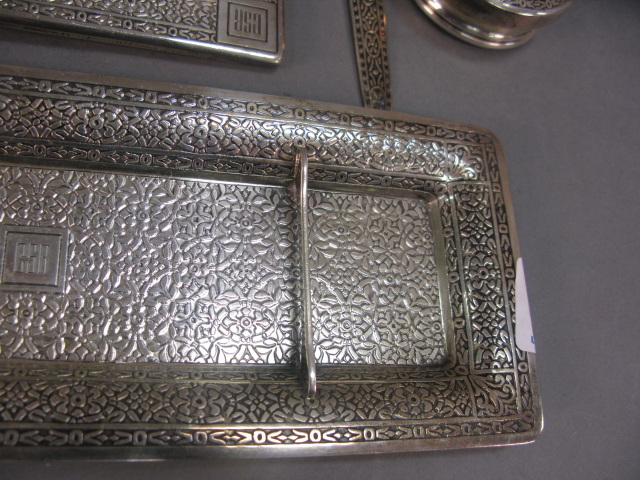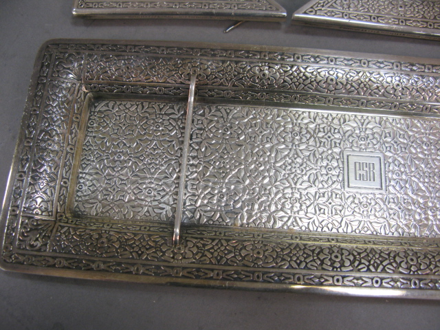 Tiffany and Company sterling silver eight piece desk set with four blotter corners, pen tray, letter opener, roller and inkwell cover, monogrammed. Provenance: Governor Henry Roberts Edward Roberts 1110 Prospect Ave Hartford to present owner.