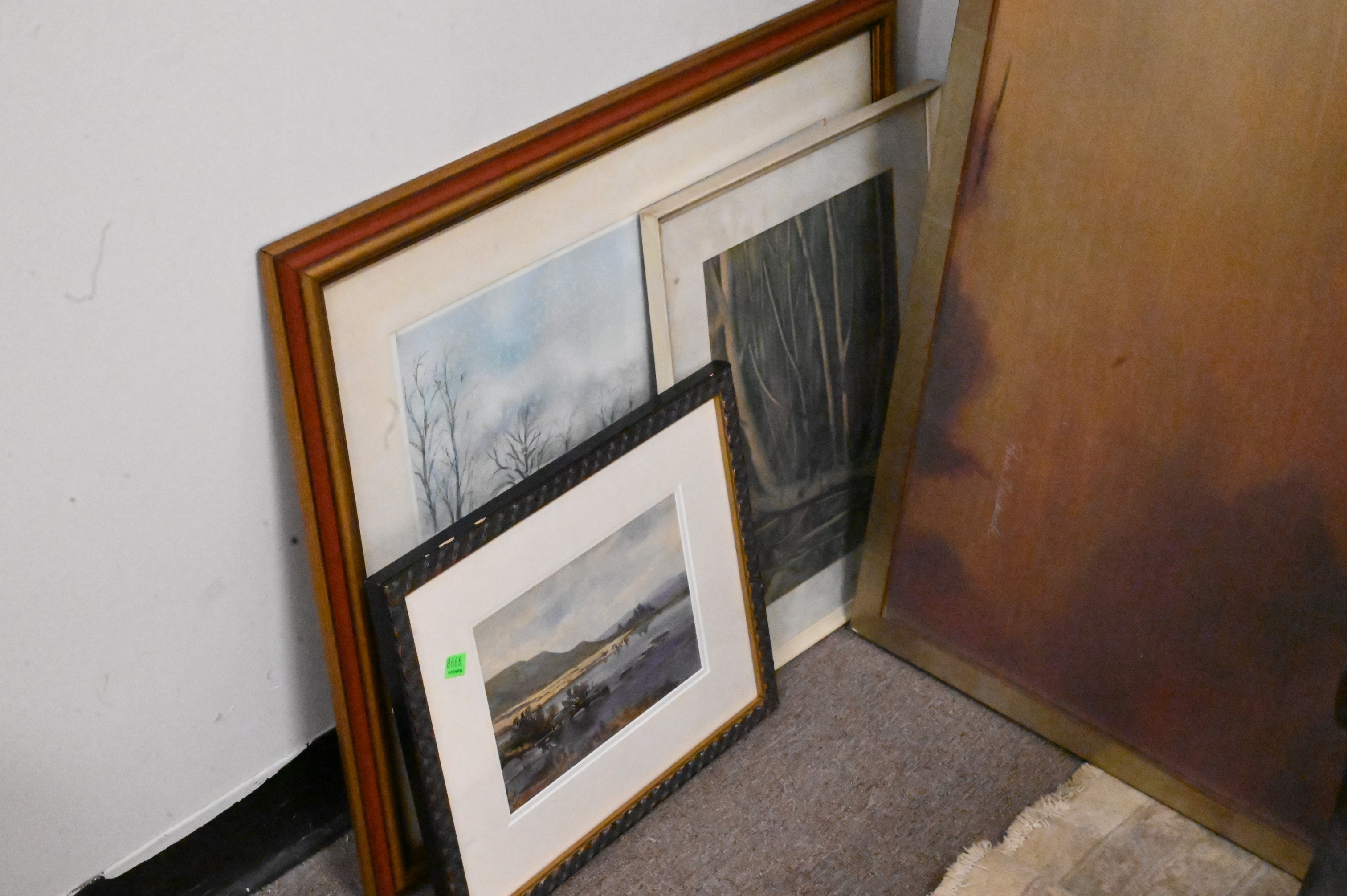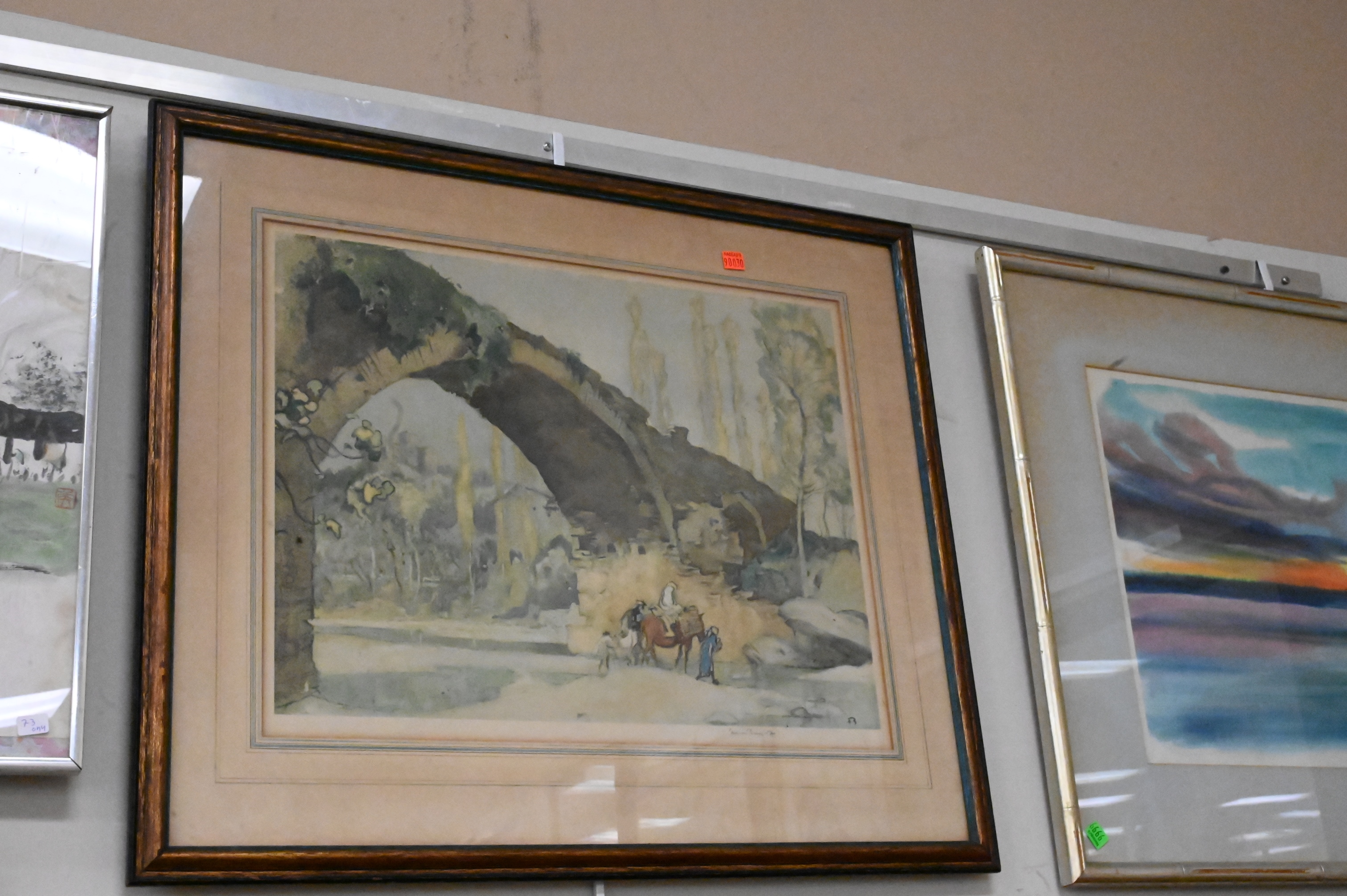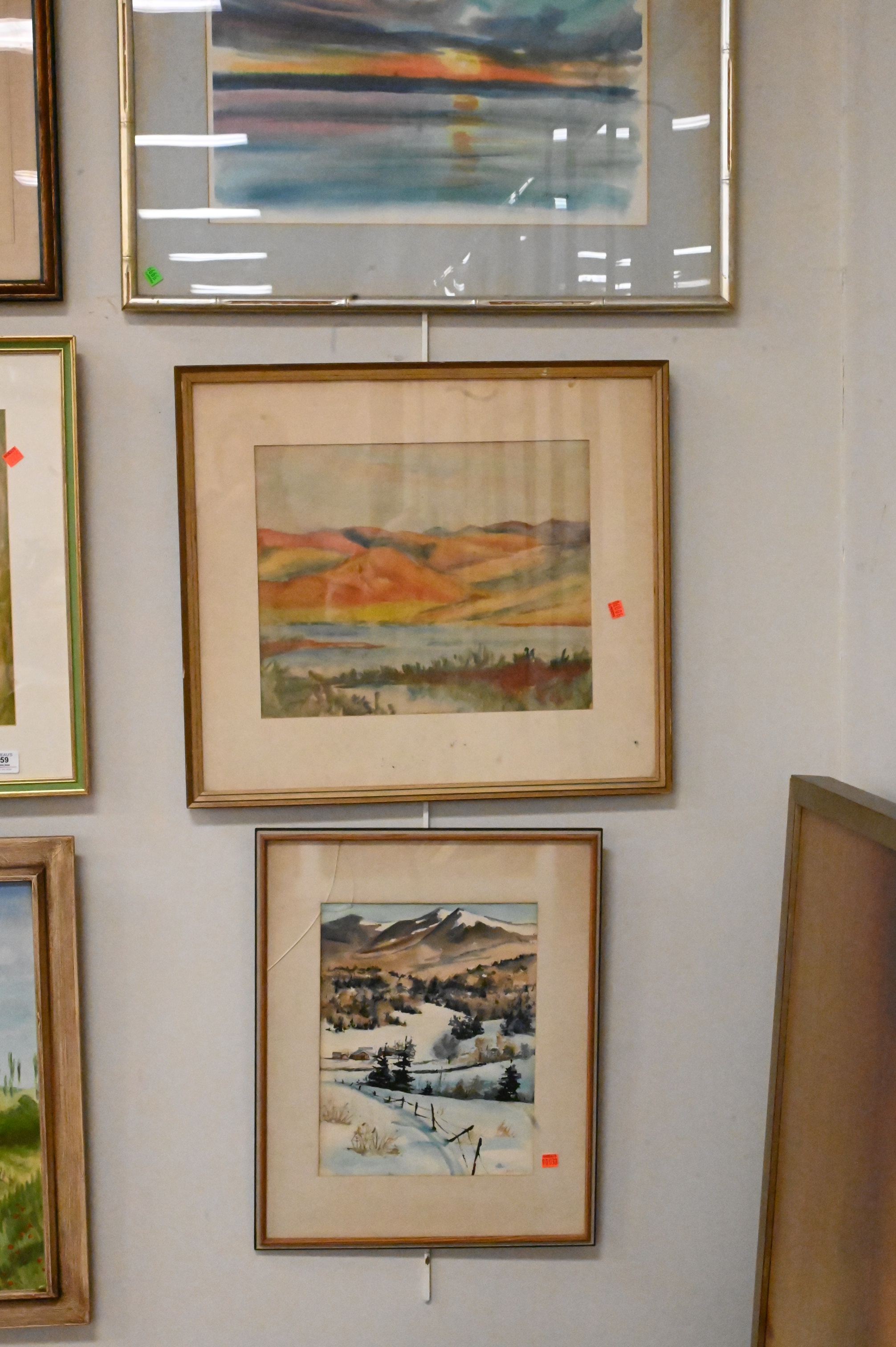 Large Grouping, to include eight framed landscape pieces, a winter watercolor, signed lower right “IBBETS ’70”; a pond watercolor signed illegibly lower left; a winter barn watercolor signed Julia Bryce; a finger painting titled “Mystic Wood”, signed lower right Louise Favies Webber; an unsigned oil on board of a beach with red flowers; ocean sunset watercolor signed Norma B.; an illegibly signed watercolor titled “Swamp Wren” of birds in cattails; a watercolor by Bridget D.M. Busk titled “Lake South of Ankora, Turkey” 1943 of a lake and hills; along with a print of travelers under a bridge, after Frank Brangwyn (1867 – 1956); largest 19 1/2″ x 24″; along with a large abstract landscape, oil on canvas, and a large floral print.