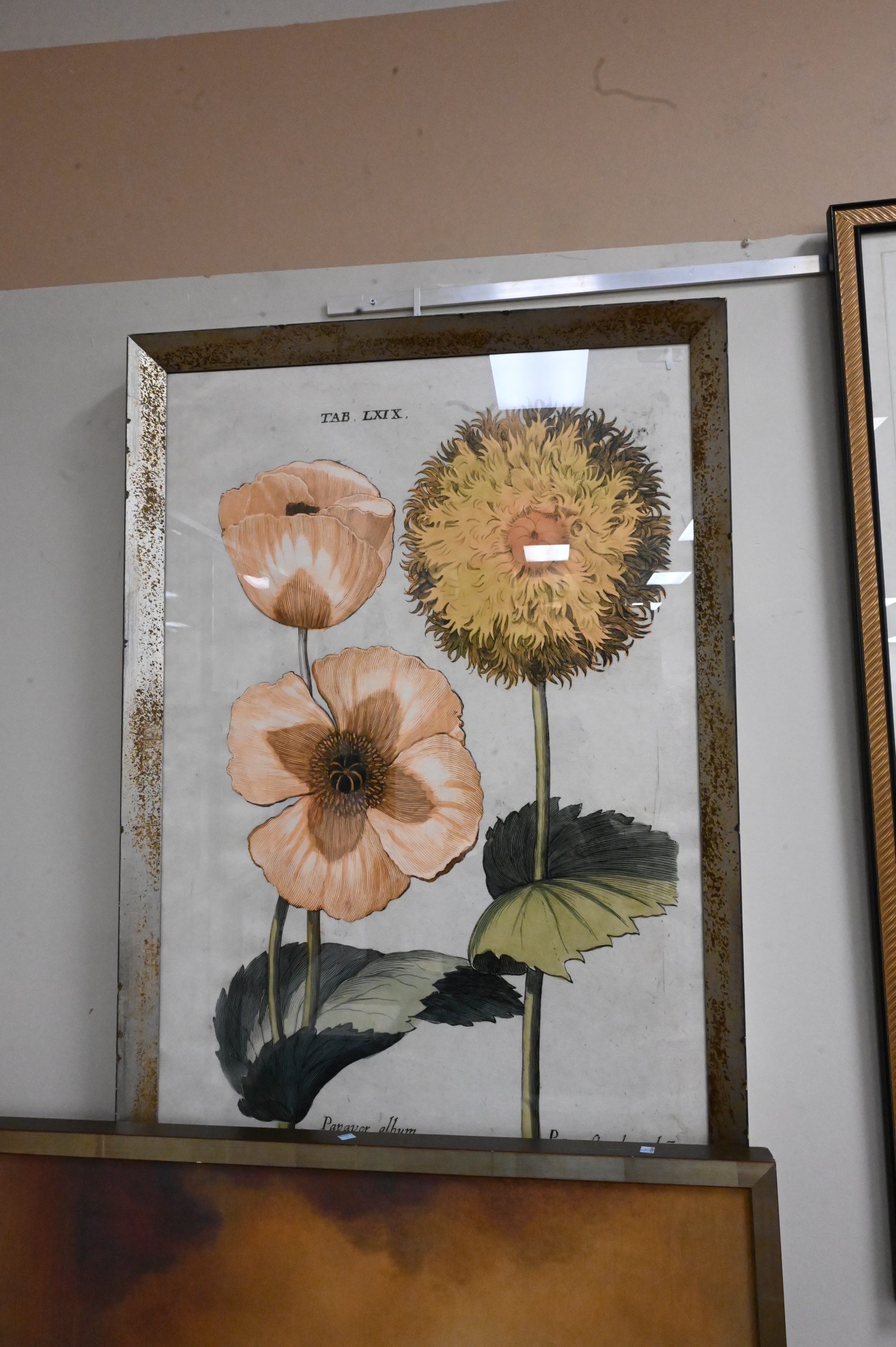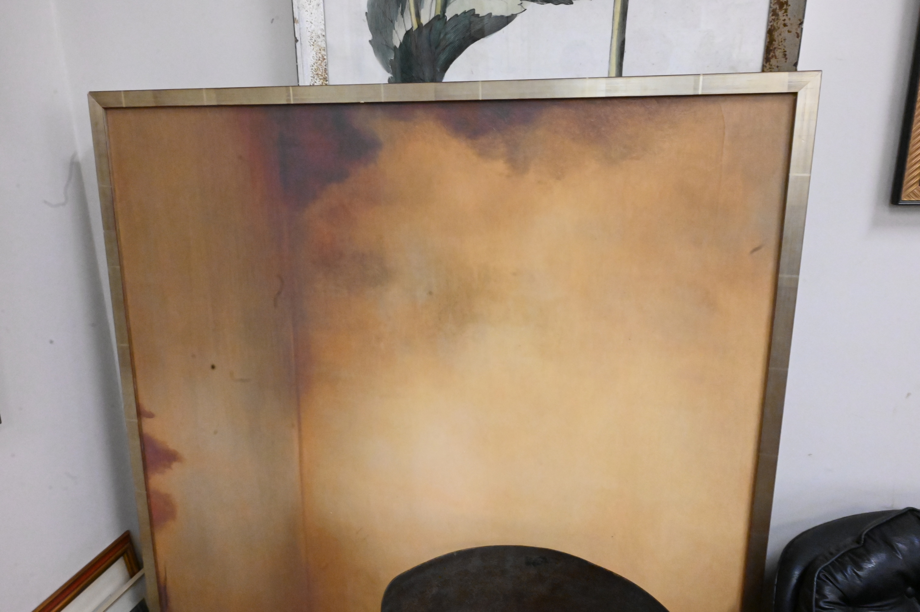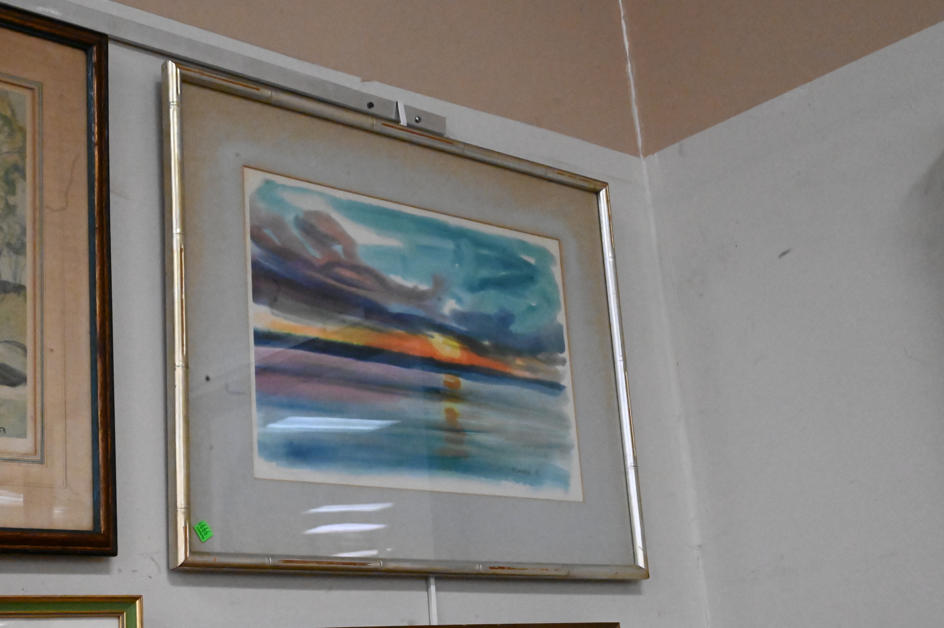 Large Grouping, to include eight framed landscape pieces, a winter watercolor, signed lower right “IBBETS ’70”; a pond watercolor signed illegibly lower left; a winter barn watercolor signed Julia Bryce; a finger painting titled “Mystic Wood”, signed lower right Louise Favies Webber; an unsigned oil on board of a beach with red flowers; ocean sunset watercolor signed Norma B.; an illegibly signed watercolor titled “Swamp Wren” of birds in cattails; a watercolor by Bridget D.M. Busk titled “Lake South of Ankora, Turkey” 1943 of a lake and hills; along with a print of travelers under a bridge, after Frank Brangwyn (1867 – 1956); largest 19 1/2″ x 24″; along with a large abstract landscape, oil on canvas, and a large floral print.