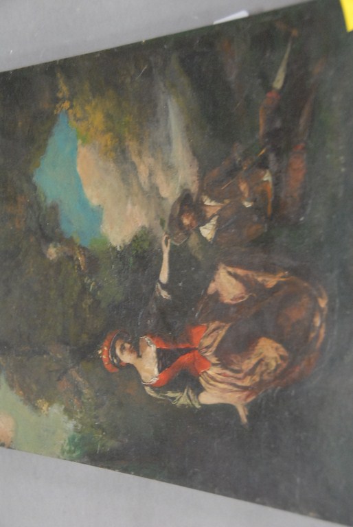 Oil on board painting, romantic scene on cribbed board. 14 1/4 x 10 1/4