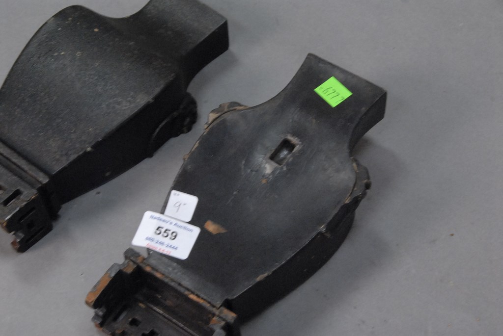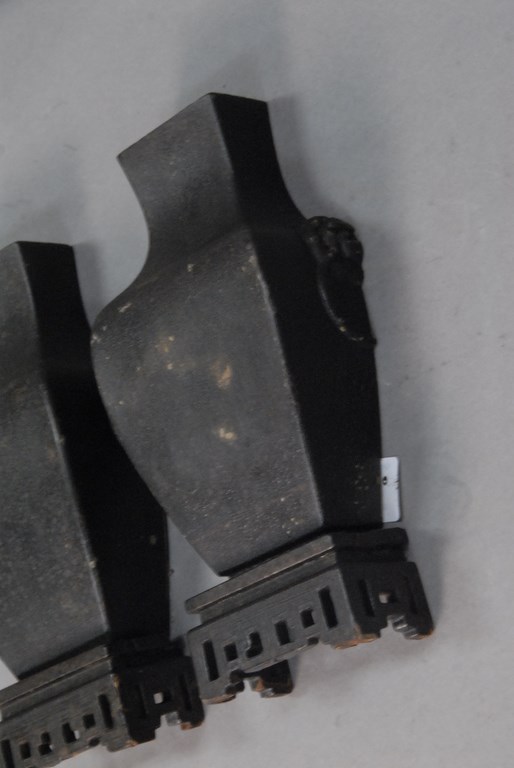 Lot 559: Pair of Chinese metal wall pocket vases on carved wood bases. ht. 9in.