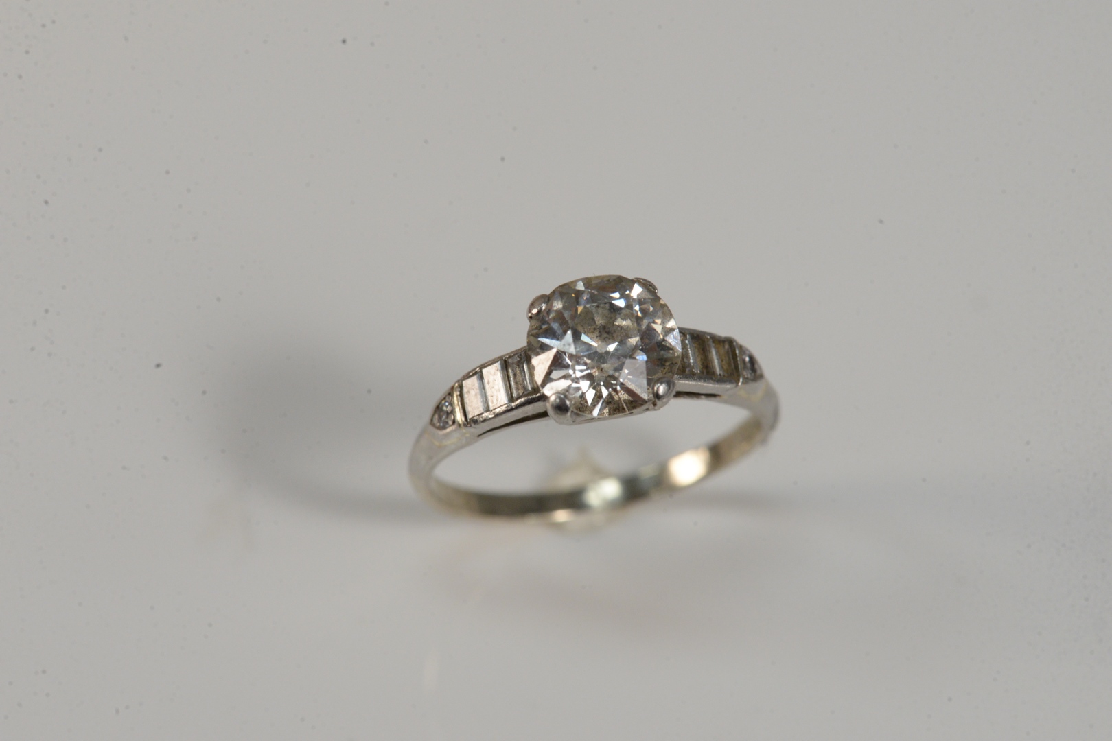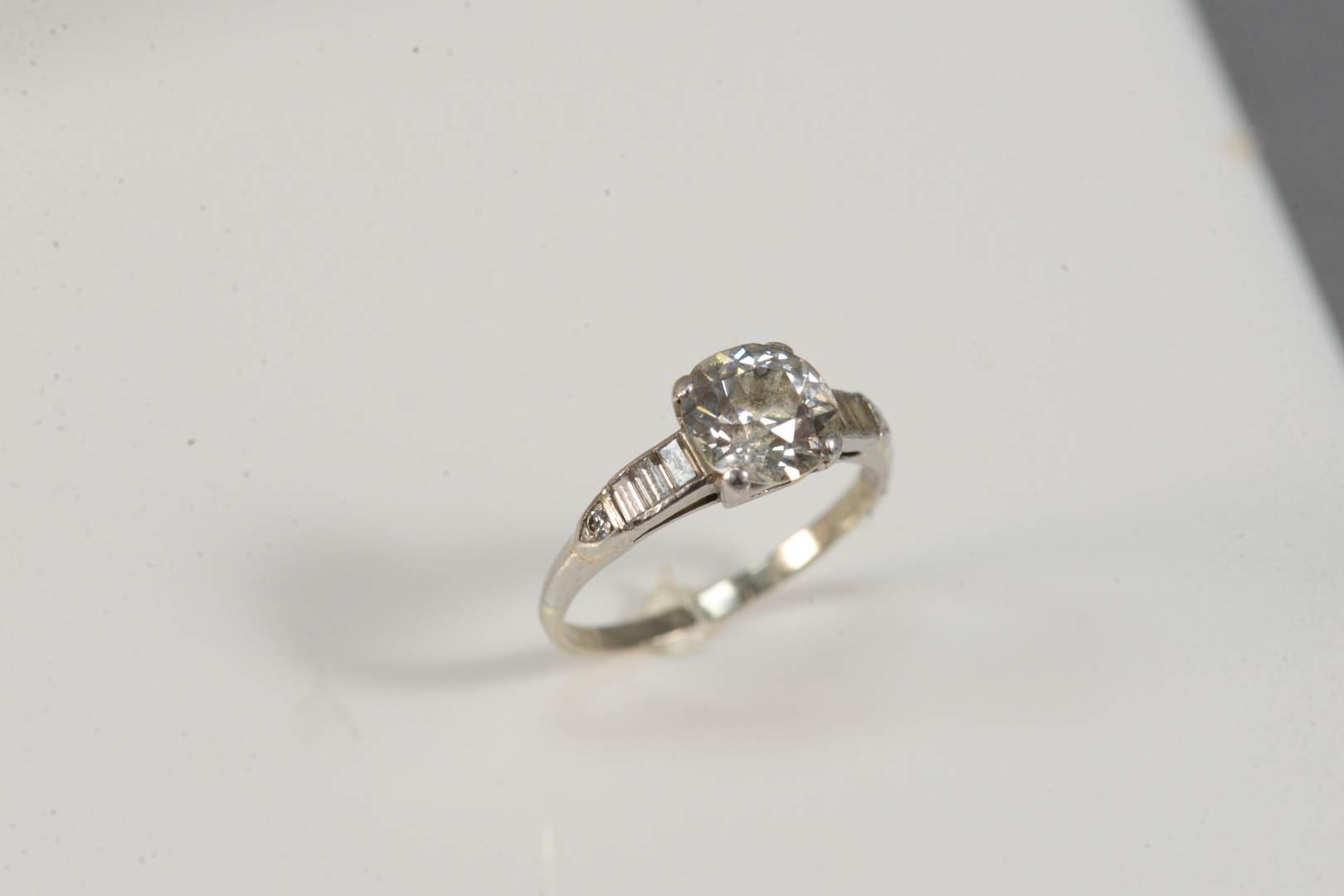 Lot 56: 14 Karat White Gold Ring set with center 1.75 carat diamond flanked by baguettes 7.5 millimeters