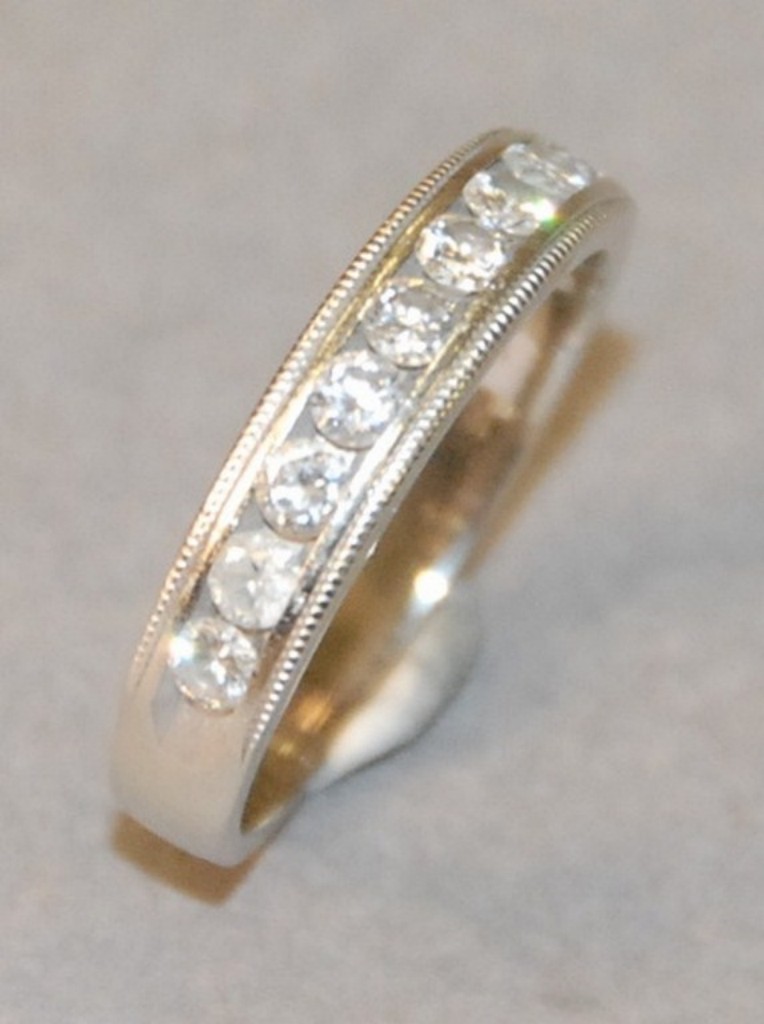 14kt white gold and diamond wedding band, set with nine diamonds. size 7 1/2