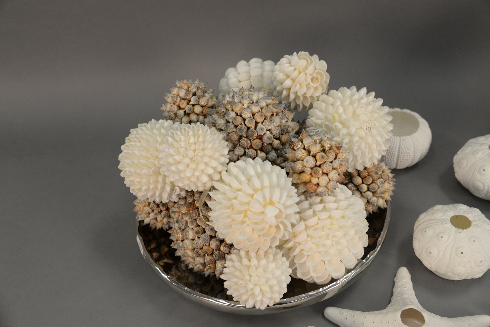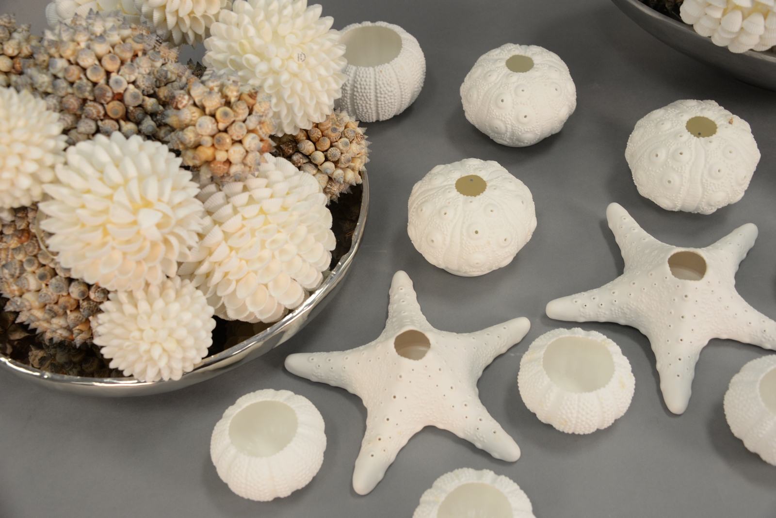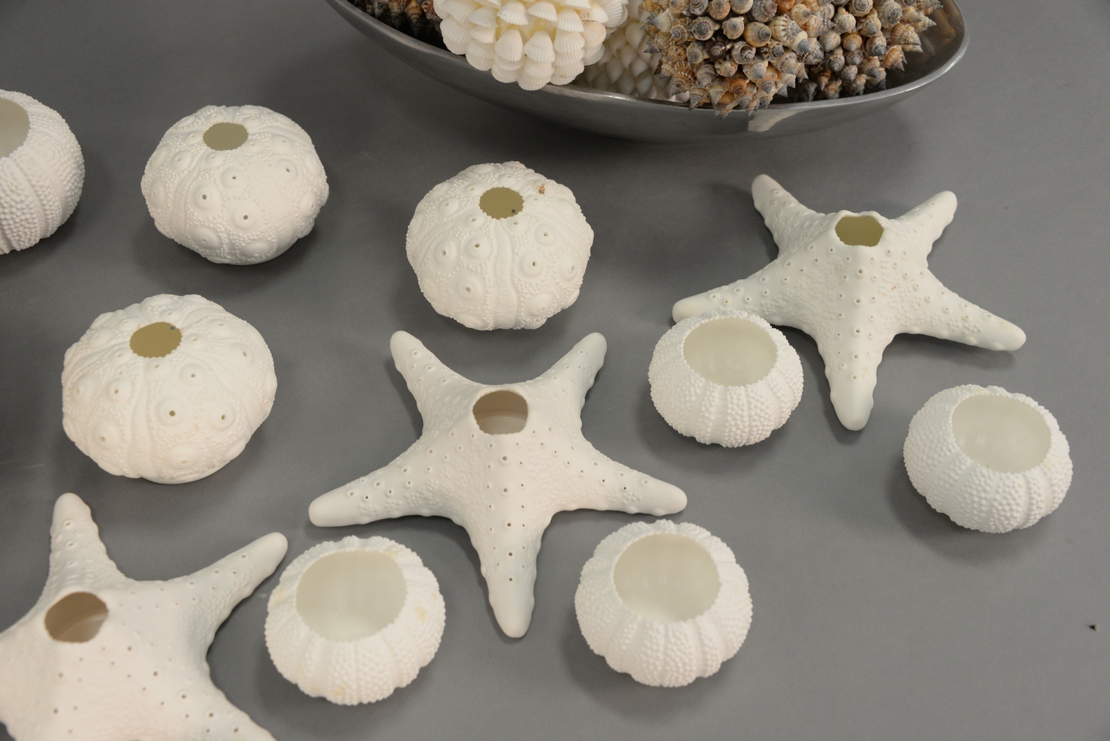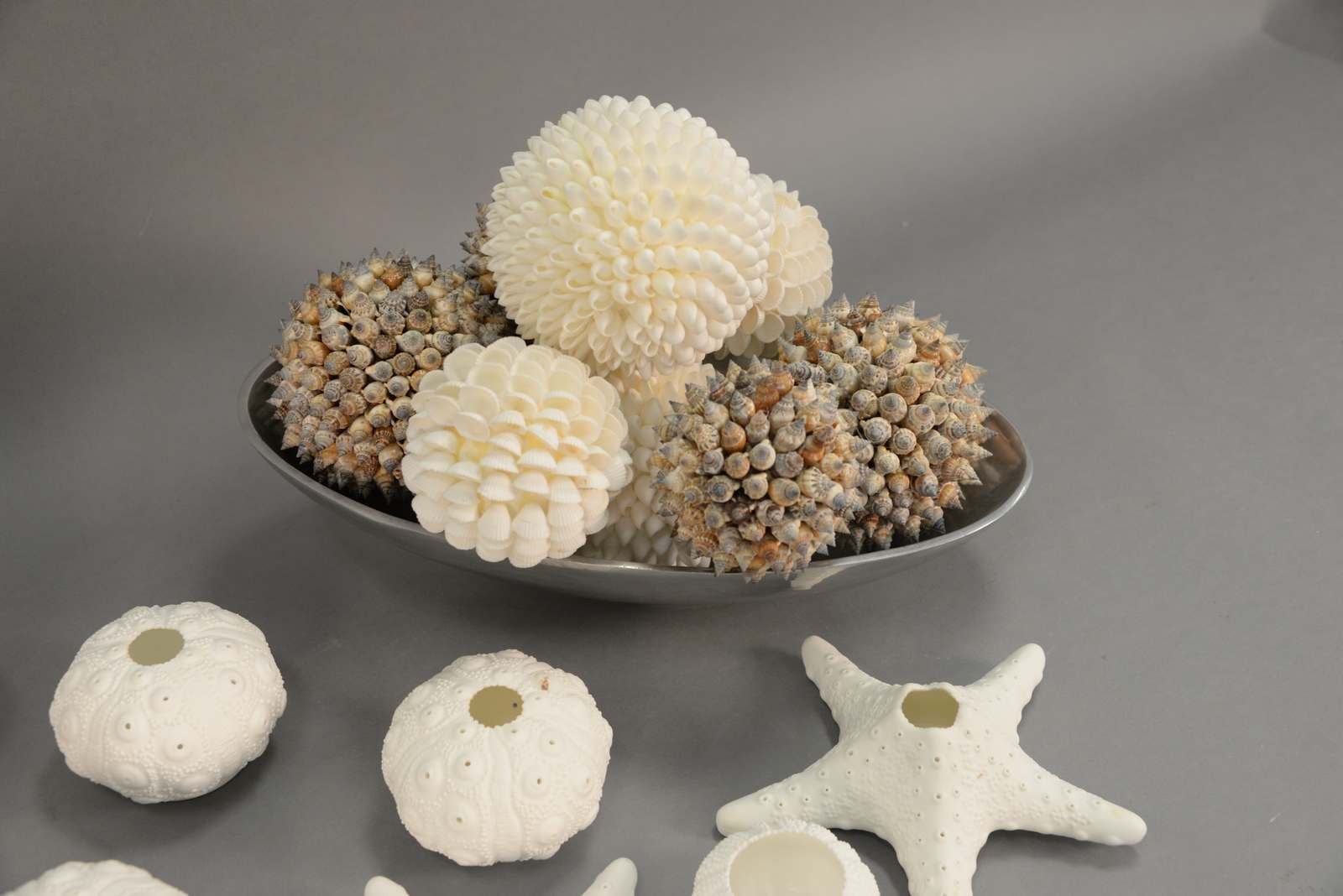 Beach seashell decorative dcor group having two bowls with round seashell balls dia. 3in. to 5 1/2in. and a group of 13 Roost porcelain sea life candle votive/tea light holders in the shape of sea urchins and starfish.