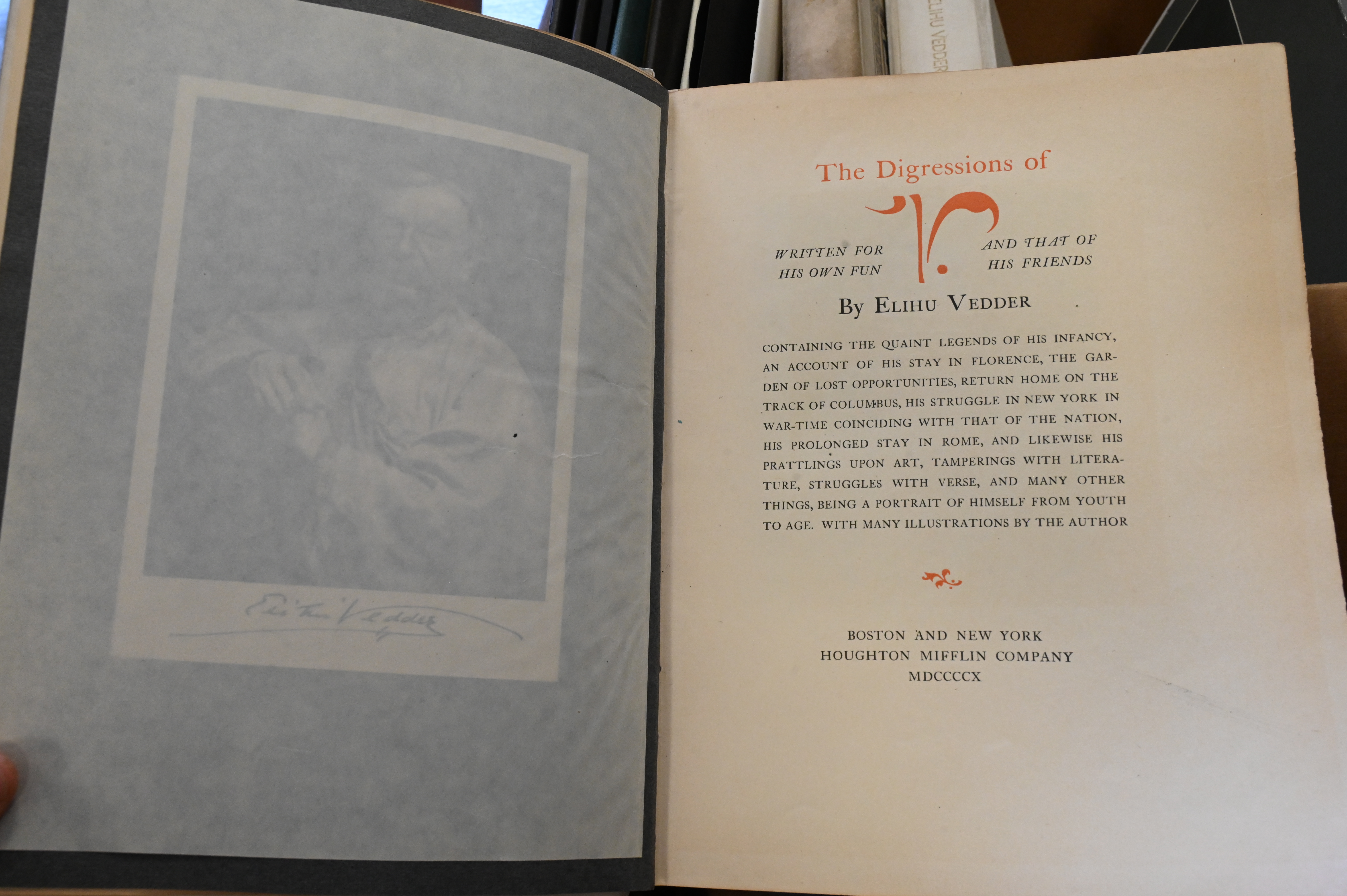 The Digressions of V: Written for That of His Own Fun and That of His Friends Volumes I and II by Elihu Vedder, published 1910, edition number 146, signed in pen