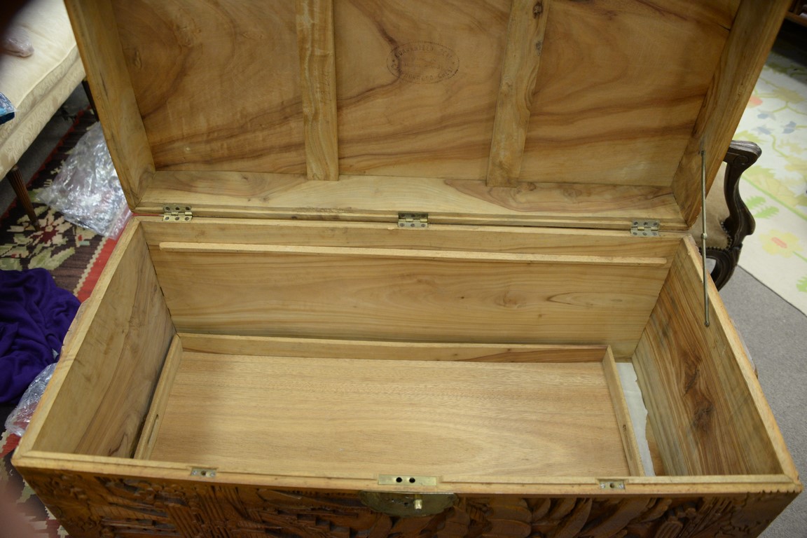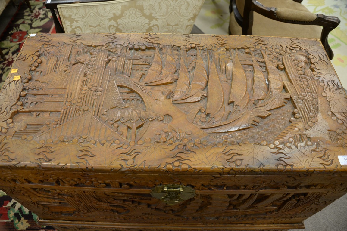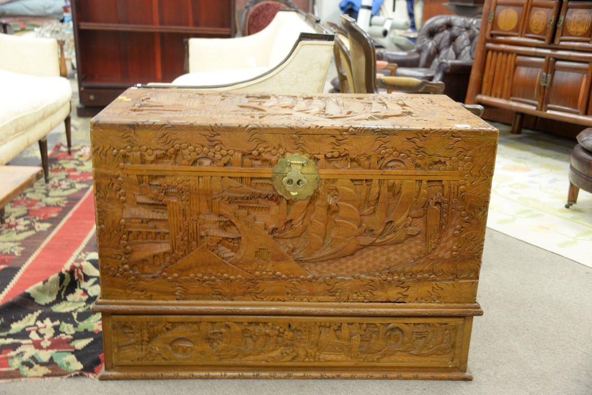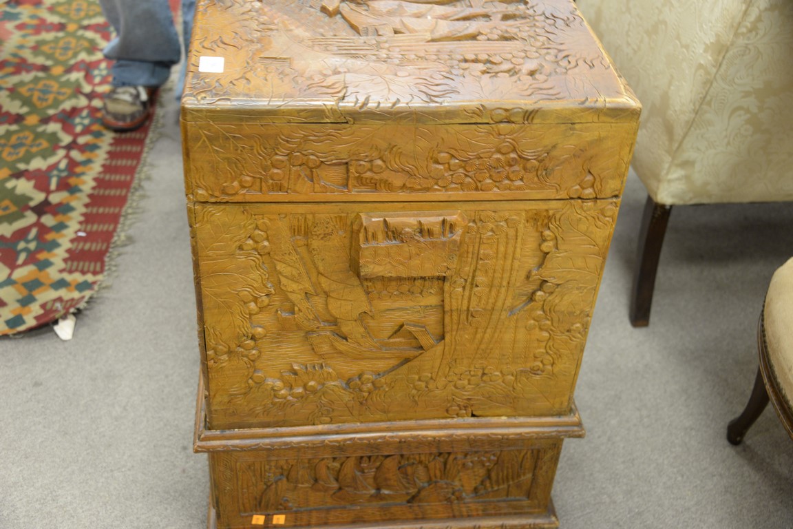 Carved camphorwood Chinese cheston base with a drawer. ht. 20in., wd. 40in., dp. 20in.