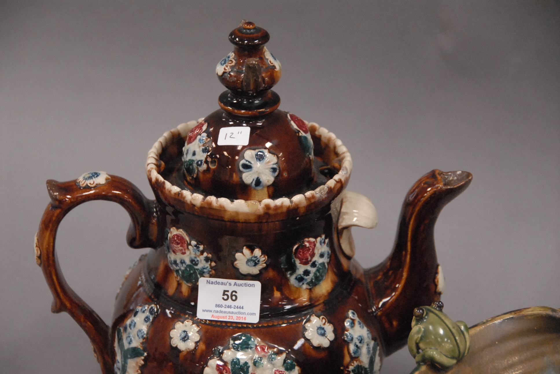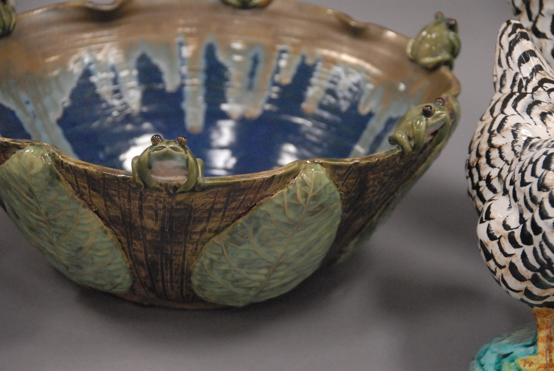Lot 56: Five glazed decorative pieces to include a brown glazed pitcher, large frog bowl, two roosters, and a leaf bowl.