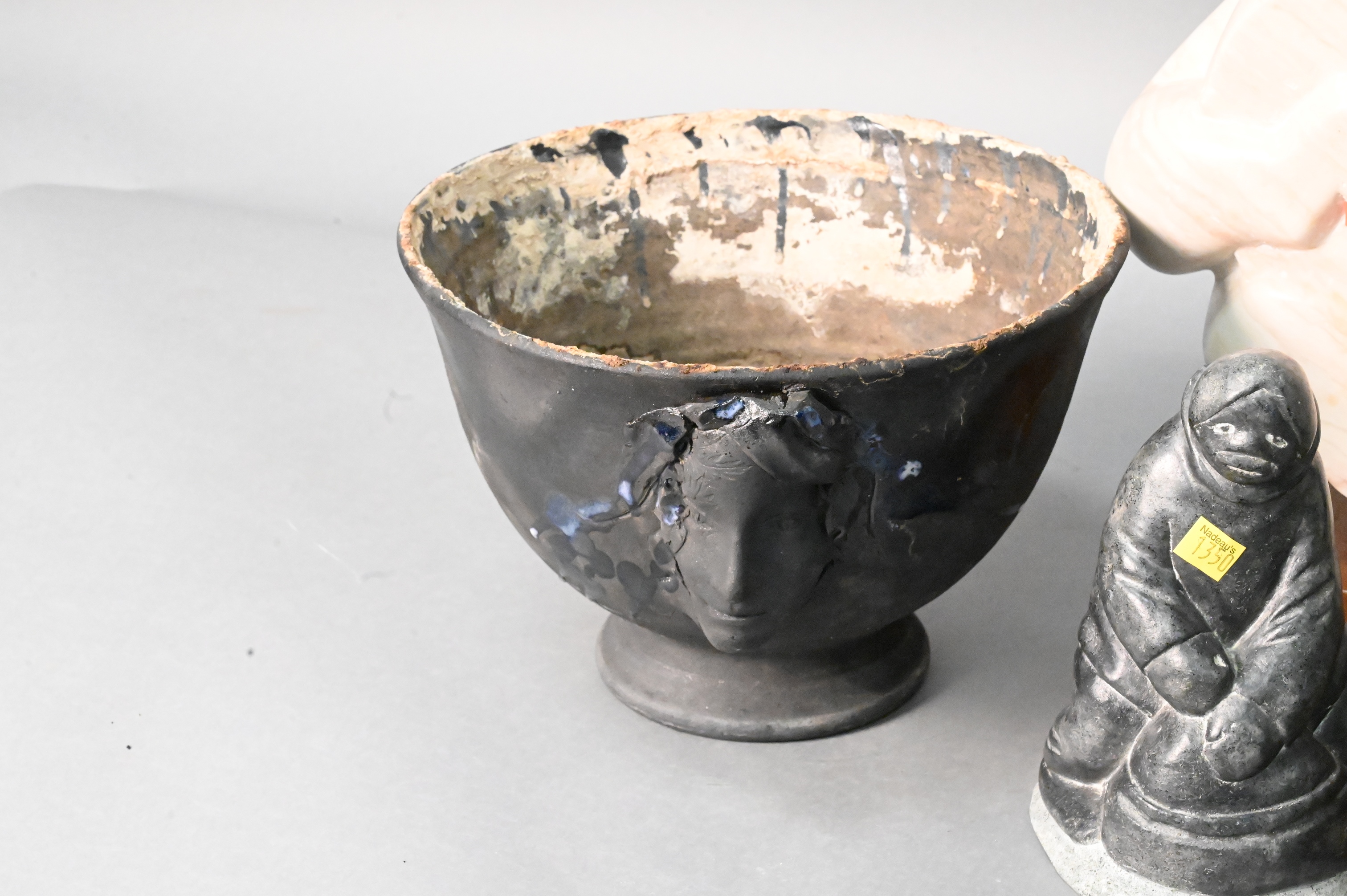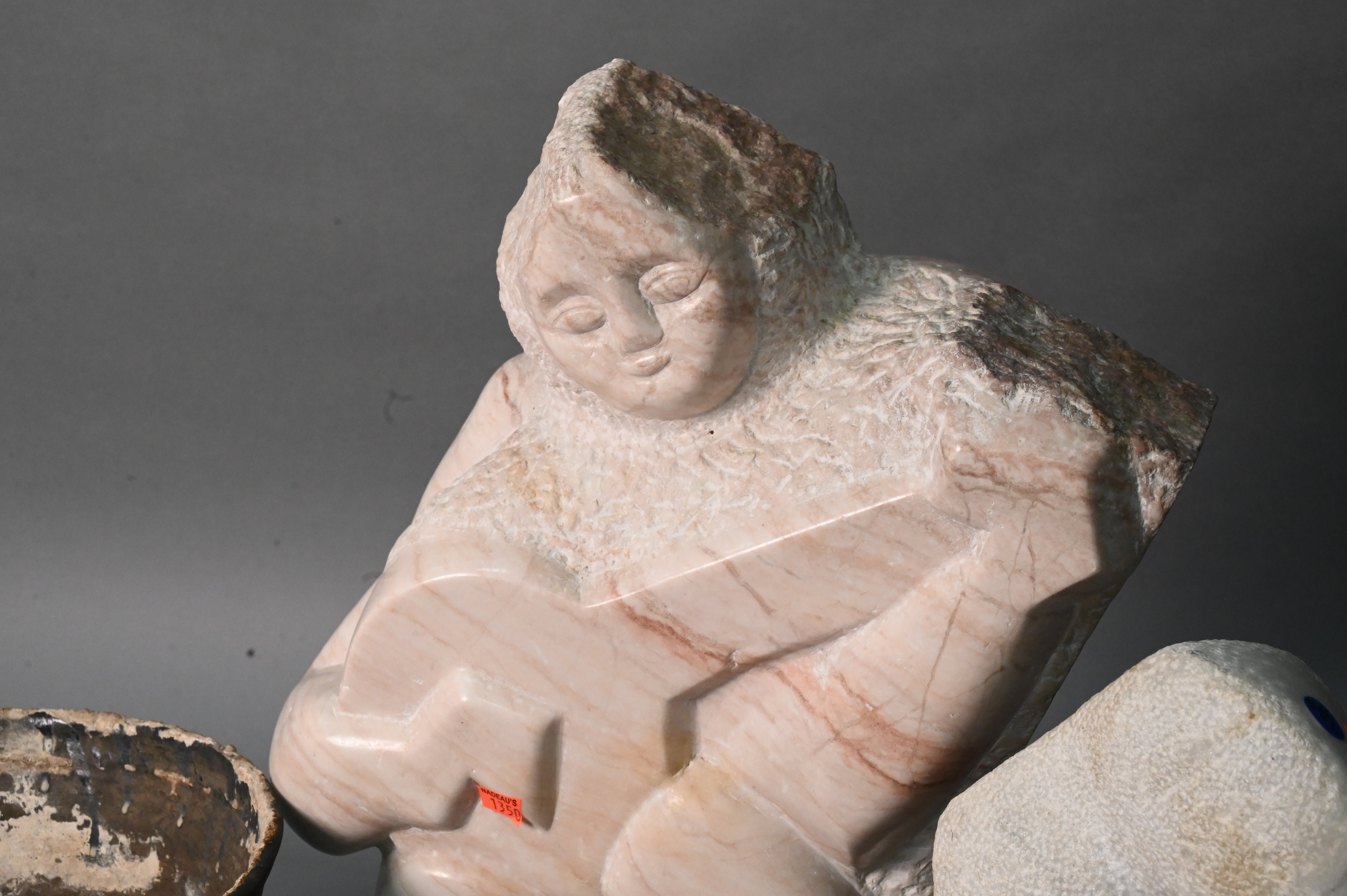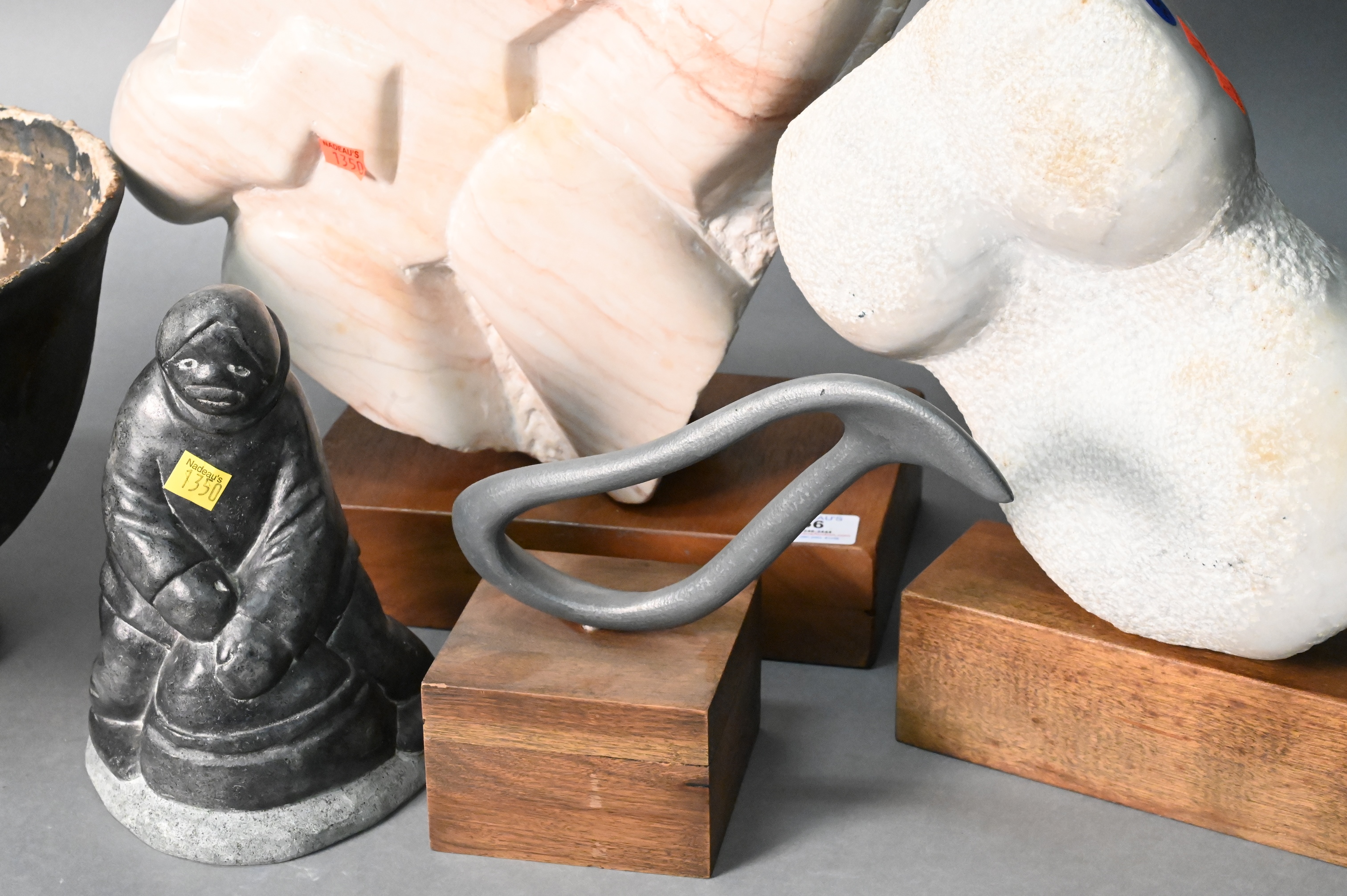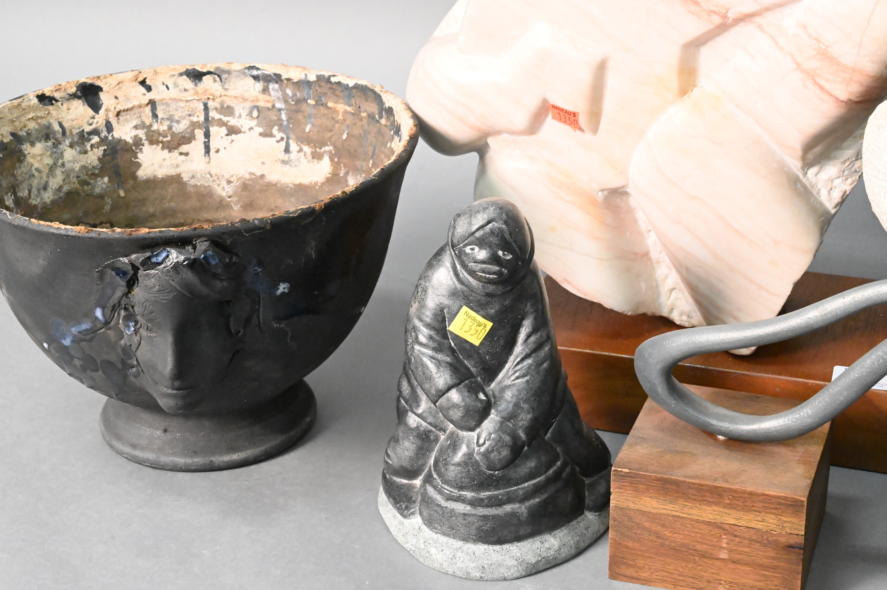 Five Piece Group, to include two carved marble sculptures signed A. Elow; a ceramic bowl with two face masks signed illegibly on bottom; along with a metal sculpture of an eskimo carving, tallest 20 inches. Provenance: Property from a private New York collection sold to benefit charitable foundations.