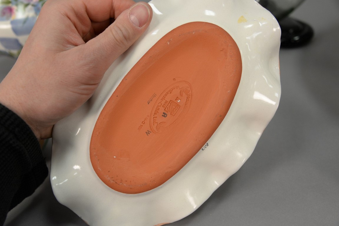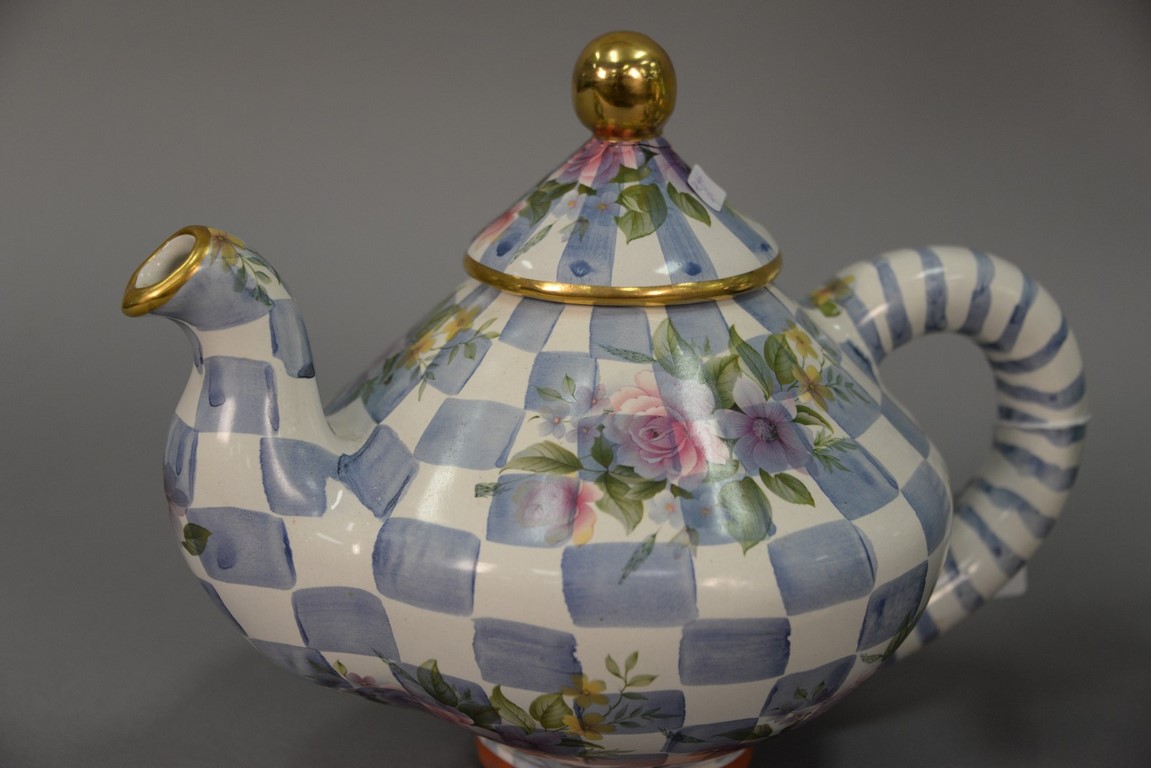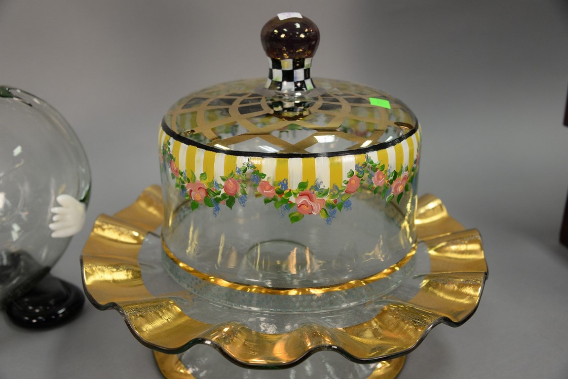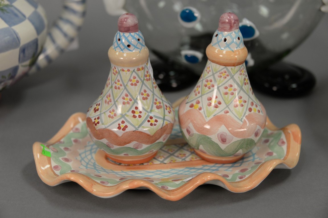 Lot 56: Four piece group Mackenzie Child’s group to include glass cake plate with dome, morning glory teapot, salt pepper and undlerplate, a…