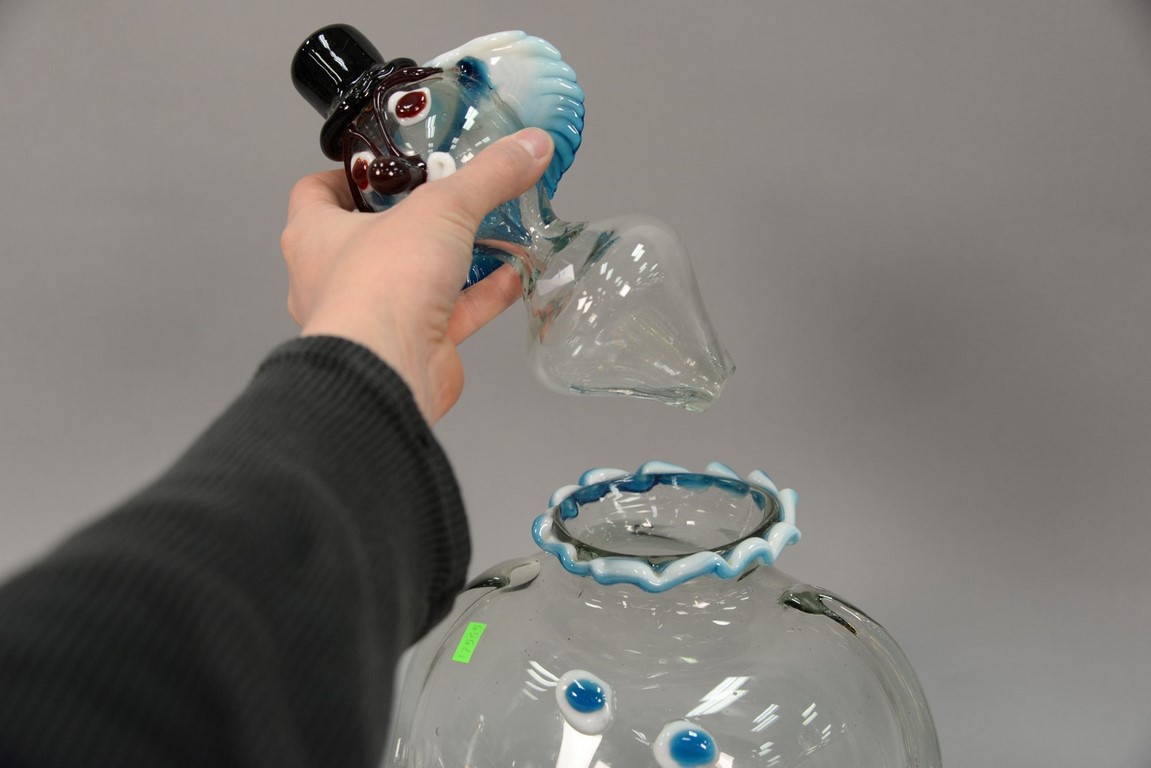 Four piece group Mackenzie Child’s group to include glass cake plate with dome, morning glory teapot, salt pepper and undlerplate, and a Murano glass clown punch bowl. clown: ht. 18 in., cake plate: dia. 14 in.