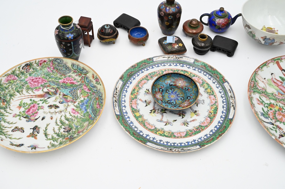 Lot 56: Group of Assorted Chinese, to include cloisonne vases and urns, Chinese porcelain cup with painted figures, Rose Medallion plate, and a Famille Rose plate (as is); largest diameter 9 1/2 inches.