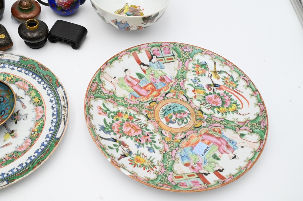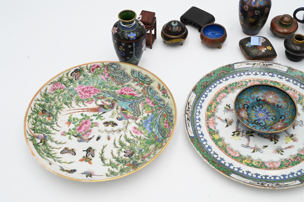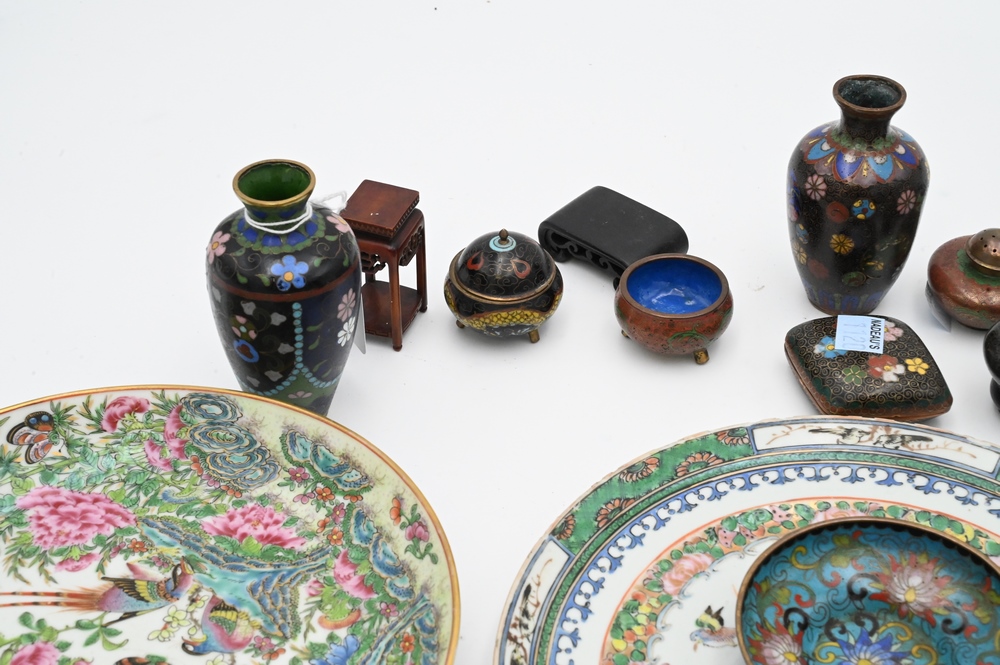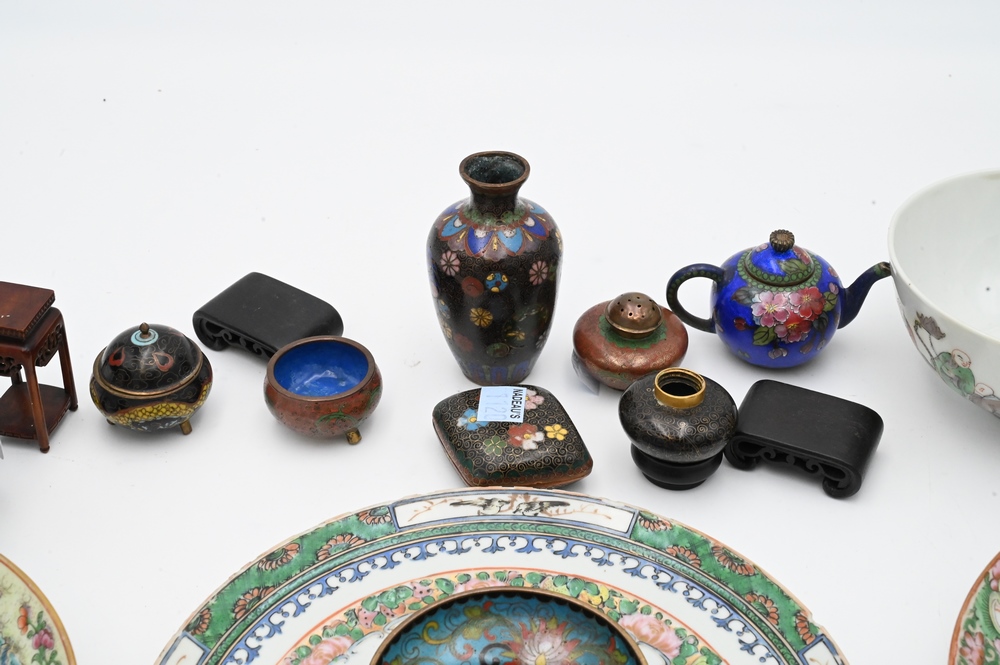Group of Assorted Chinese, to include cloisonne vases and urns, Chinese porcelain cup with painted figures, Rose Medallion plate, and a Famille Rose plate (as is); largest diameter 9 1/2 inches.