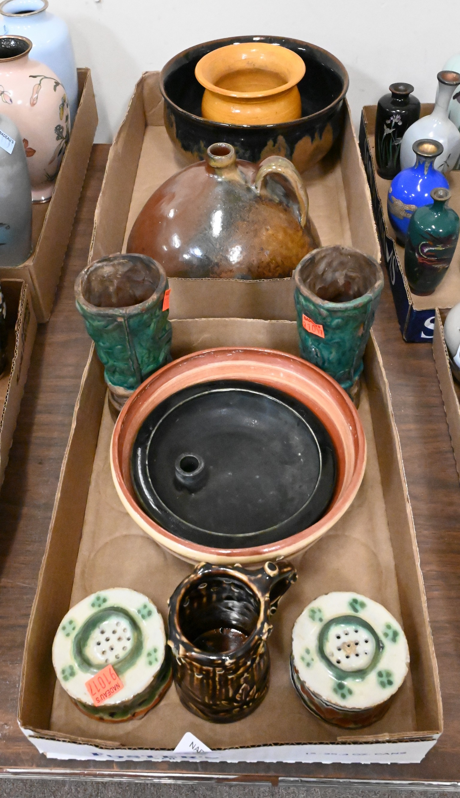 including bowls, cups, a small moonshine jug, and a handled tree form mug, in varied glazes ranging from earth-toned browns and blacks to green and cream with decorative surface treatments. Various makers; American studio pottery.
