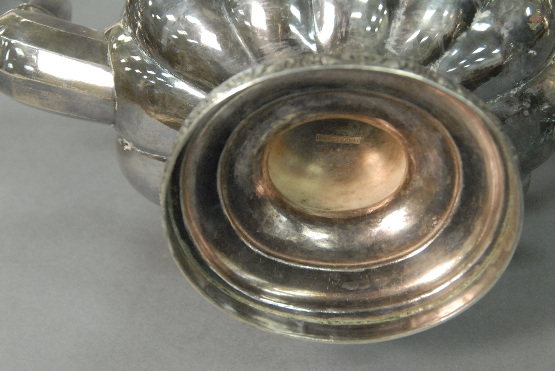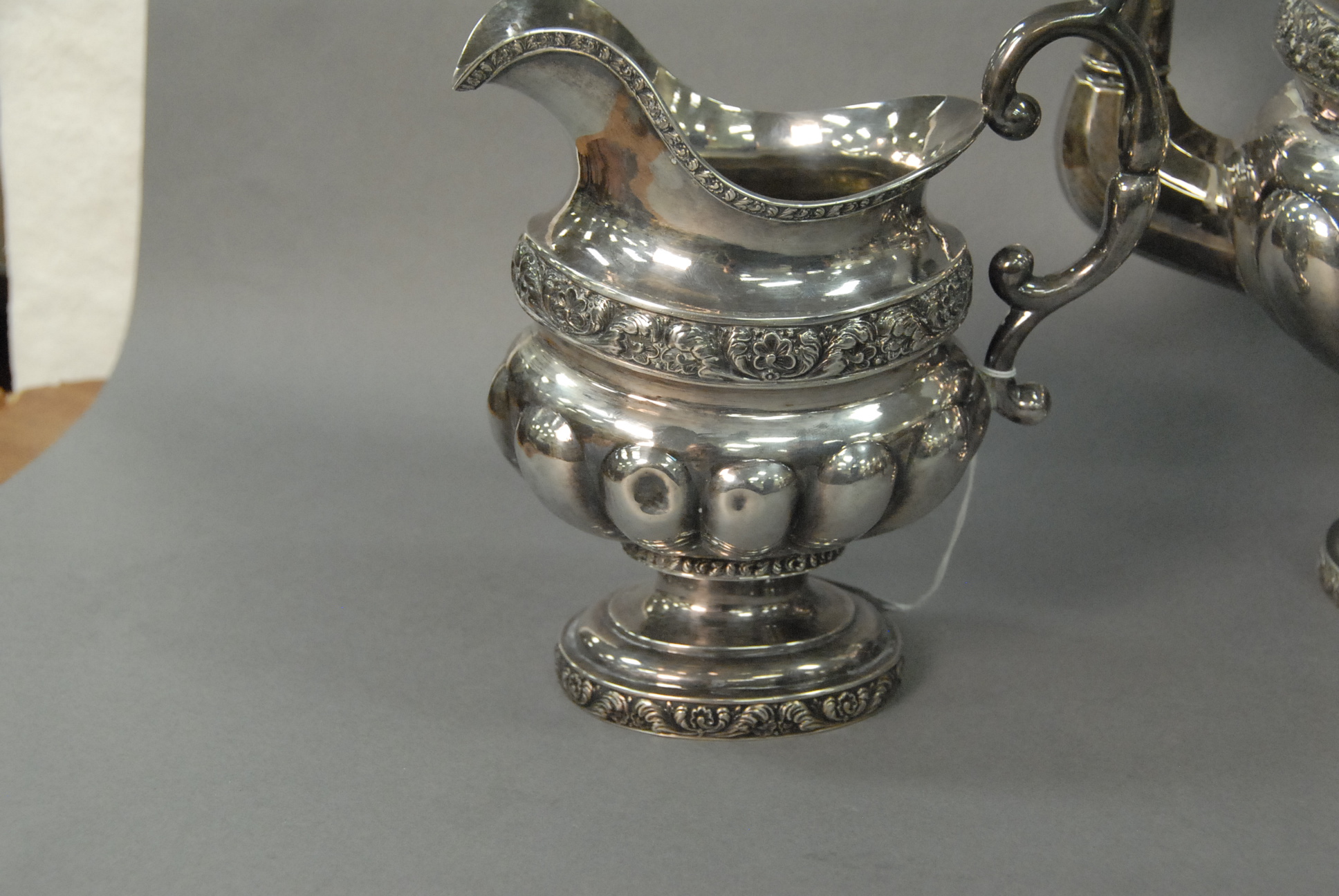 J. Crawford American coin silver three piece tea set with melon shaped bodies, marked J. Crawford, 19th century, 75 troy oz.